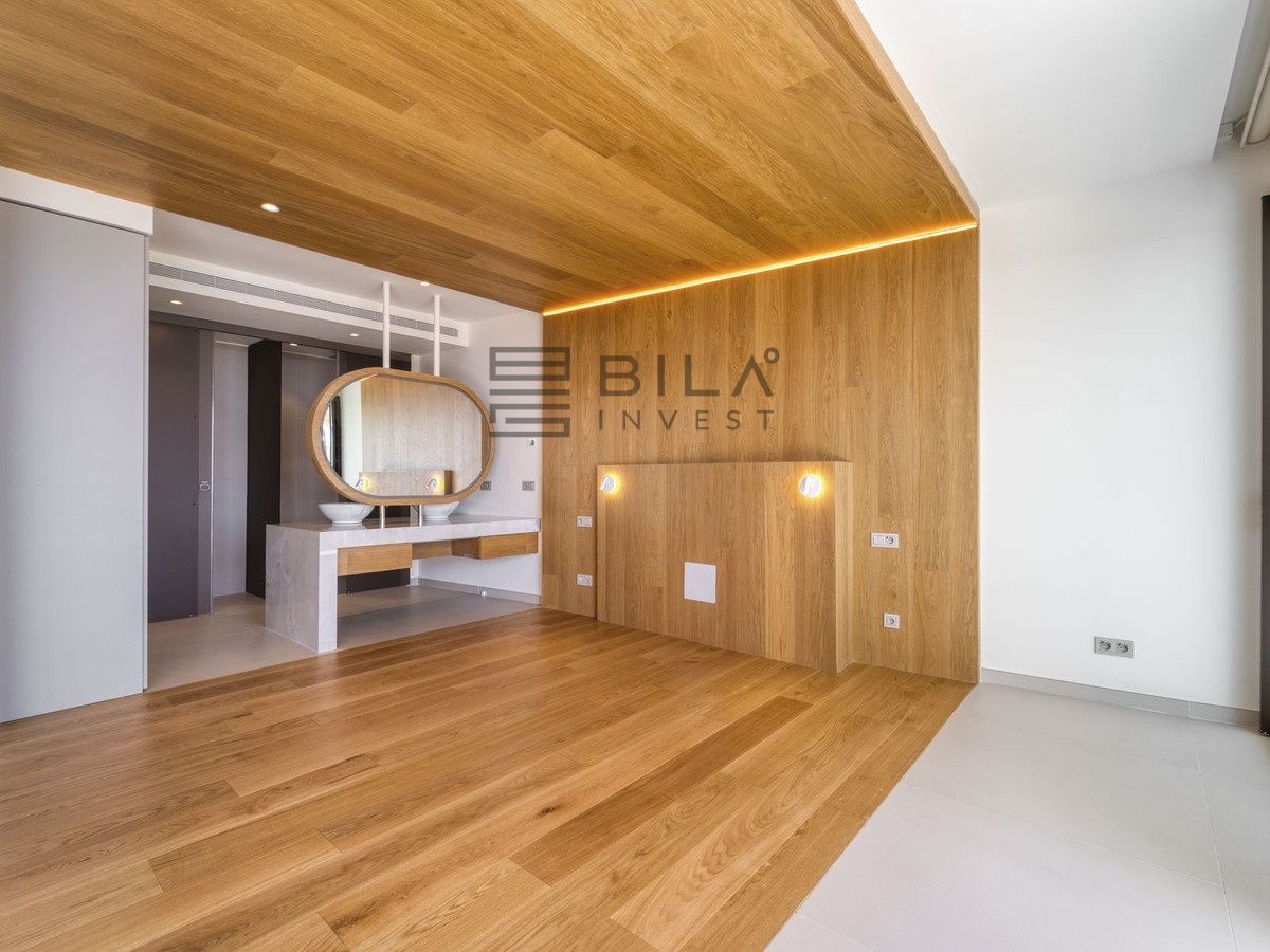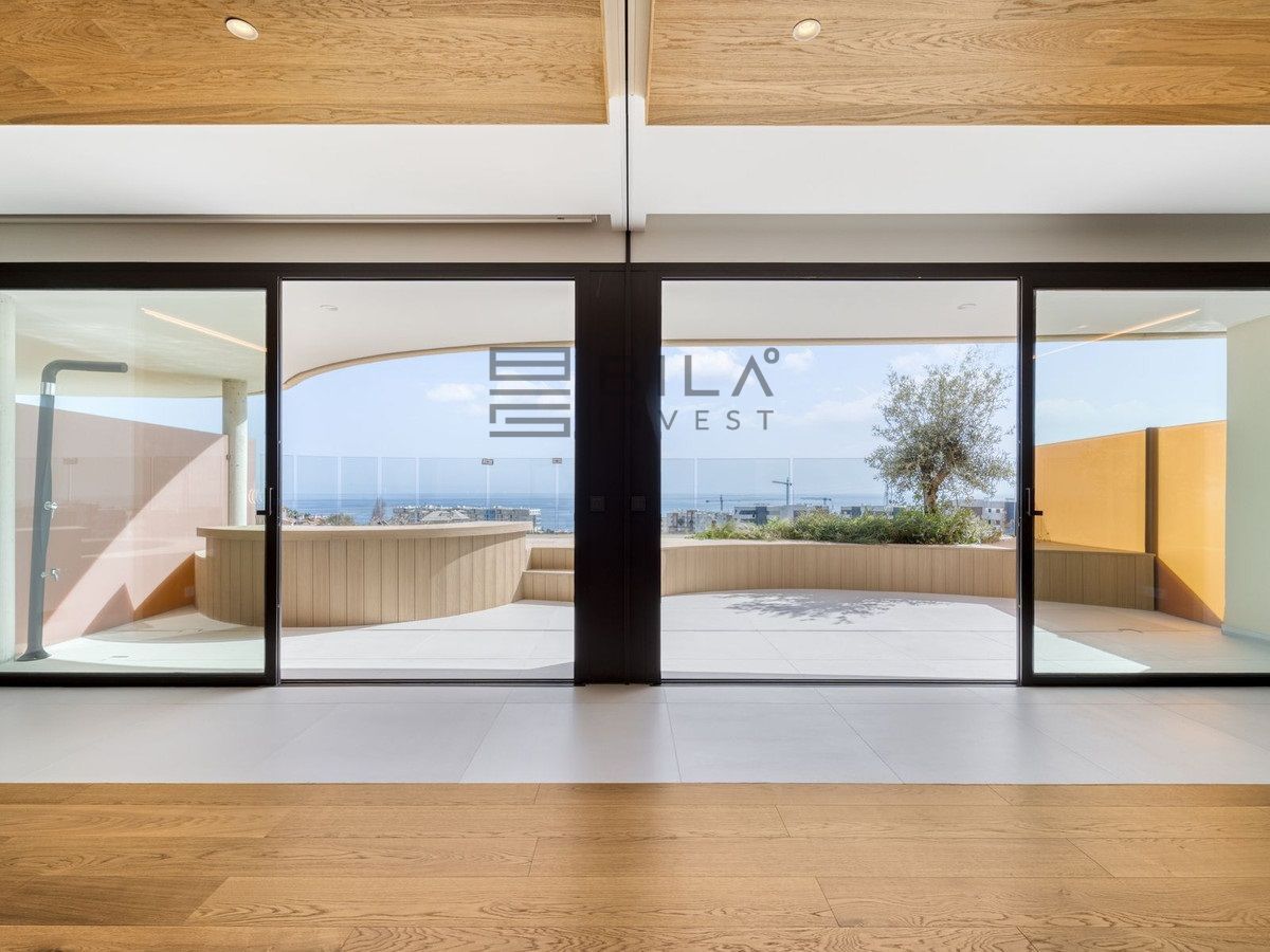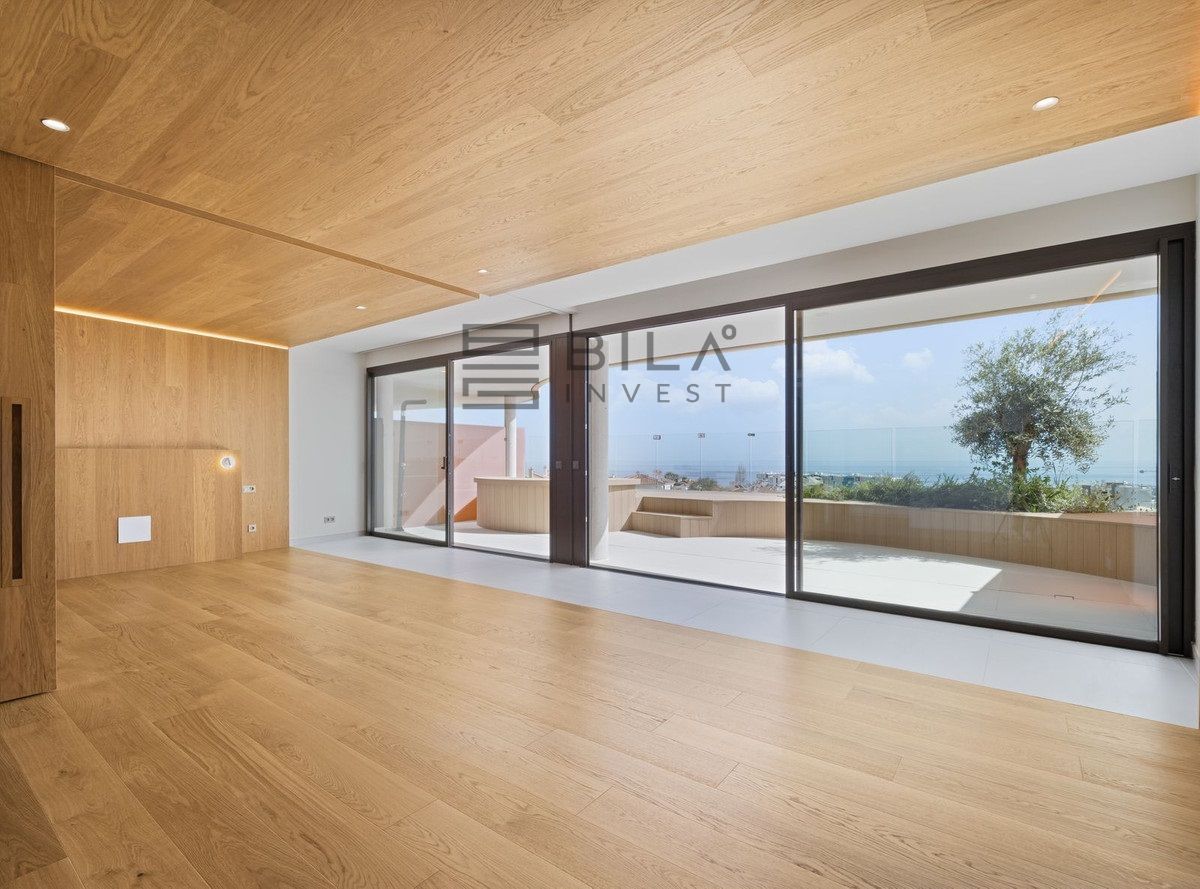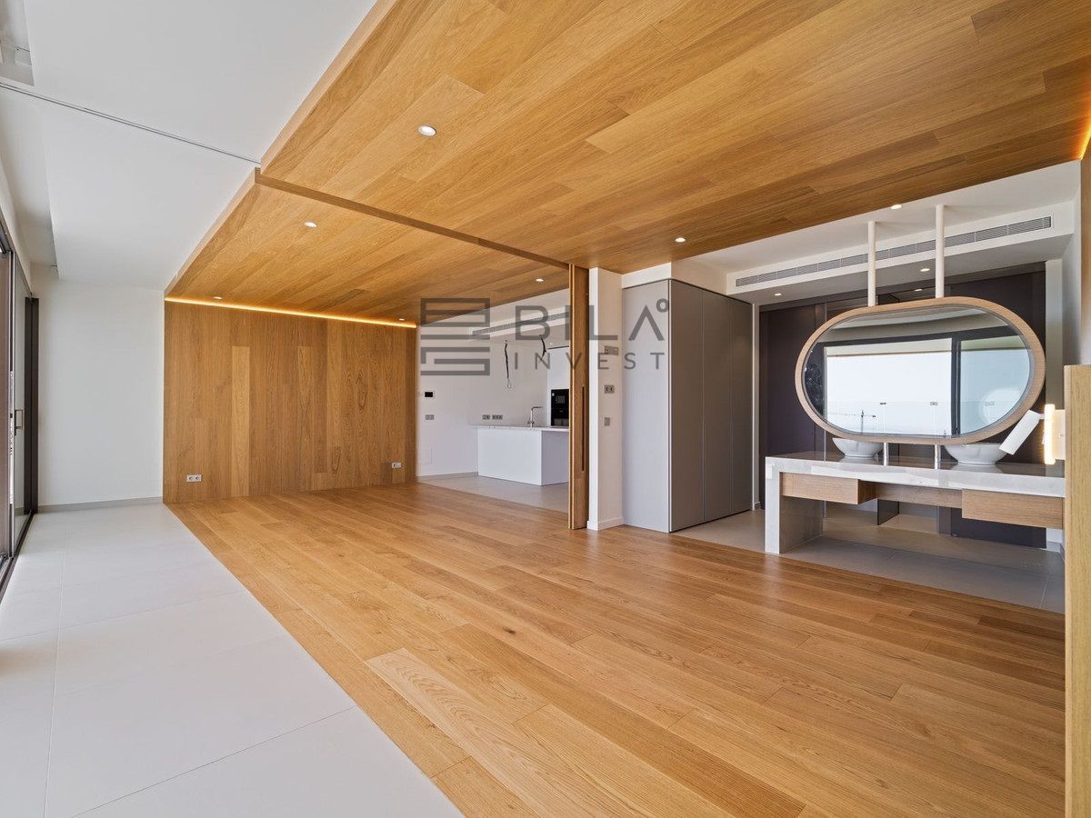 Thanks to its south-facing orientation, the property enjoys abundant natural light throughout the day and offers beautiful sea views from the living room and terrace. The interior combines contemporary design and warm, high-quality finishes, with an open-plan, functional layout that maximises space and light thanks to its floor-to-ceiling windows.