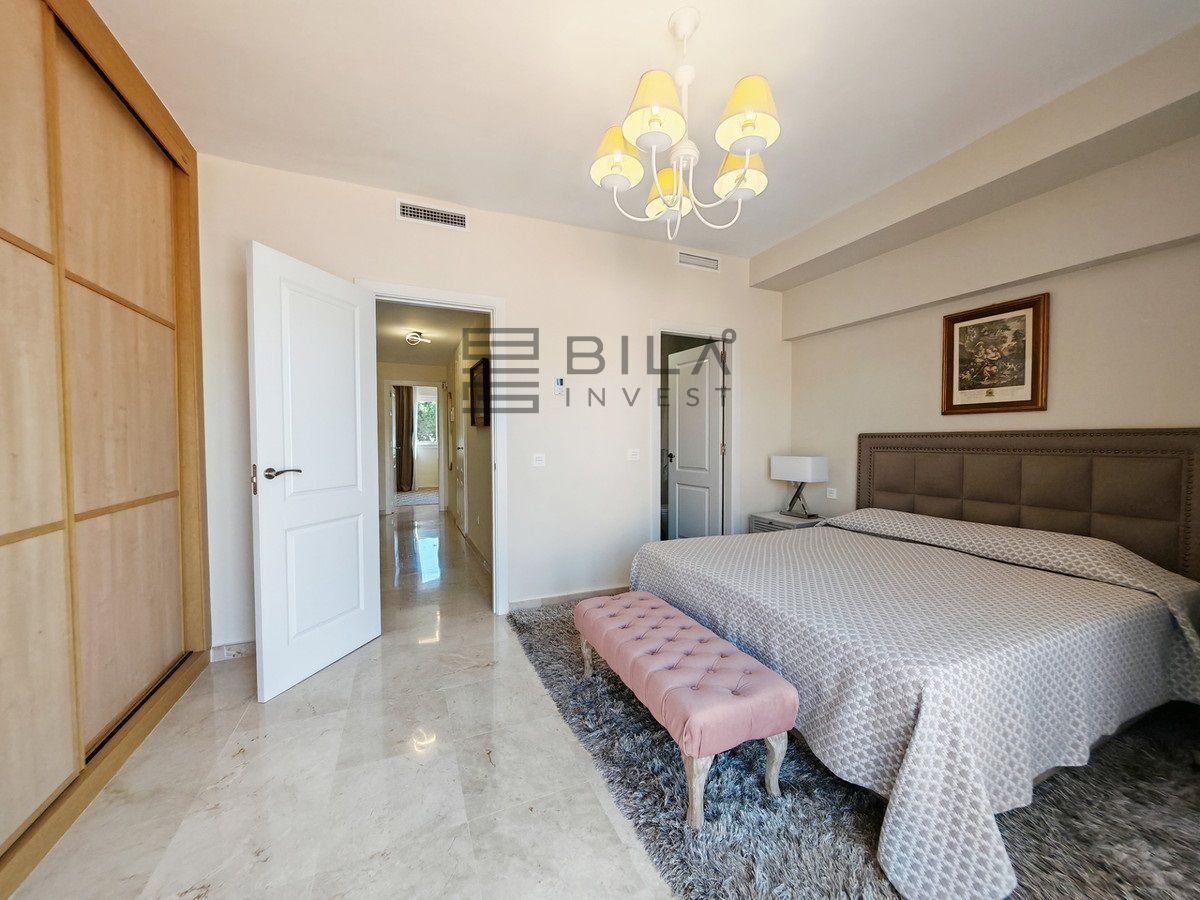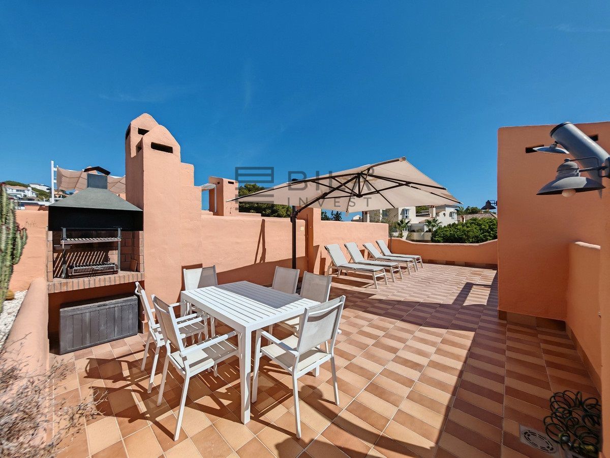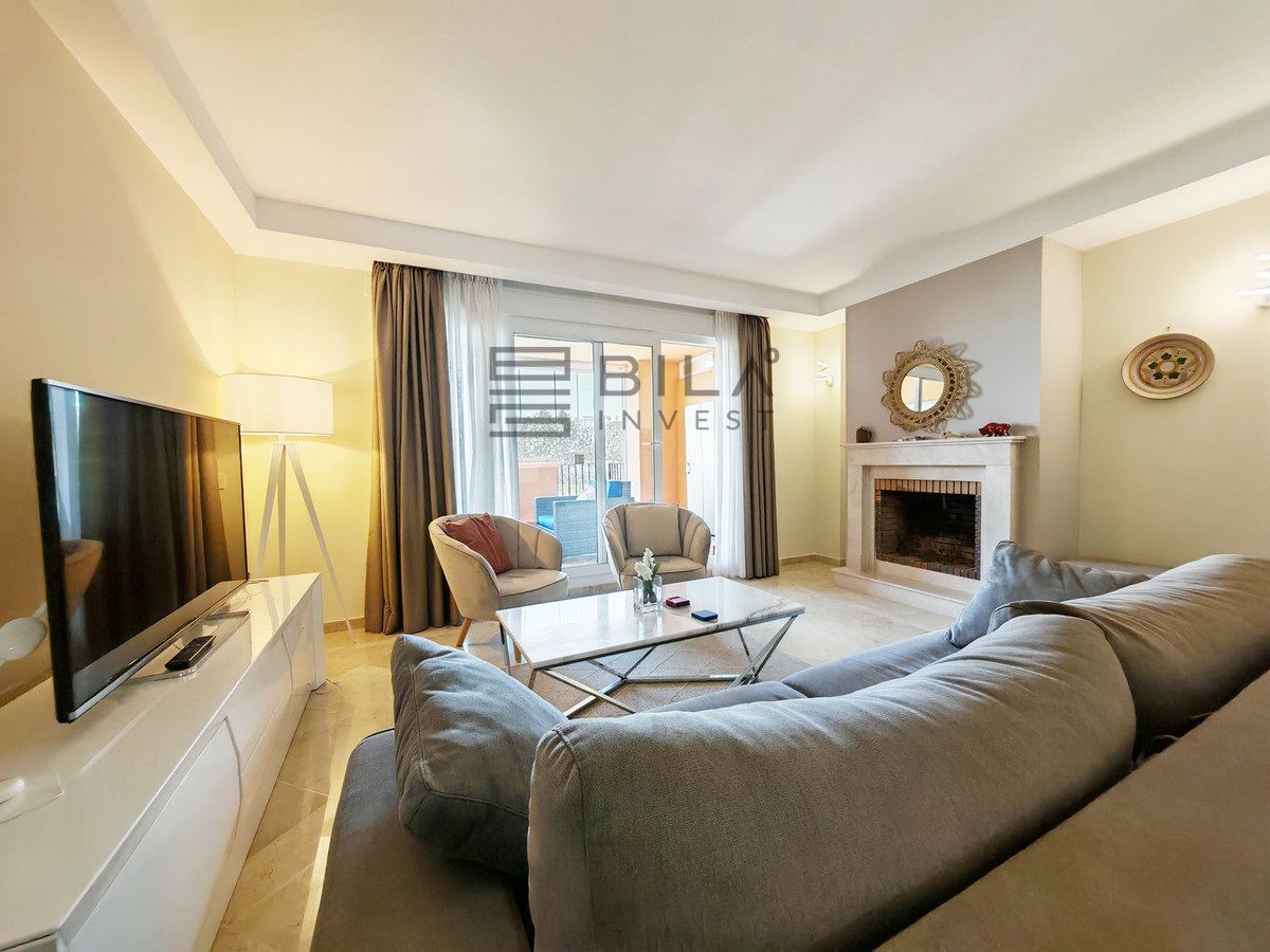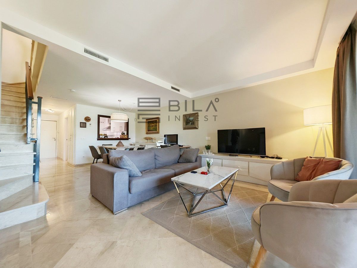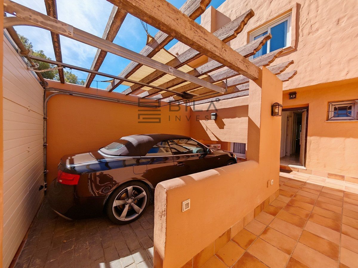 Town House for sale in Cabopino, Marbella with 3 bedrooms, 2 bathrooms, 2 en suite bathrooms, 1 toilet and with orientation south, with communal swimming pool, private garage and private garden. Regarding property dimensions, it has 304.22 m² built and 135.56 m² plot. Has the following facilities front line golf, transport near, air conditioning, fully fitted kitchen, fireplace, marble floors, satellite tv, basement, alarm, solarium, security entrance, double glazing, video entrance, barbecue, telephone, guest toilet, private terrace, living room, sea view, golf view, smart home system, internet - wi-fi, covered terrace, electric blinds, fitted wardrobes, garden view, pool view, panoramic view, street view, close to sea / beach, close to golf, uncovered terrace, glass doors, optional furniture, excellent condition, recently renovated / refurbished, ceiling cooling system, saltwater swimming pool, close to shops, close to port, surveillance cameras and pets allowed.