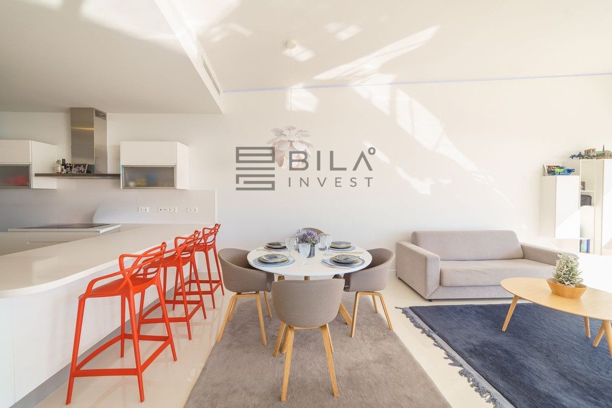 The floor plan allows you to enjoy the sea view right from the bed when you wake up and it is just as captivating when you are standing and cooking or sitting and eating. It is not made worse by the magnificent southern orientation with wonderful sun position. In addition, there is no risk of new construction in front of the apartment as the area is already built up with beautiful lower houses in the Spanish style.