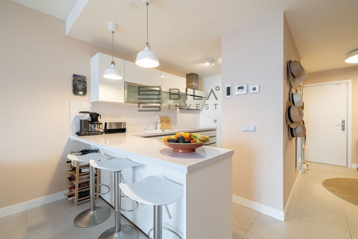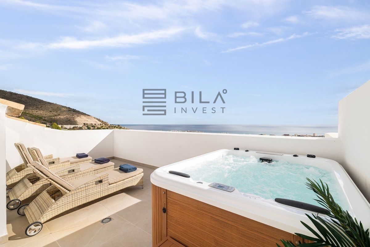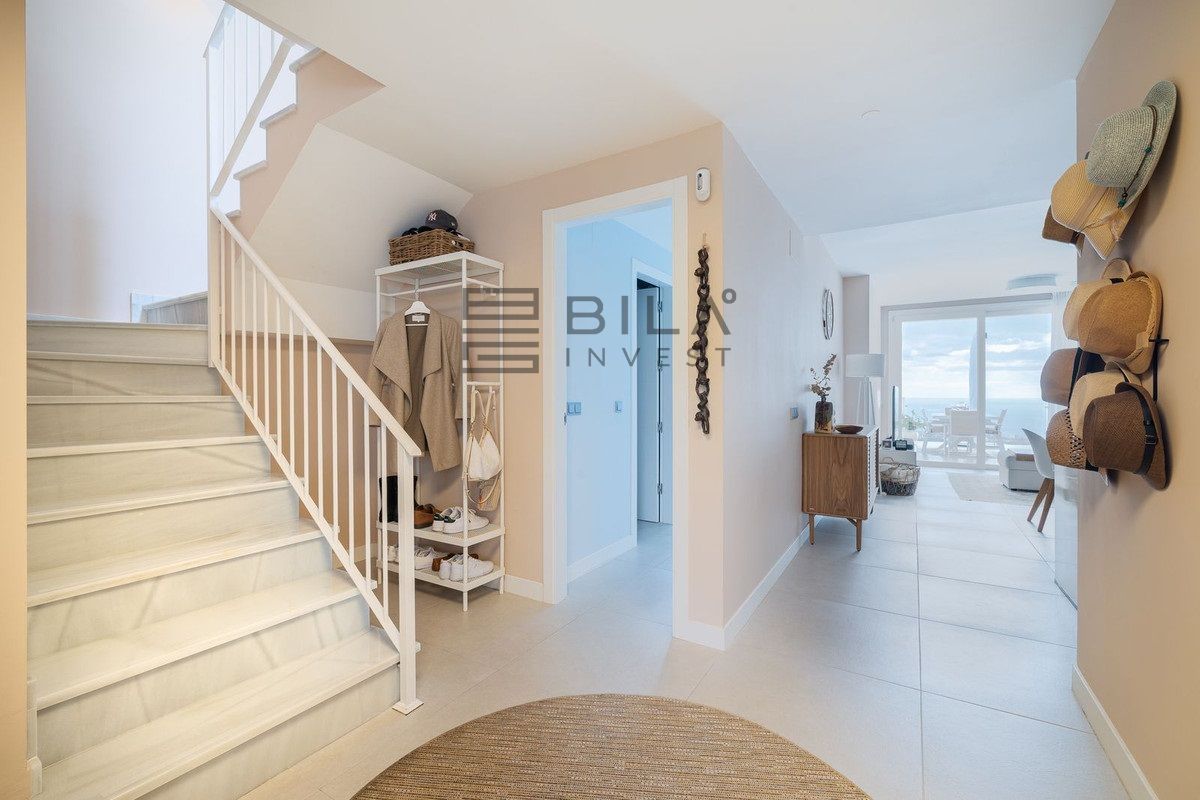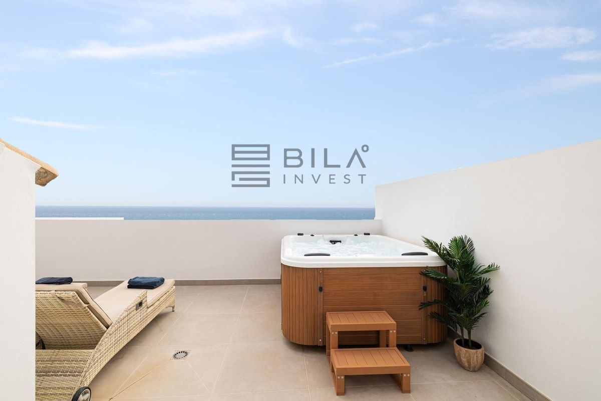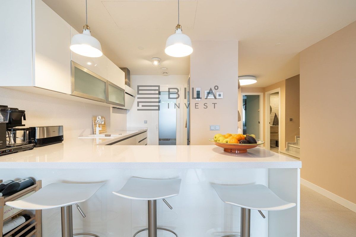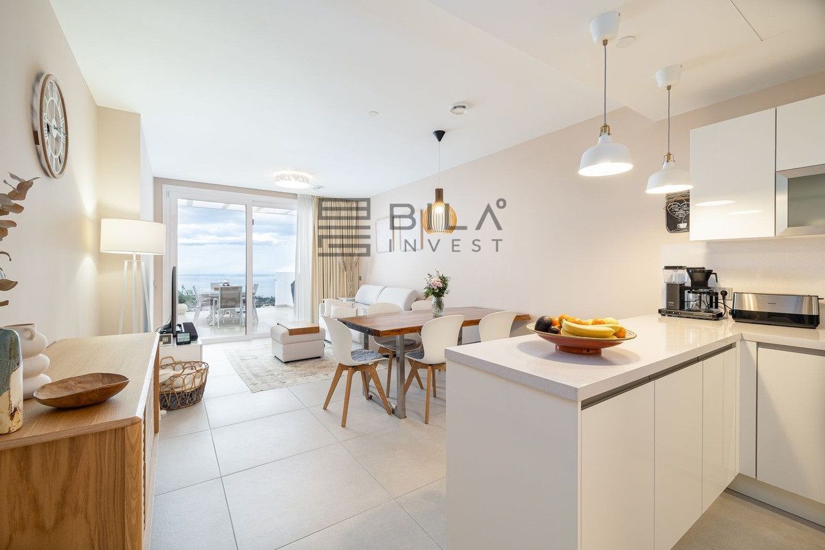 The apartment is distributed over two levels and comprises three spacious bedrooms and three well-appointed bathrooms. All bedrooms include integrated wardrobes. The lower level features an open-concept living area and a highly functional kitchen, allowing you to prepare meals while overlooking the sea. A practical utility room is located discreetly at the rear of the kitchen. The home's convenience is further enhanced by a comprehensive water purification system that protects the lifespan of the appliances, complemented by an additional filtration system for pure drinking water.