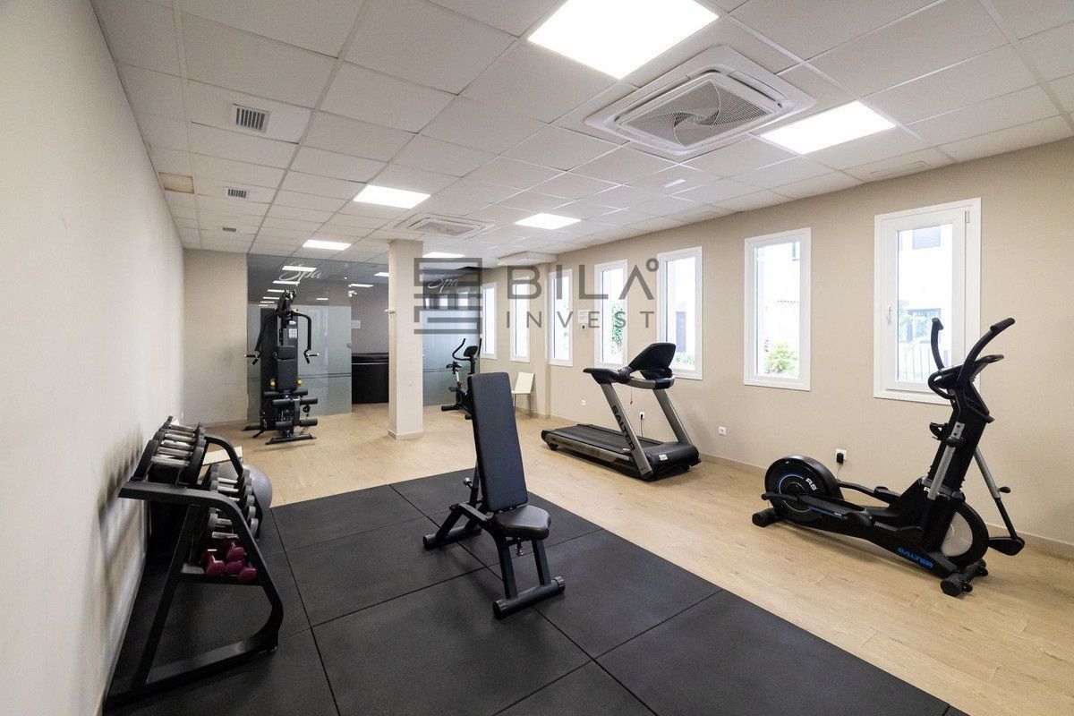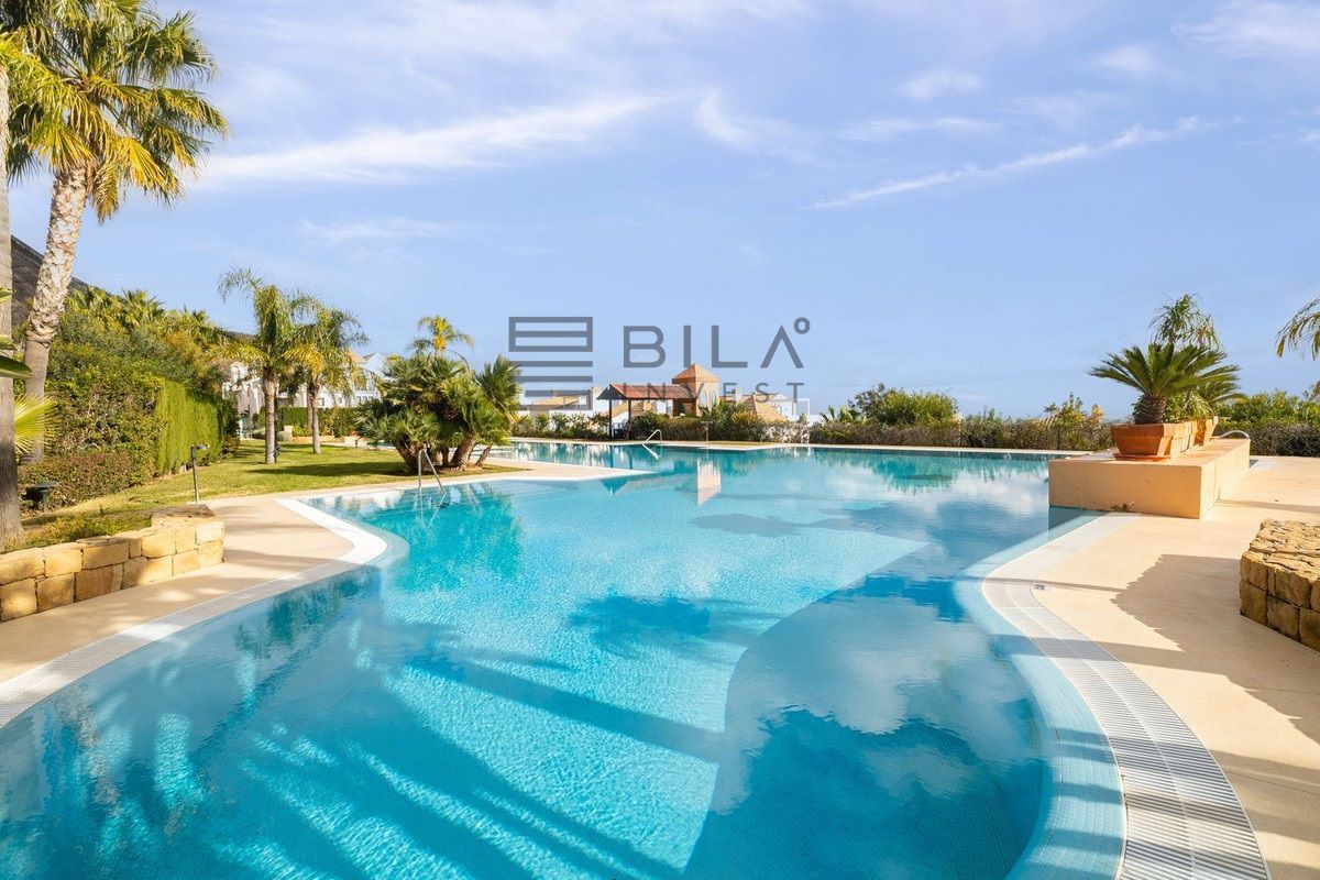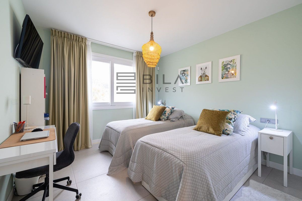 The property includes two private garage spaces and a large, split-level storage unit, providing significant added value. Residents also enjoy access to the community's expansive swimming pool, private padel court, and gym. This is a truly complete residence where every detail has been considered.