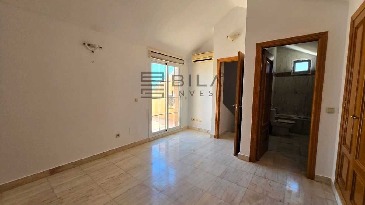The upper level contains three large double bedrooms, each equipped with ample fitted wardrobes. The master bedroom has a private terrace and an en-suite bathroom. The second bedroom also features a terrace, and the third bedroom is generously proportioned. A family bathroom completes this floor.