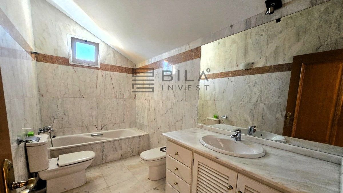 The next floor comprises a well-sized kitchen with utility area, guest WC, additional storage, and an open-plan living and dining space. Adjacent is a sizable terrace overlooking the pool and gardens. At the entrance, there is a large terrace that receives afternoon sunlight.
