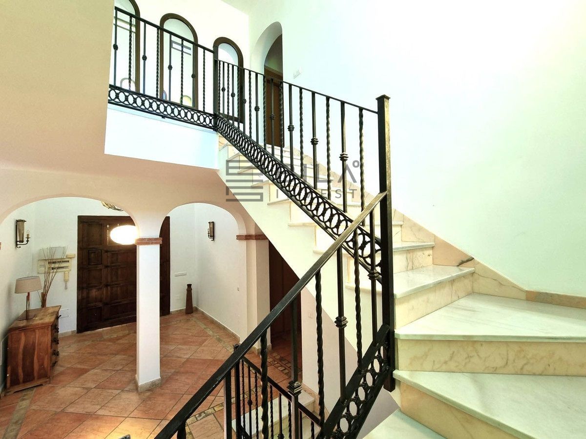 Electric gate and stairs down, also a slopping drive with electric gate. No obstructed views to the front over sweeping nature countryside. (Green land). Mature gardens with several Palm trees in various areas with another raised terrace and seating area that sweeps around the house to the driveway.