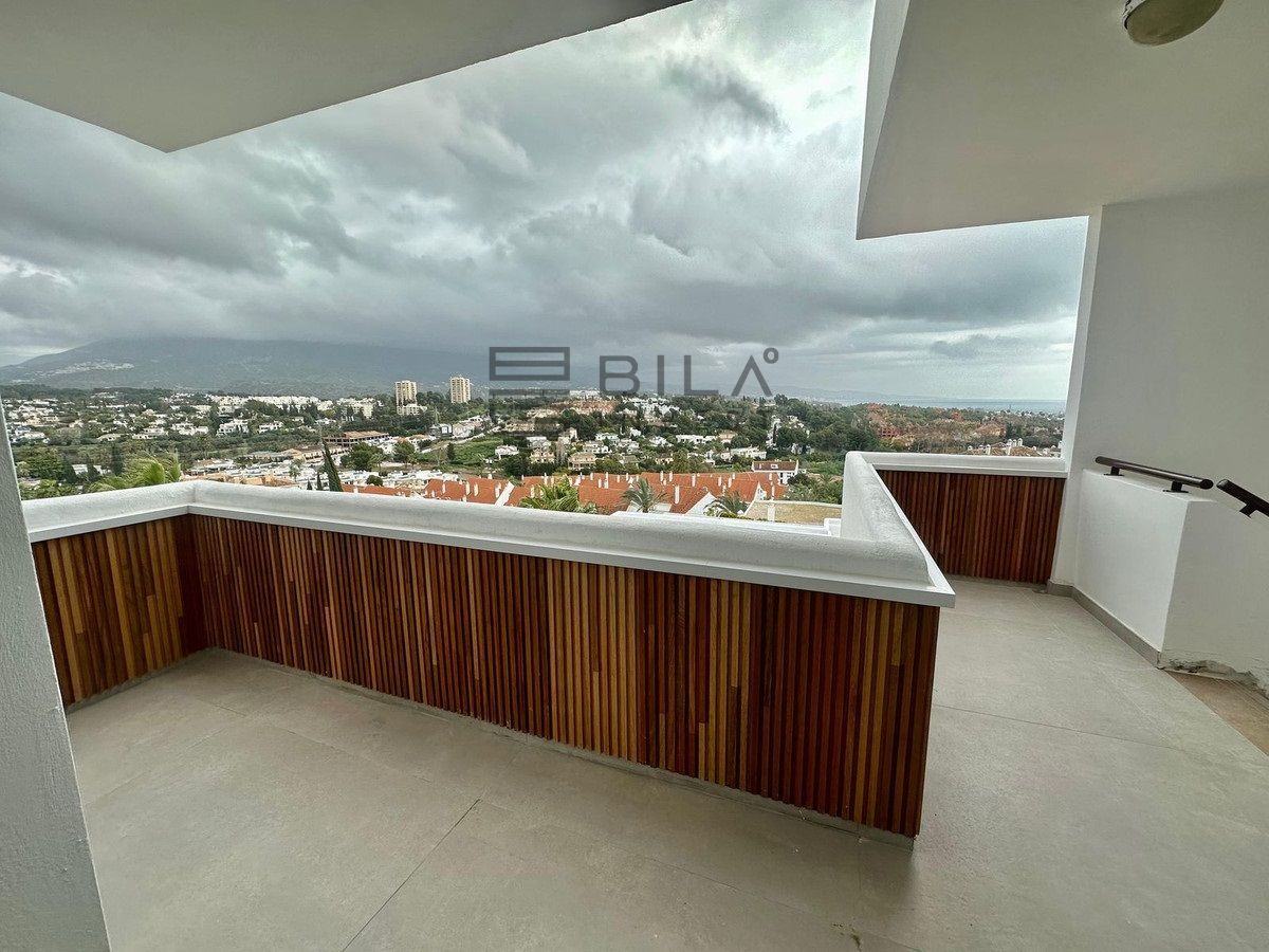 Elegance, Comfort, and Panoramic Views Experience an exclusive lifestyle in this stunning fully renovated 2024 penthouse, nestled in the prestigious Jardines de Nueva Andalucía. Boasting a sleek modern design and high-end finishes, this 2-bedroom, 2-bathroom property offers 100 m² of sophistication and comfort, complemented by a spectacular 13 m² private terrace with breathtaking views of La Concha, the surrounding golf courses and sea views. The open-plan layout enhances natural light and spaciousness, creating a refined yet inviting ambience. Sunlight floods every corner, highlighting contemporary details, elegant ceramic flooring, and a thoughtfully designed interior for maximum comfort. Key Features: ✔ Fully renovated in 2024, featuring a modern style with top-quality materials. ✔ 13 m² private terrace, perfect for sunlit breakfasts or dining under the stars. ✔ Private lift access, ensuring maximum convenience and privacy. ✔ Communal pool and landscaped gardens, offering a peaceful retreat in Nueva Andalucía. ✔ Prime location, just minutes from fine dining, boutique shopping, and the glamorous Puerto Banús. An ideal home, whether for year-round living or a luxurious getaway in Marbella.