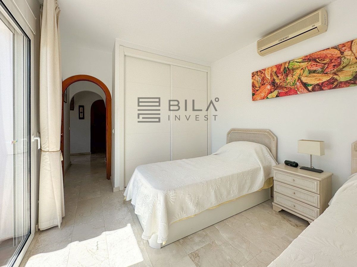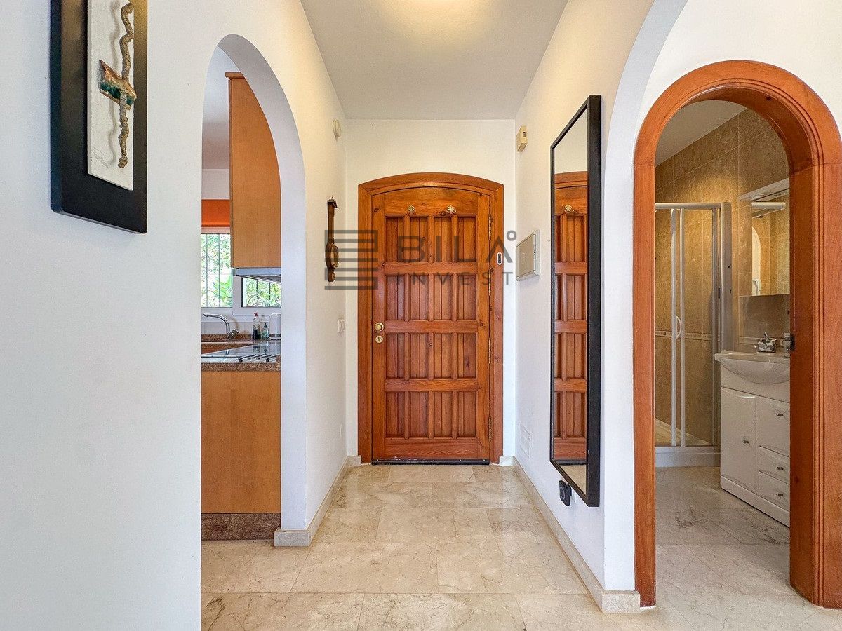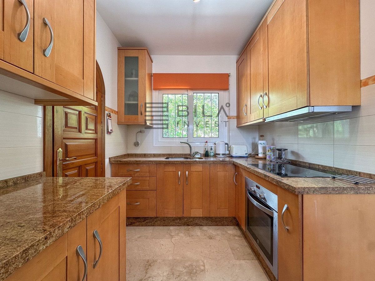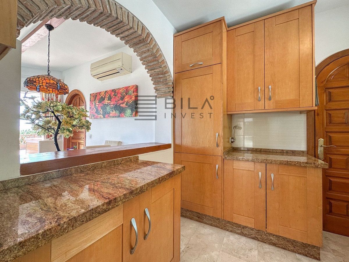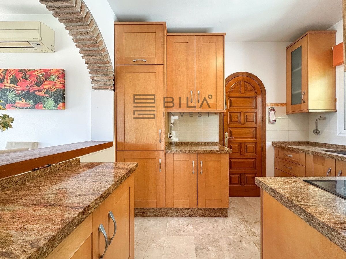 Step through beautiful wooden doors and into the heart of the home. The spacious living and dining area is filled with amazing natural light and boasts incredible wooden beams that enhance the authentic Spanish atmosphere. Double doors open directly onto the expansive terrace, seamlessly blending indoor and outdoor living. For cooler evenings, a fireplace adds a touch of warmth and coziness. The functional kitchen features an open bar, connecting effortlessly to this inviting living space, perfect for entertaining and everyday life.