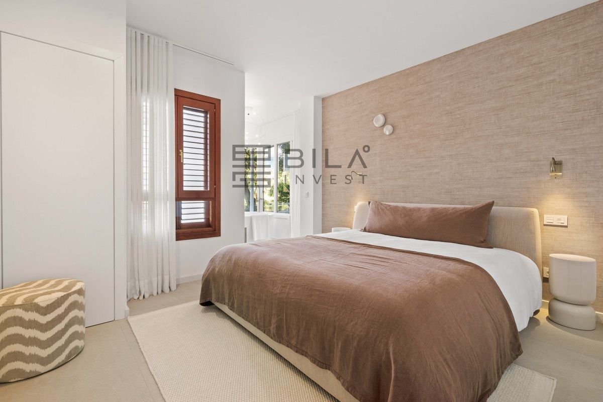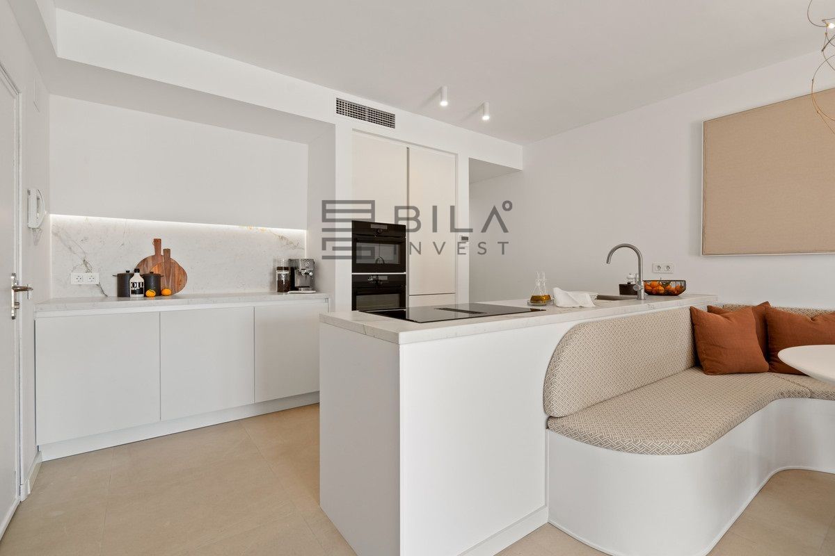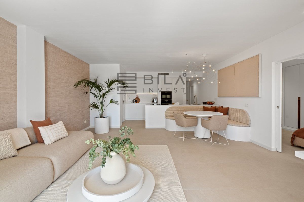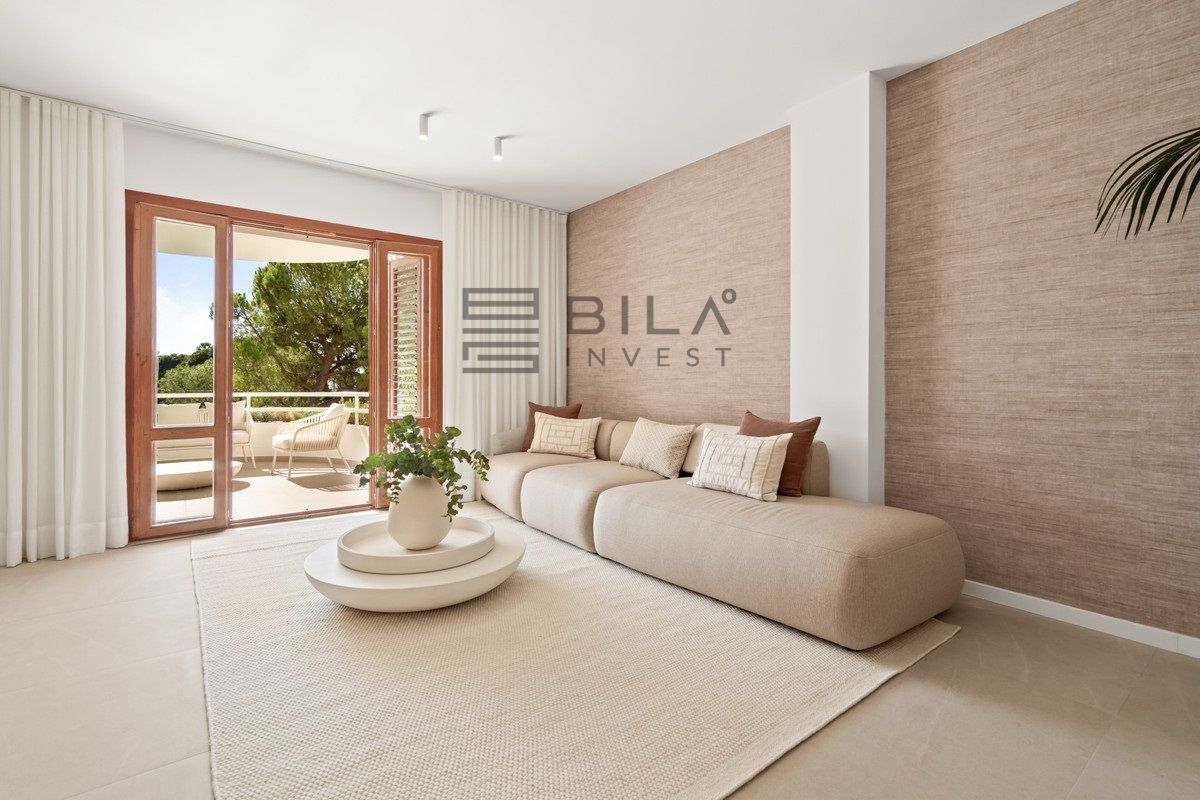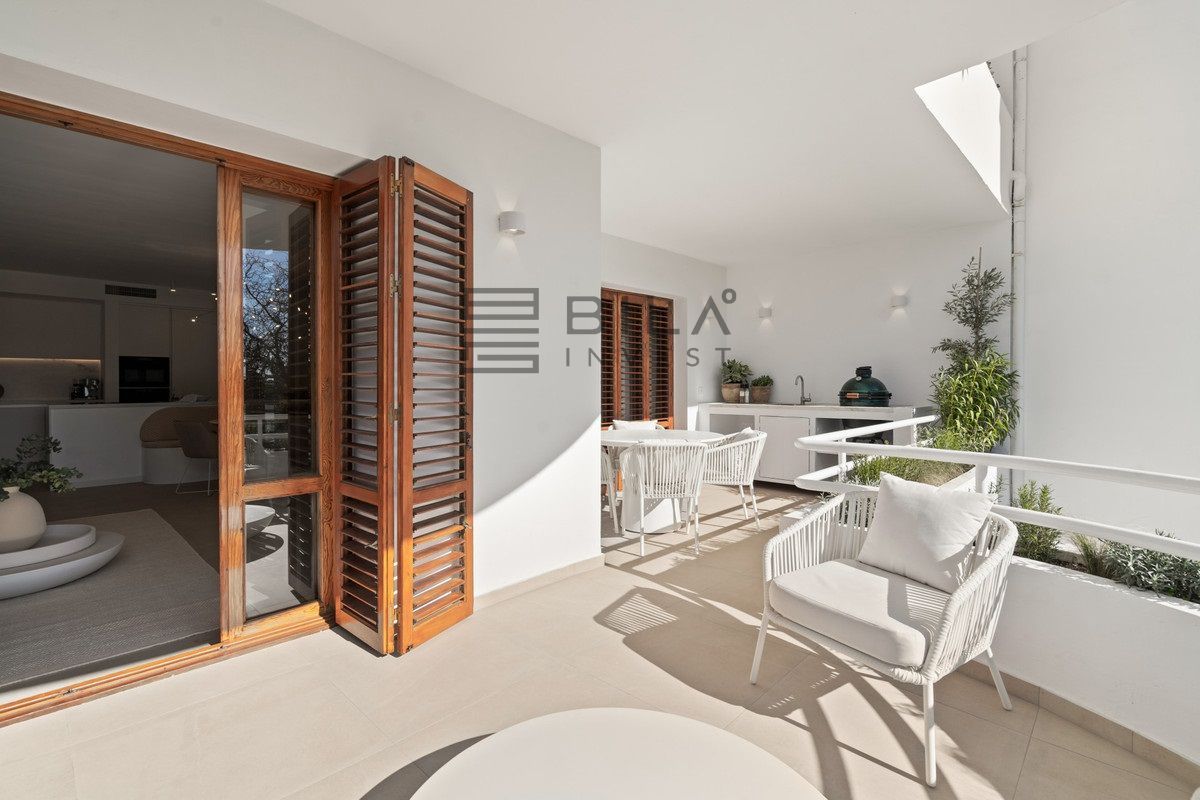 This renovated apartment is located in Alcores del Golf, a south-facing property with plenty of natural light and a clean, minimalistic design. The open-plan layout connects the living area with a modern kitchen, and the large terrace features a barbecue, dining area, and a relaxing outdoor space with views of the greenery.