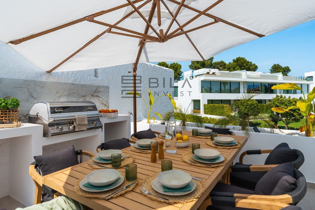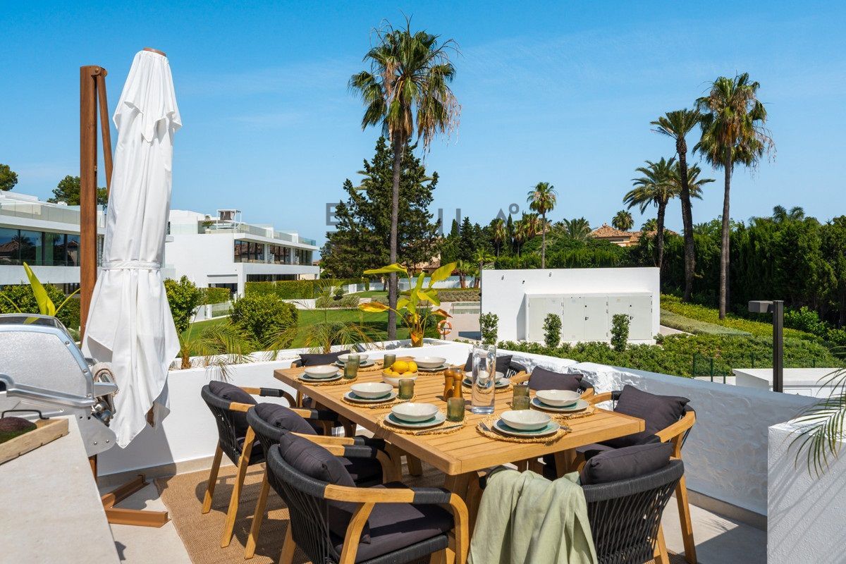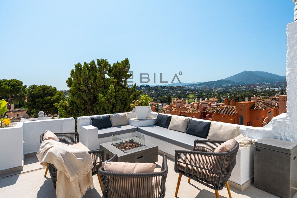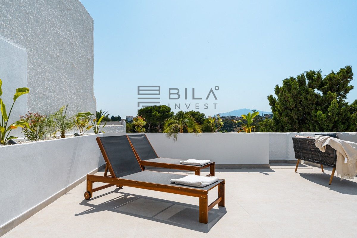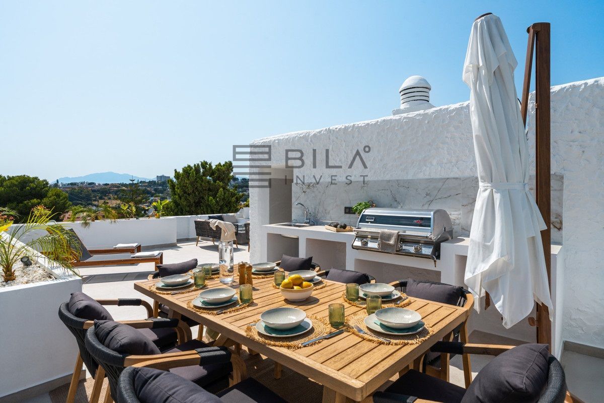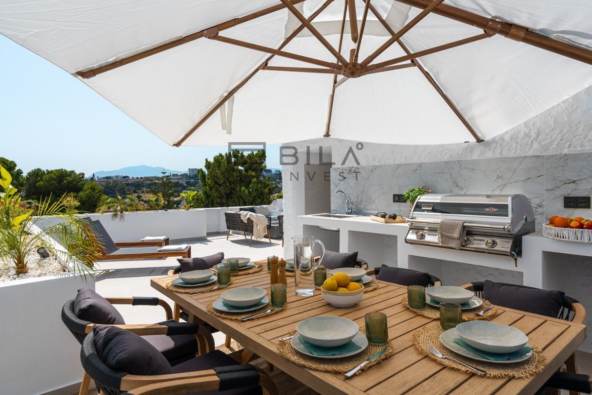 Penthouse La Arabesque offers a sophisticated take on contemporary living in the secure and stylish enclave of Atalaya de Río Verde, one of Nueva Andalucía's most refined residential areas. This luxurious duplex penthouse for sale spans two spacious floors and presents a layout of three generous bedrooms and two sleek, modern bathrooms. With a built area of 172 square meters, it combines interior comfort with extensive outdoor living options, all designed to take full advantage of its privileged setting.