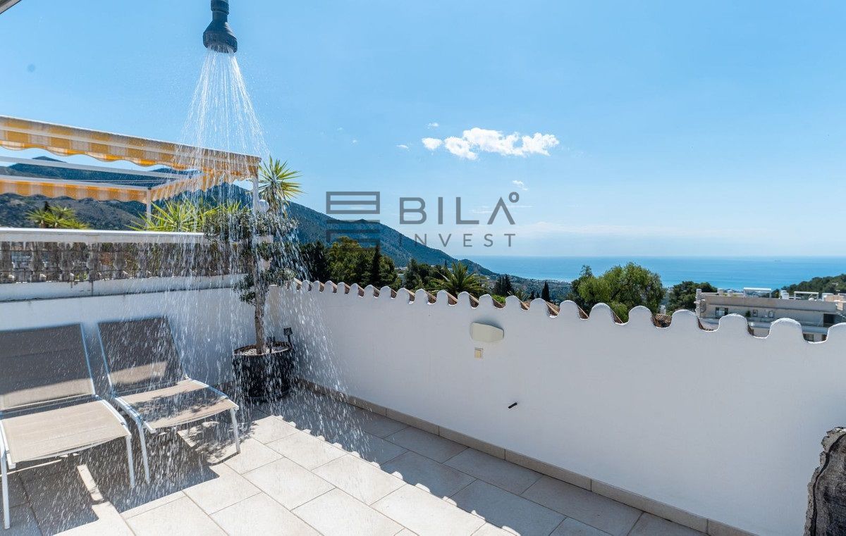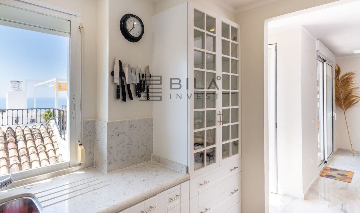 The apartment features a welcoming entrance hall, a spacious and bright living room with a guest toilet, storage room, and a stylish kitchen. From the living room, you have direct access to a fantastically spacious terrace, divided into several inviting zones: a lounge area, outdoor kitchen, open-air shower – and space to install a jacuzzi. The entire terrace offers **spectacular panoramic sea views**, perfectly completing the experience of authentic southern Spanish living.