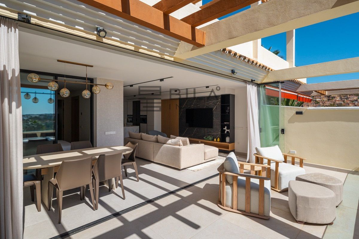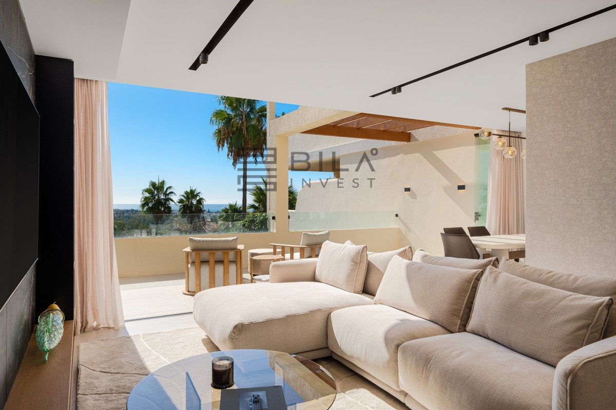 Apartment Jasmine is a beautifully renovated three-bedroom apartment for sale in the exclusive Palacetes Los Belvederes, an established residential community in Nueva Andalucía. Originally built in 2003 and fully modernised in 2024, this southeast-facing property offers 170 m² of carefully designed space, including 146 m² of elegant interiors and a 24 m² private terrace with panoramic views of La Concha mountain, the Mediterranean Sea, and a peaceful lake.