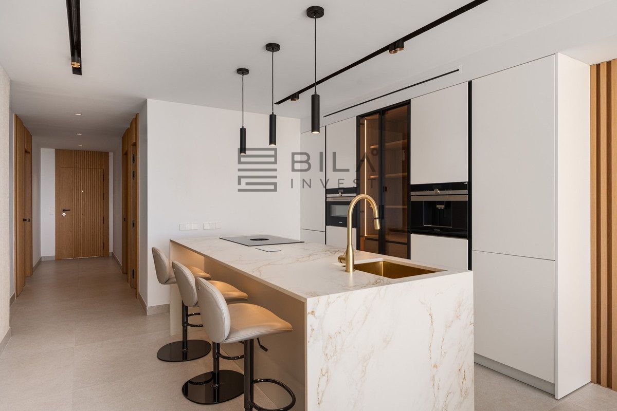 Inside, the apartment has been designed for both style and functionality. The three spacious bedrooms provide privacy and comfort, with two featuring en-suite bathrooms, complemented by an additional bathroom and guest toilet. Large windows ensure every room is filled with natural light, enhancing the modern décor. Furniture is by Natuzzi, and Cavalli wallpaper adds a touch of designer sophistication. The open-plan kitchen, fitted with Siemens appliances, flows seamlessly into the living and dining area, creating a space ideal for family life and entertaining. A smart home system enhances everyday convenience and control. Direct elevator access to the apartment adds exclusivity, while ample storage solutions keep the interiors uncluttered and practical.