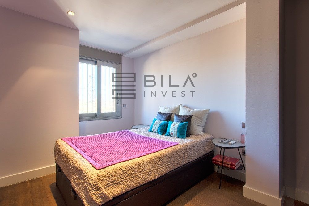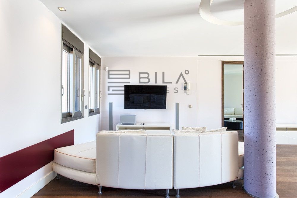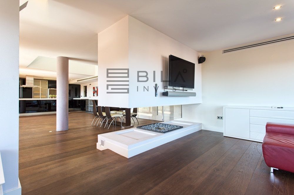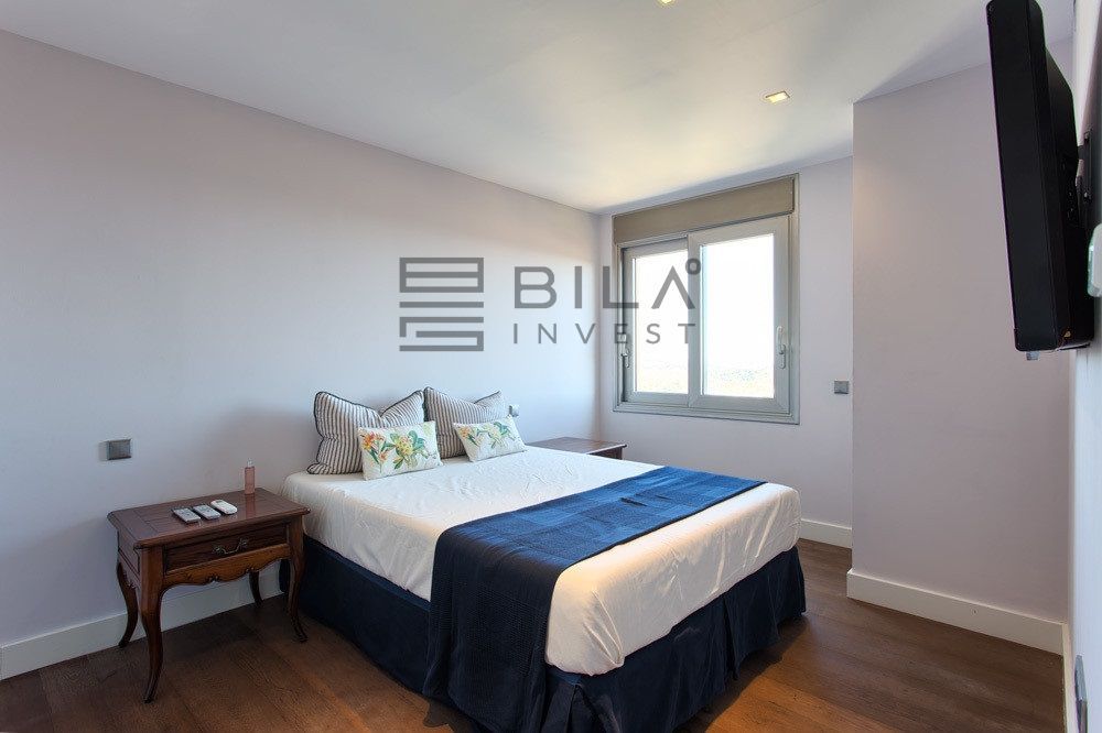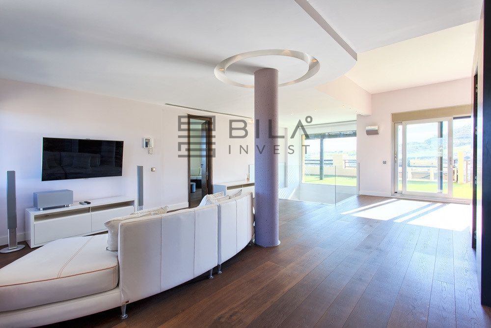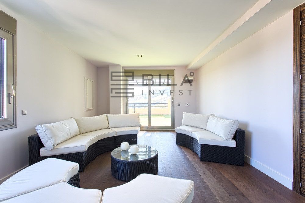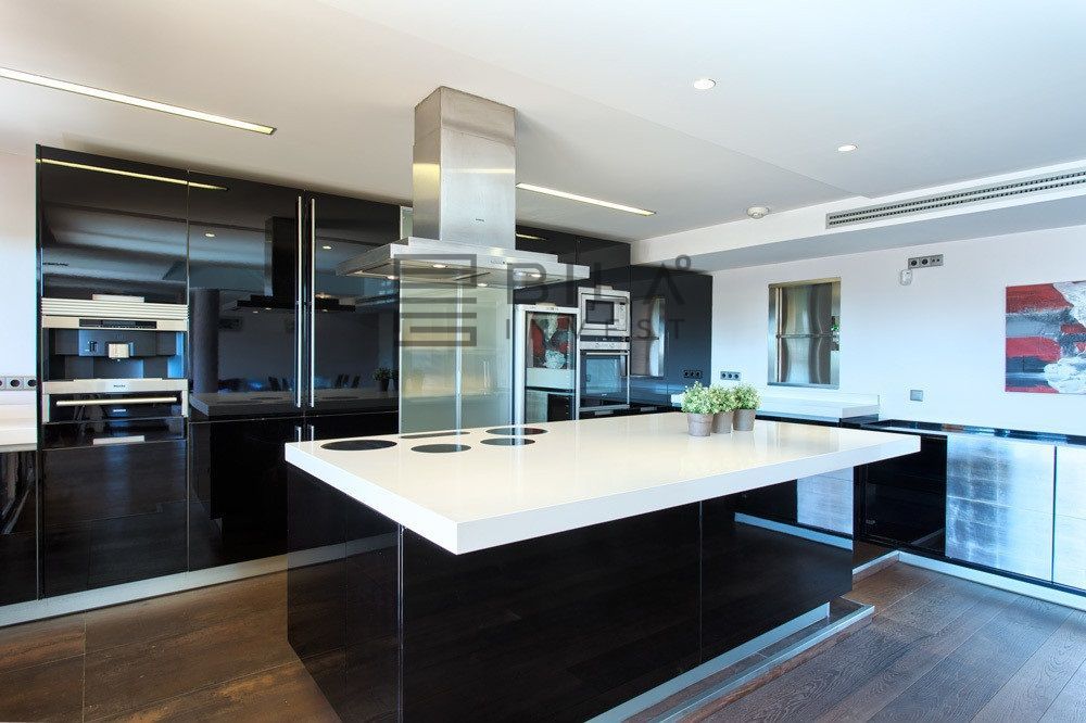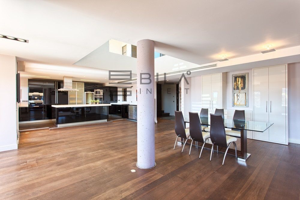 Being a duplex penthouse the four bedrooms all en-suite are spread over 2 floors there is an elevator to both floors, a guest cloakroom on the lower level, the main living area has an open fireplace and is very spacious with natural from the large windows all open on to the partly covered terrace. The kitchen fully equipped with all Bosh, Miele and Siemens appliances.