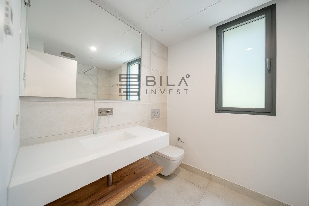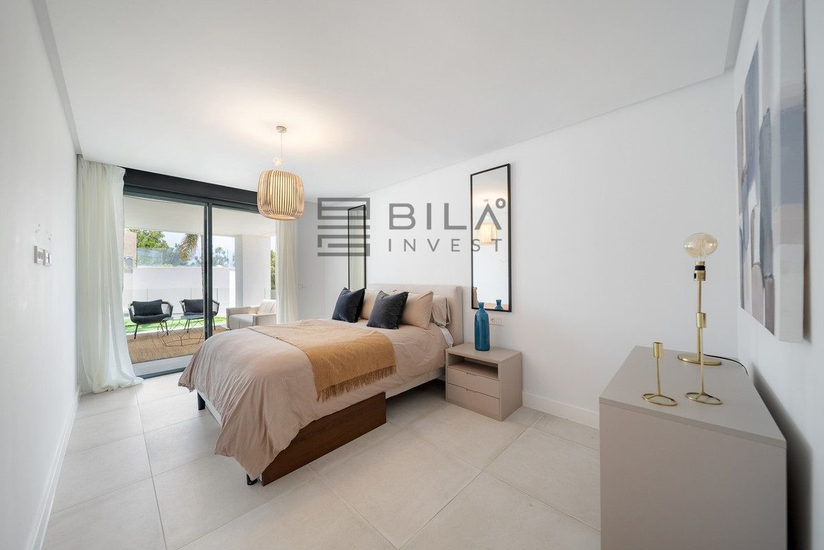 The main level features a serene master suite with walk-in wardrobe and en-suite bathroom. A second bedroom connects to a private garden terrace. A second bathroom, dedicated laundry room, and generous living space complete this floor, all finished with premium materials and refined design details.