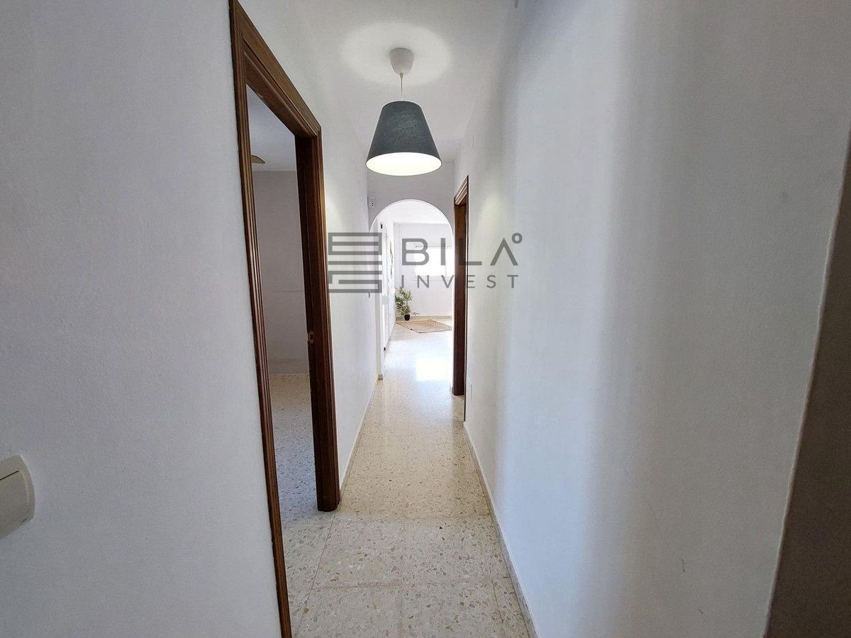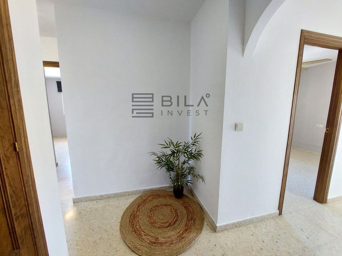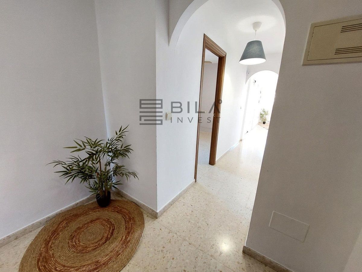 Upon entering, we access an entrance hall with built-in wardrobe, which leads to a hallway. To the right, we find a bedroom with built-in wardrobe and ceiling fan, followed by a fully equipped independent kitchen, with butane boiler and window to the outside. At the back, there is a spacious living-dining room, very bright, with direct access to the private terrace, ideal to enjoy the good weather.