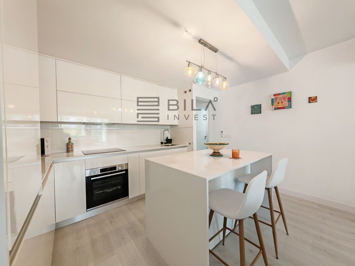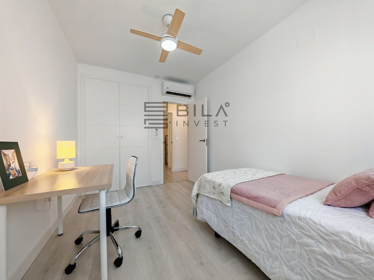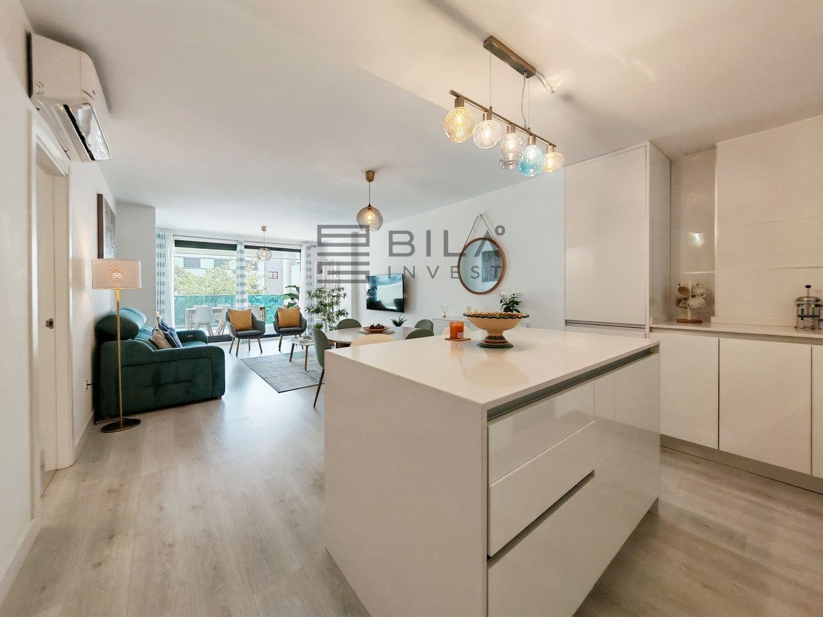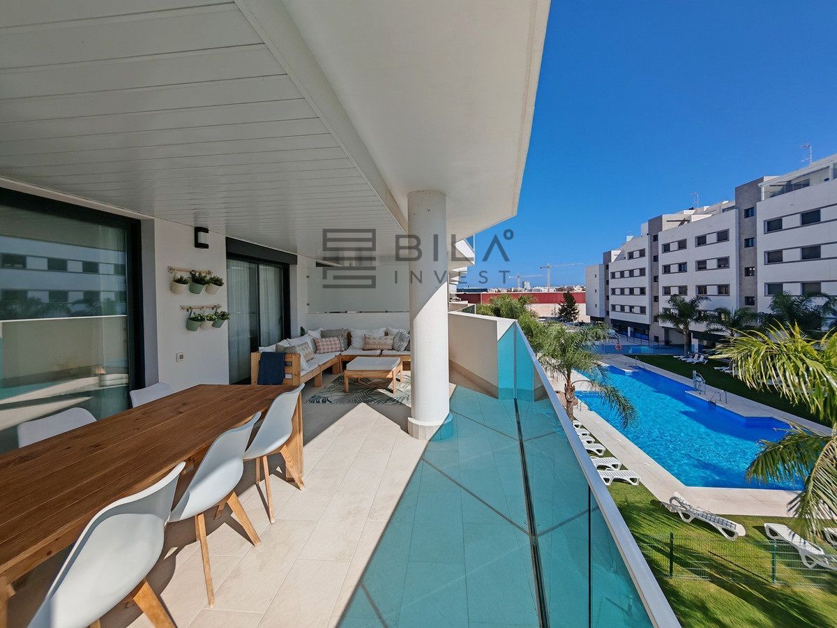Apartment for sale in , Mijas Costa with 3 bedrooms, 2 bathrooms, 1 on suite bathroom, 1 toilet and with orientation south, with communal swimming pool and private garage (1 parking spaces). Regarding property dimensions, it has 96.79 m² built, 132.9 m² plot and 45 m² terrace. Has the following facilities transport near, air conditioning, fully furnished, fully fitted kitchen, storage room, gym, security entrance, double glazing, video entrance, brand new, security service 24h, guest toilet, kitchen equipped, living room, automatic irrigation system, security shutters, internet - wi-fi, covered terrace, electric blinds, fitted wardrobes, gated community, lift, garden view, pool view, street view, close to children playground, close to golf, glass doors, open plan kitchen, balcony, wheelchair-accessible, excellent condition, close to shops, close to town, close to schools, surveillance cameras and pets allowed.
