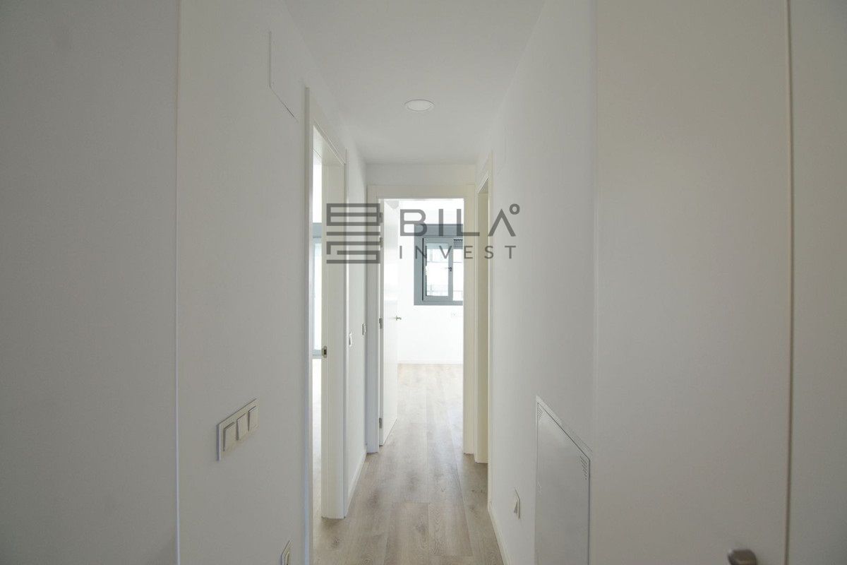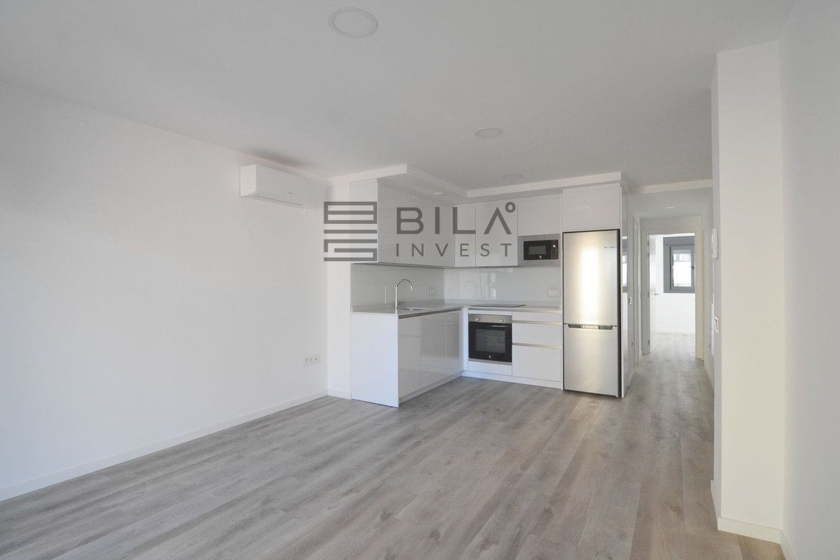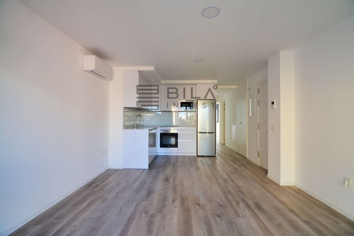The property features a spacious living room with an open-plan kitchen, fully equipped (including dishwasher), as well as a practical built-in wardrobe at the entrance, perfect for storage. From the living room, you access a south-facing terrace, sunny in the mornings, which also includes a private utility area for the washing machine and water heater.