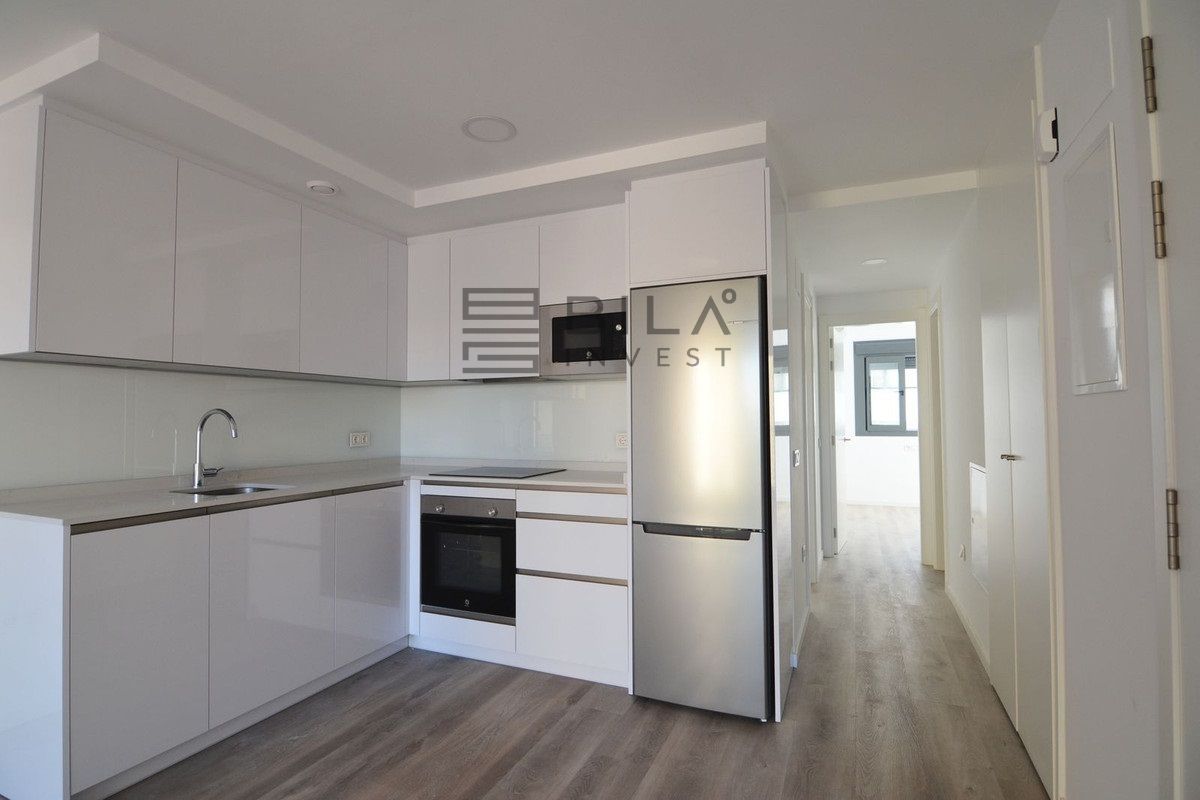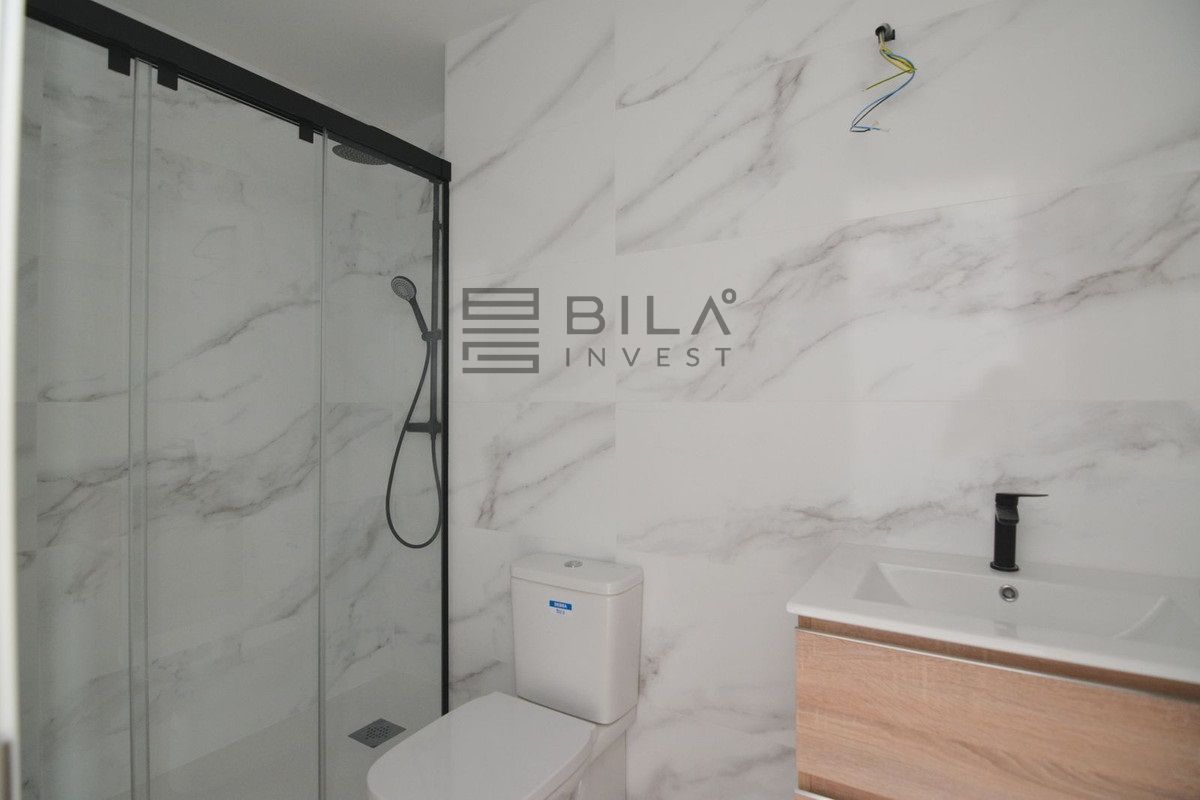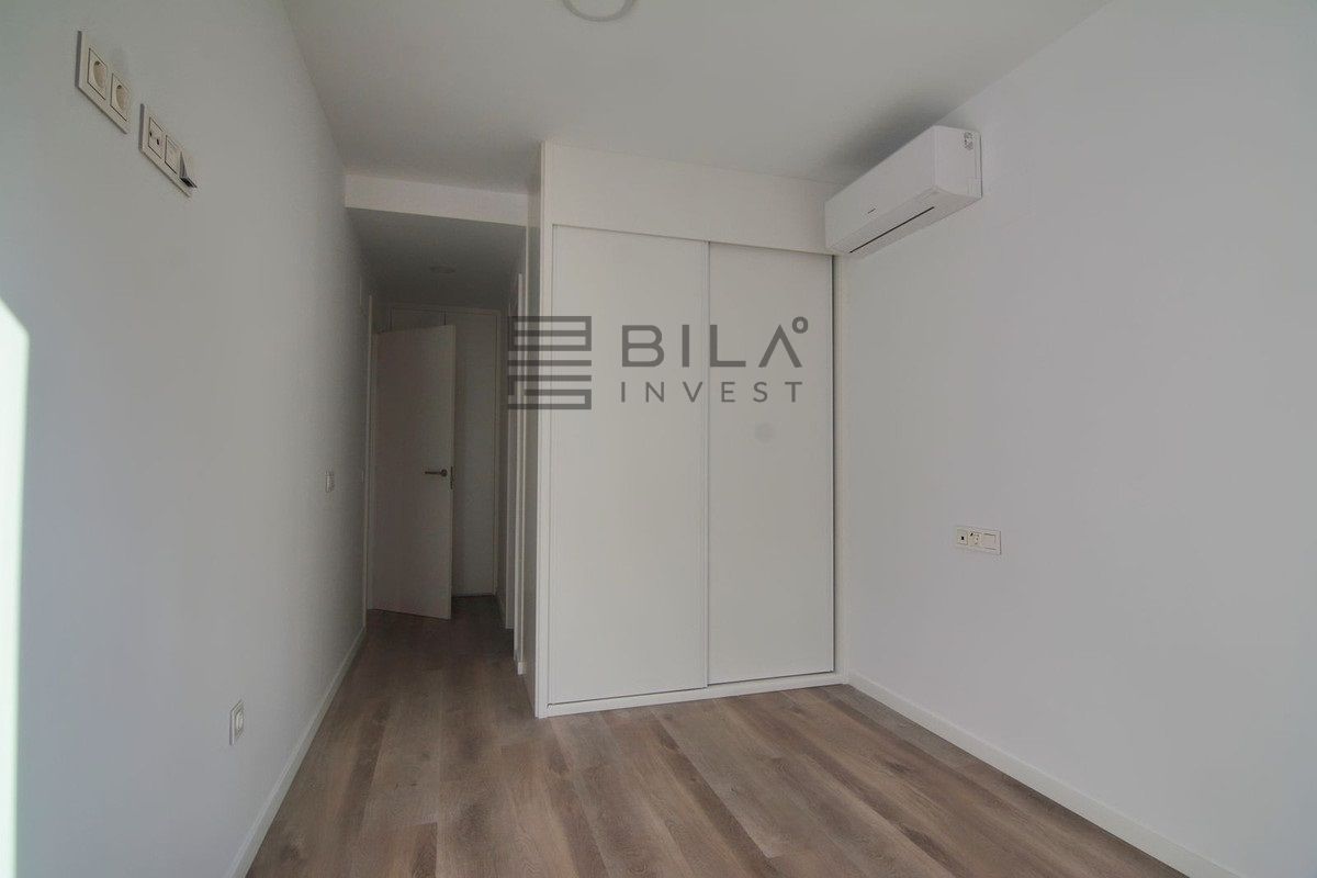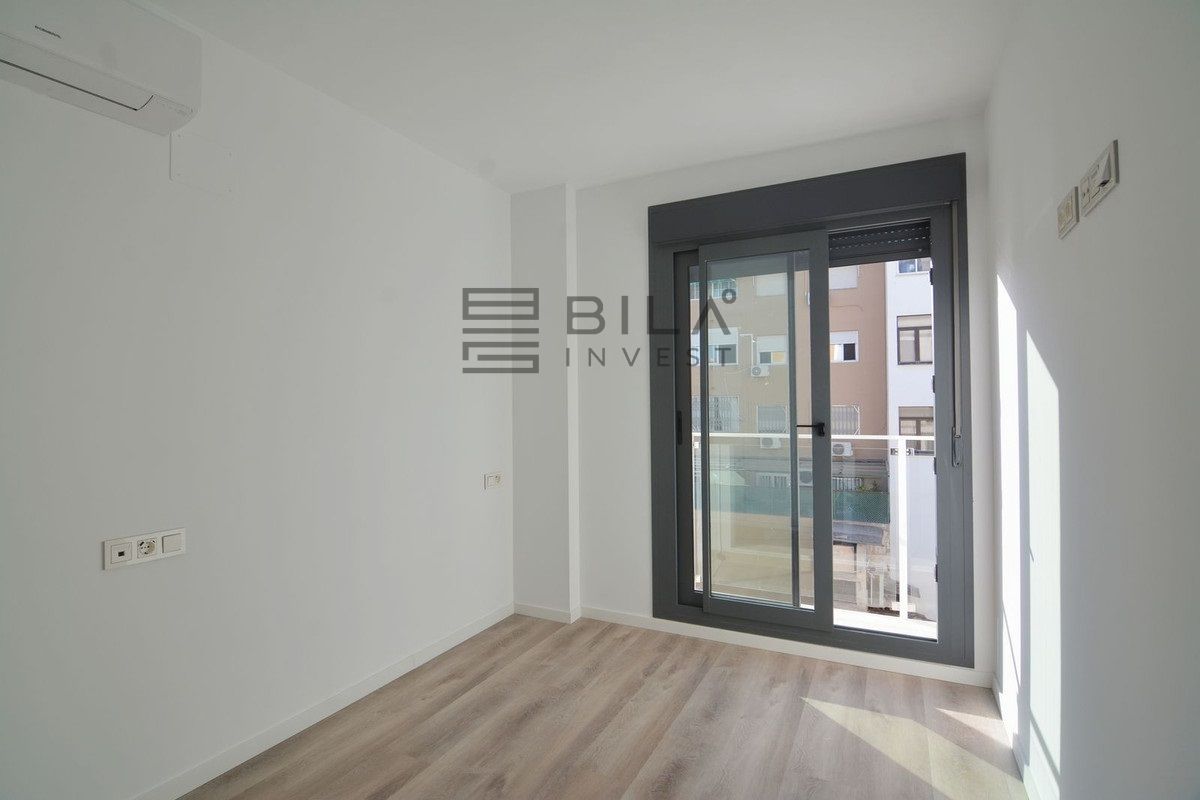 The property features a spacious living room with an open-plan kitchen, fully equipped (including dishwasher), as well as a practical built-in wardrobe at the entrance, perfect for storage. From the living room, you access a south-facing terrace, sunny in the mornings, which also includes a private utility area for the washing machine and water heater.