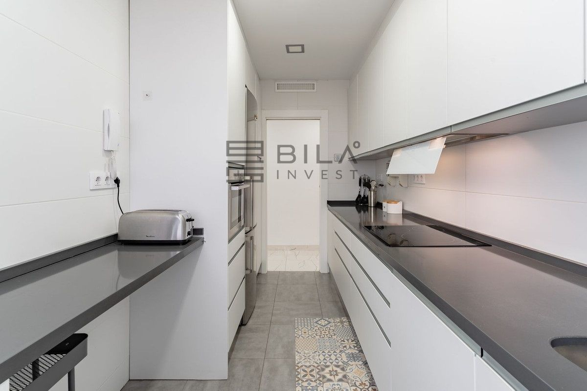 The heart of the apartment is a large open-plan living and dining area, seamlessly connected to a designer kitchen fully equipped with state-of-the-art appliances. From here, you access a private terrace with stunning sea views, the perfect setting for sunny breakfasts or unforgettable dinners overlooking the Mediterranean.