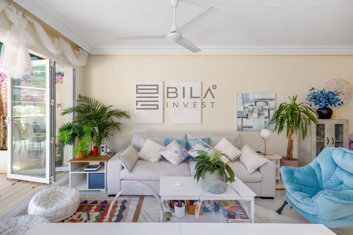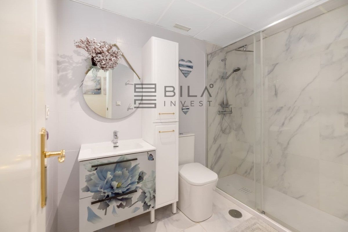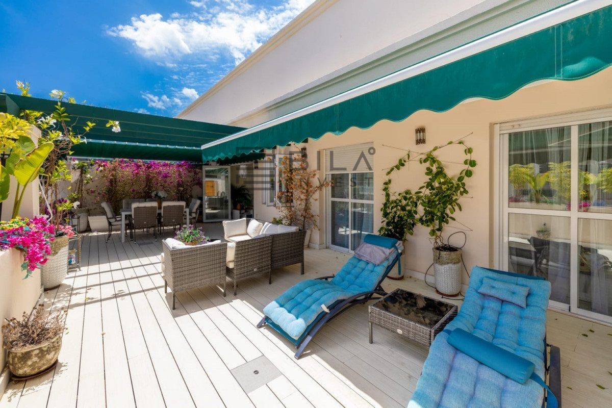 The apartment is thoughtfully designed with a fully fitted open-plan kitchen, marble floors, fitted wardrobes, and double glazing throughout. The living and dining areas are bright and airy, benefitting from direct access to the private terrace, which offers delightful views of the sea, mountains, gardens, and urban surroundings. Additional features such as air conditioning, security shutters, an alarm system, security entrance, video entrance, and surveillance cameras ensure both comfort and peace of mind.