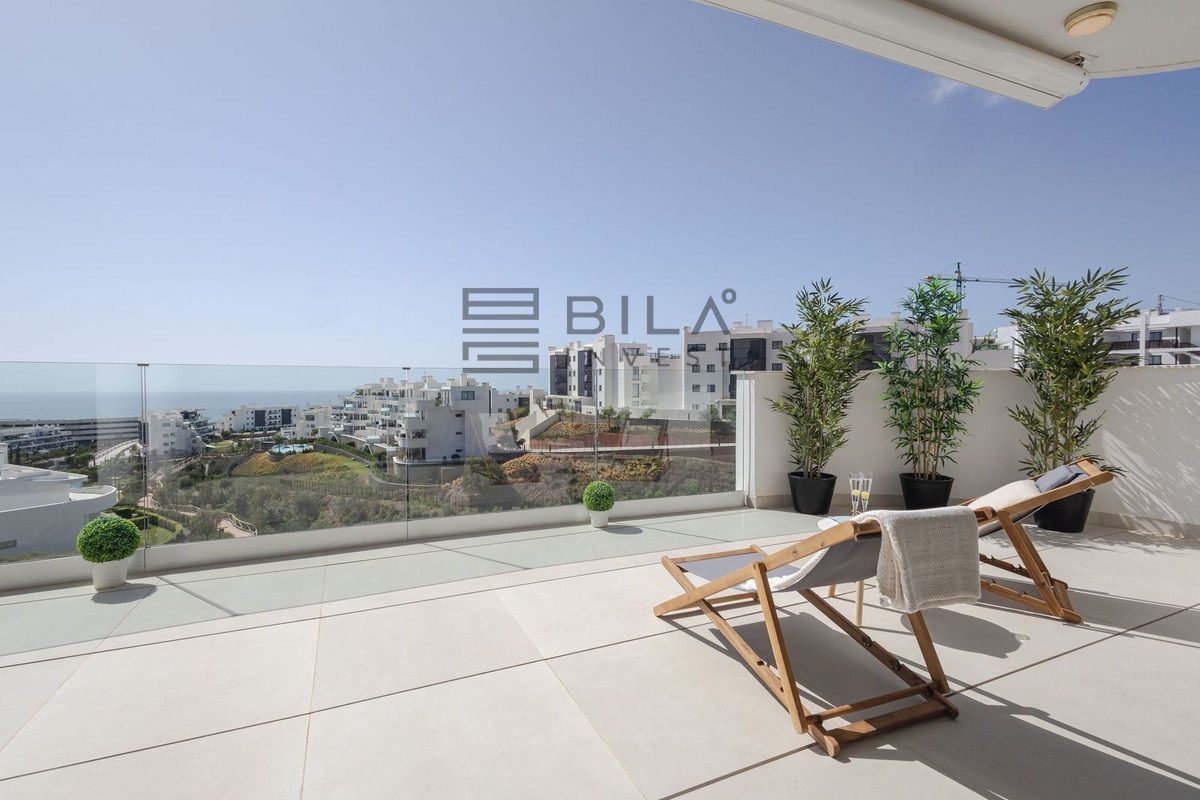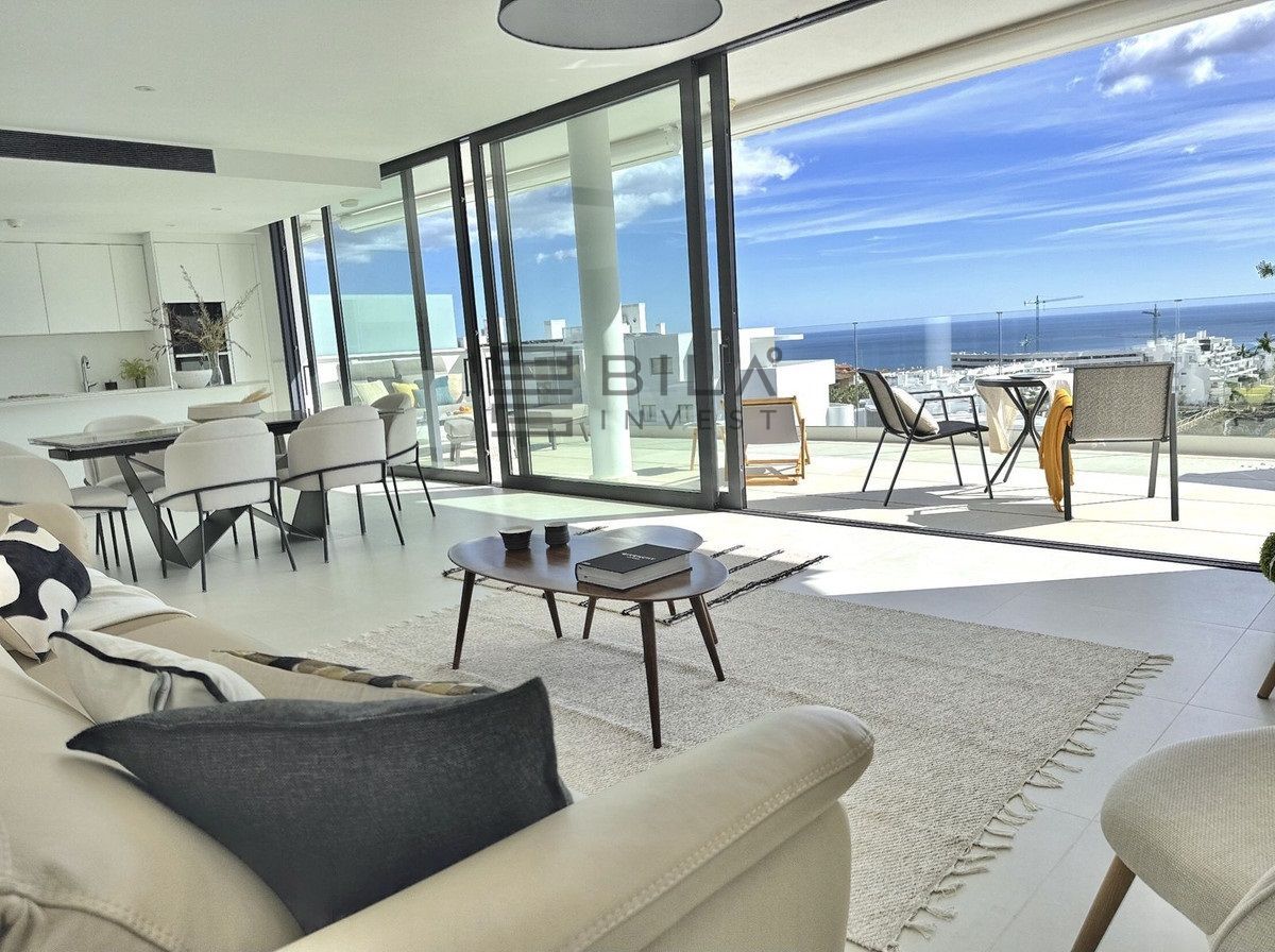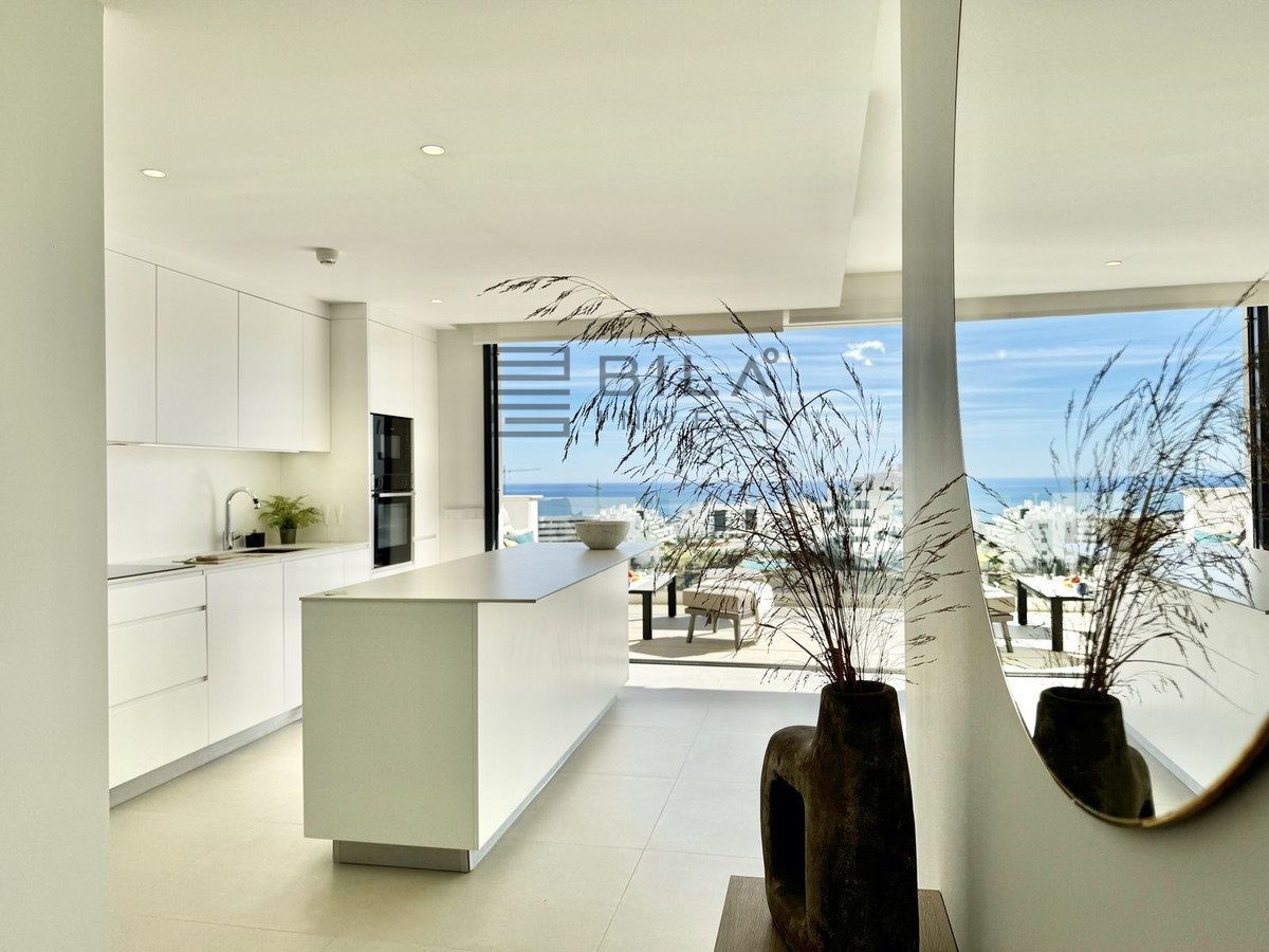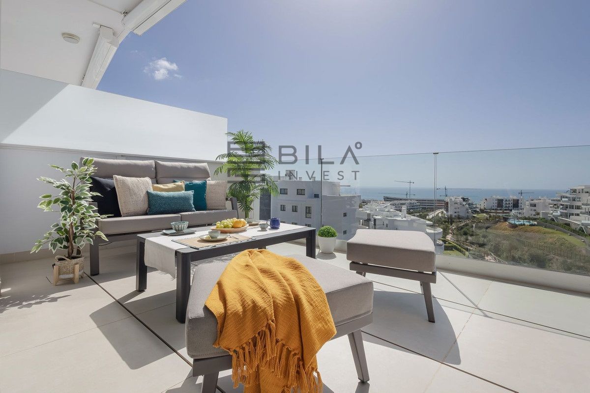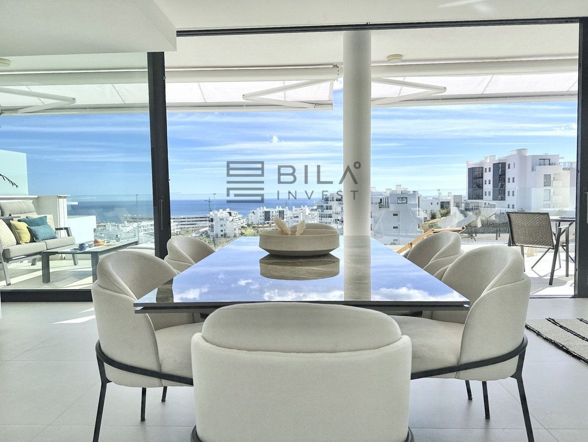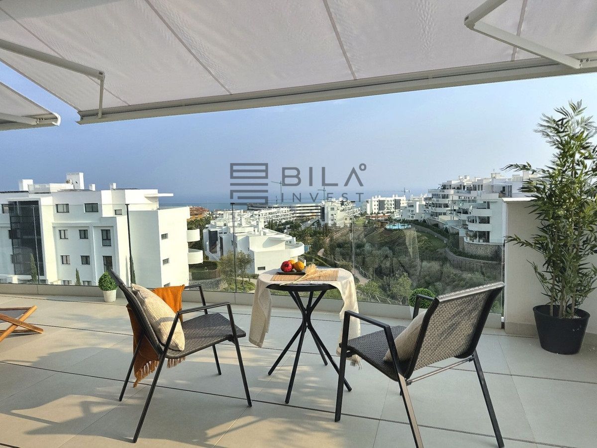 This property includes a storage and 2 large parking spaces. The apartment is surrounded by green areas and has fantastic open frontal views onto the green valley leading to the sea. The interior has been tastefully furnished and reveals a feel of space, the interior blending in nicely with the outside terrace. The master bedroom enjoys a private terrace with sea views and a walk-in closet. Extras include both outdoor and indoor electric awnings, underfloor heating in all rooms controlled from your phone via domotics., Neff kitchen appliances. Perimetral ceiling led lighting in sitting room and bedrooms.