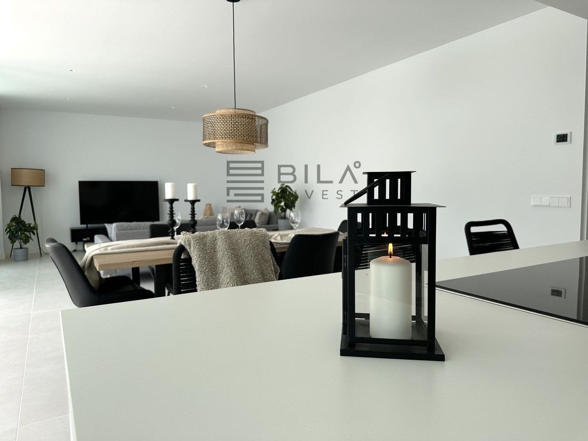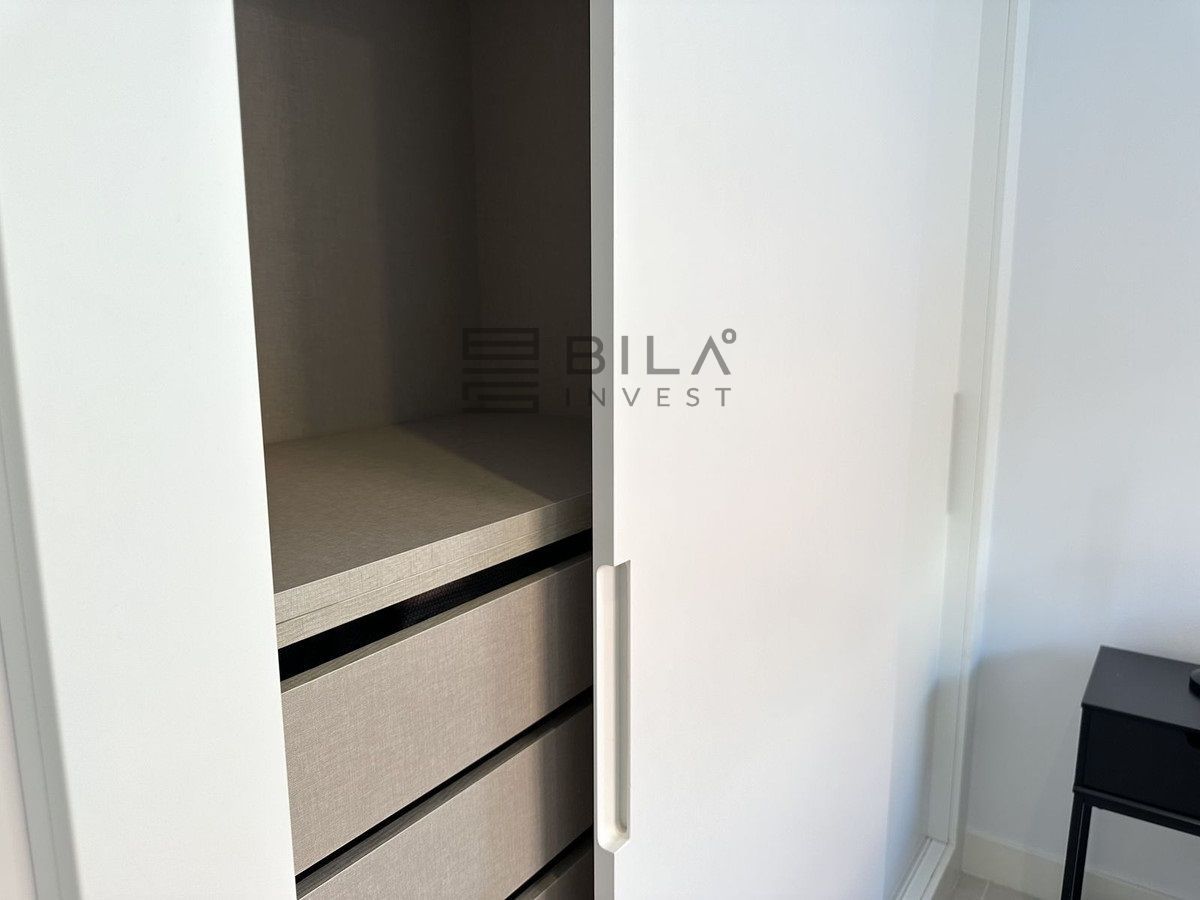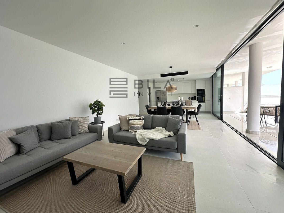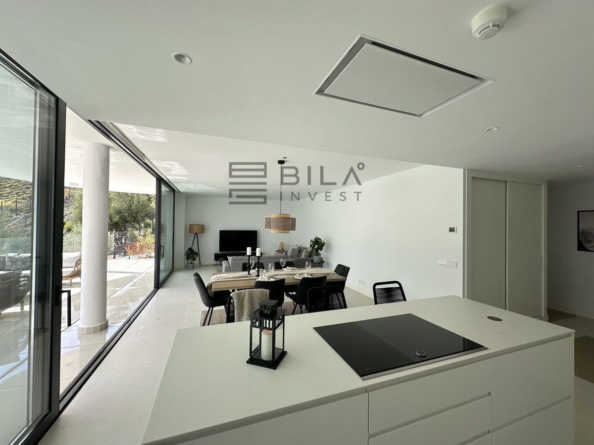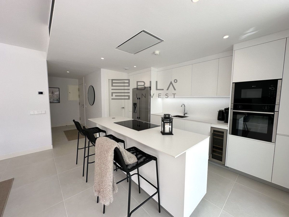 The living area has an open-plan layout that creates a sense of indoor-outdoor living, with large windows that can be fully opened to let in fresh air and natural light. From here, you can access the expansive 74 m² terrace, which brings a light and airy atmosphere to both the living room and kitchen. The kitchen is fully equipped with the latest NEFF appliances, including a fridge, freezer, microwave, oven, induction hob, and a built-in ceiling fan. Additionally, there is a built-in wine cooler, and the freezer is equipped with an ice machine and filtered water, so you can enjoy ice-cold water directly from the freezer.
