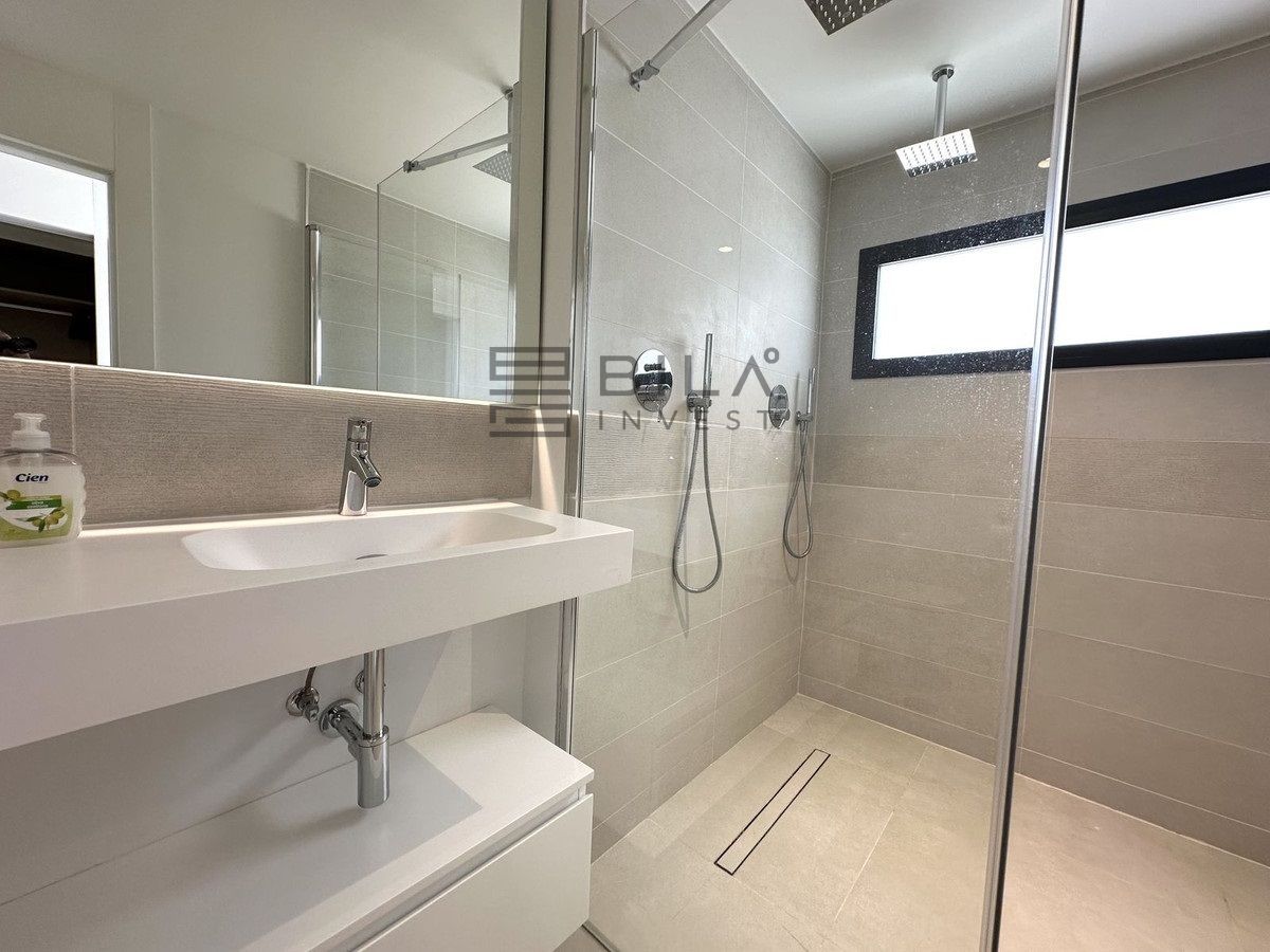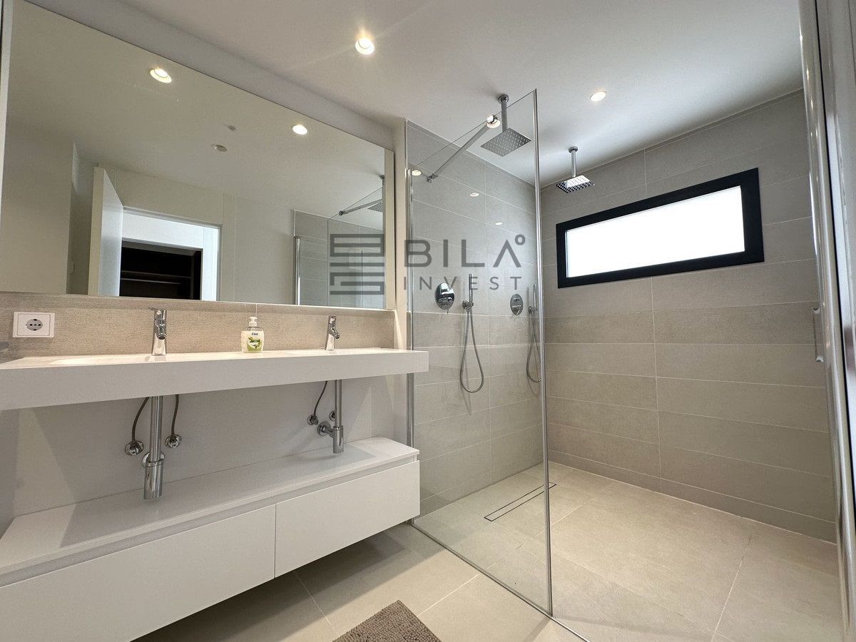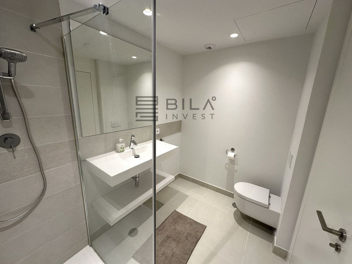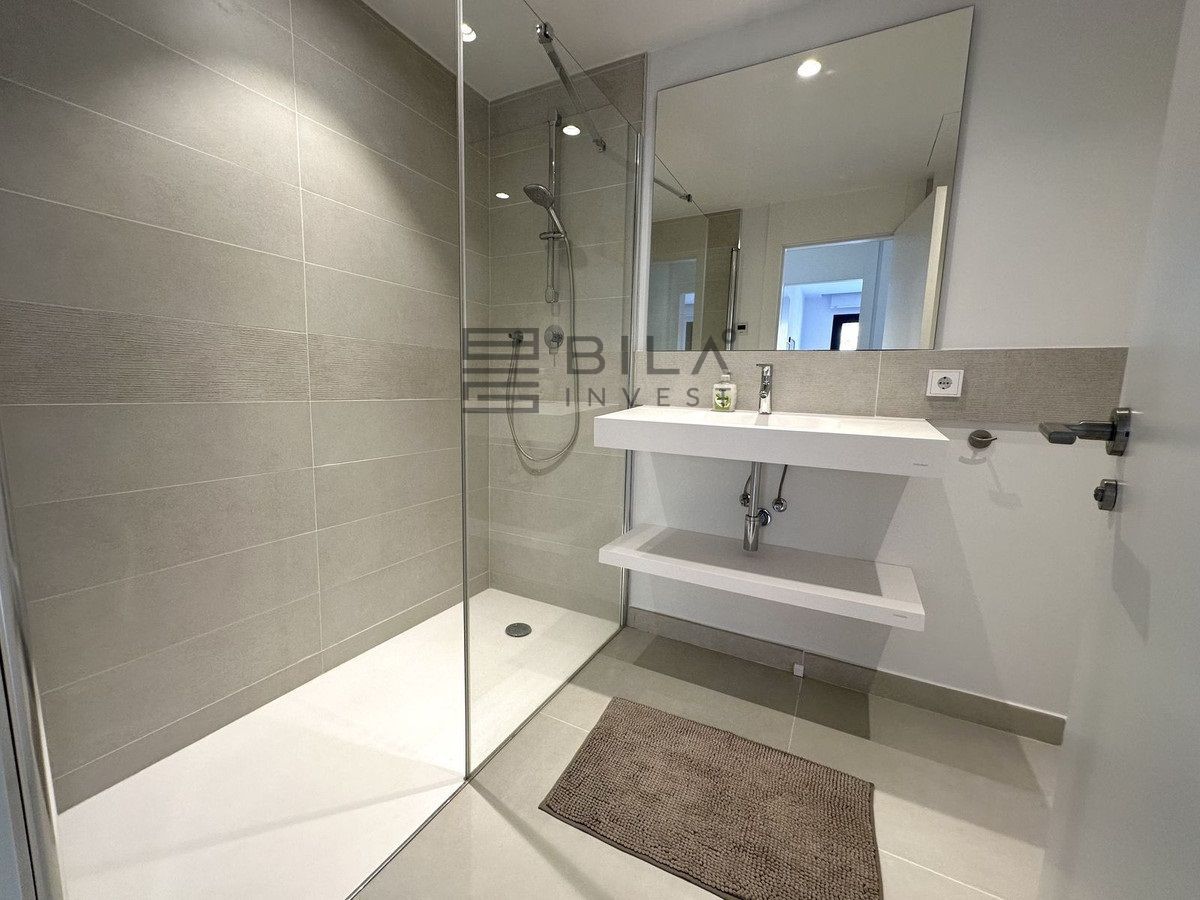 The Master Bedroom has its own access to the large terrace, a walk-in closet, and an en-suite bathroom. The bathroom is a true oasis, featuring an impressive double shower with overhead rain showers for an extra touch of luxury. The other bedrooms also have built-in wardrobes and private access to the terrace. The second bathroom, located just outside the bedrooms, is sleek and designed with a focus on exclusivity.