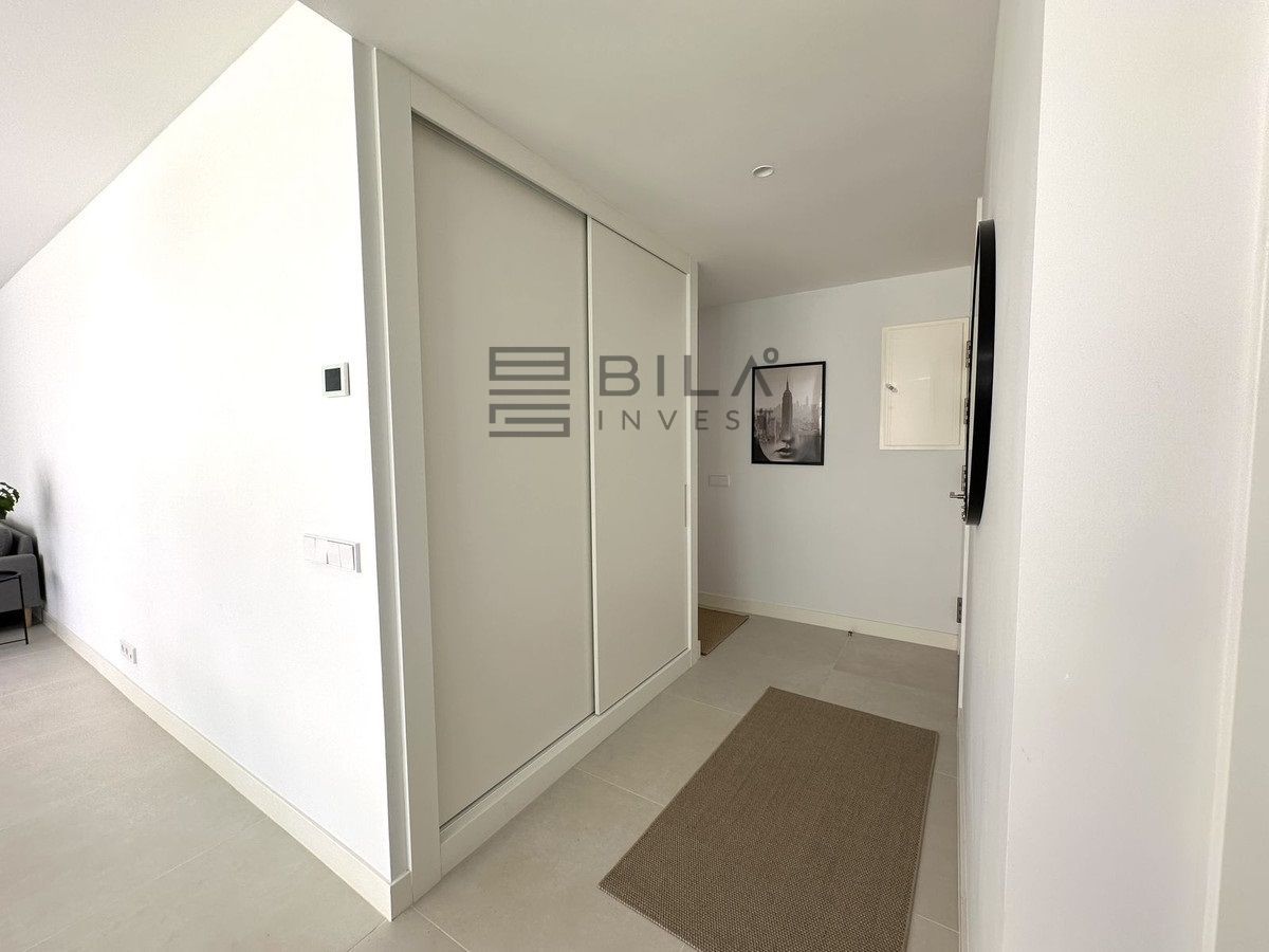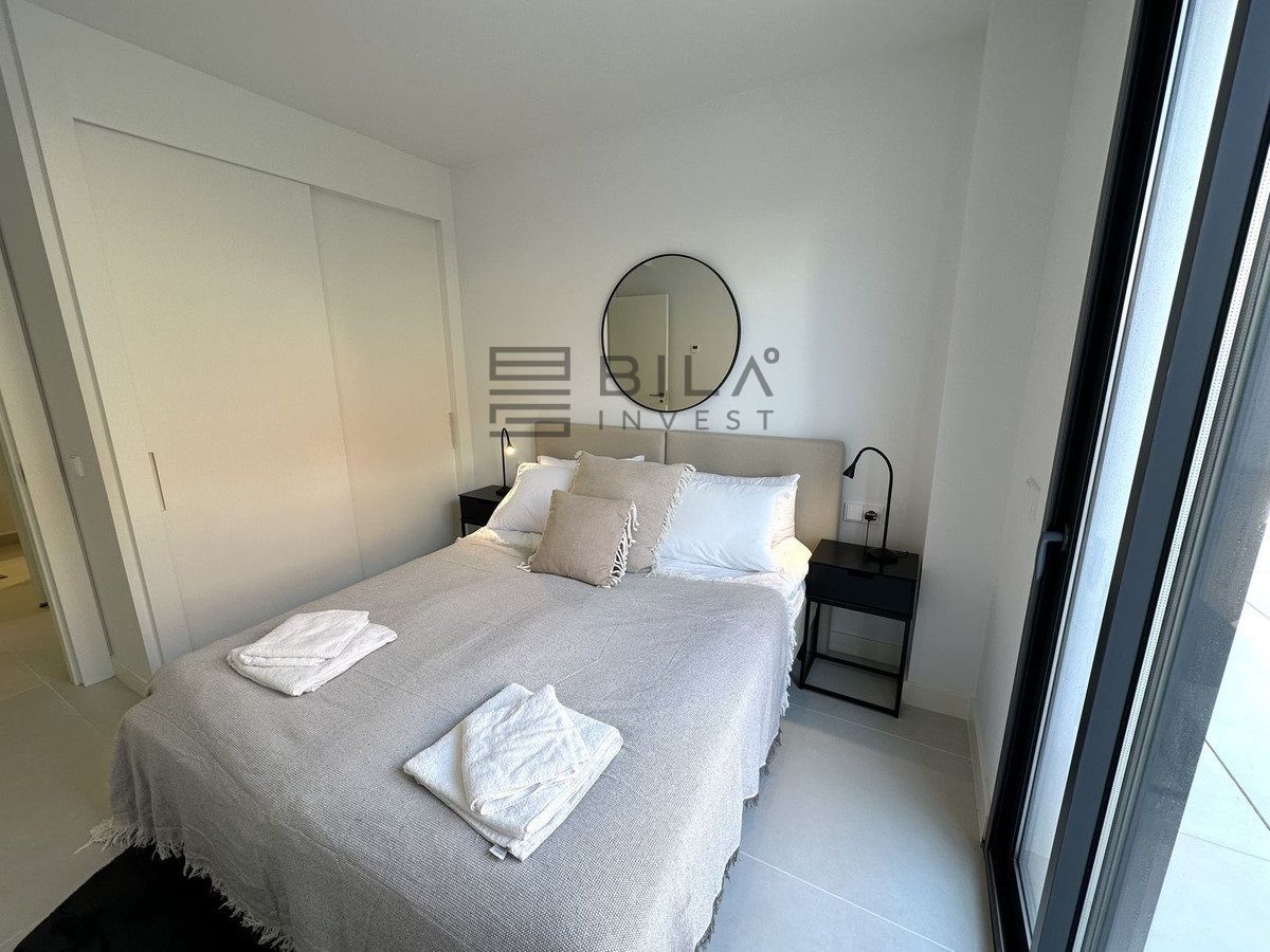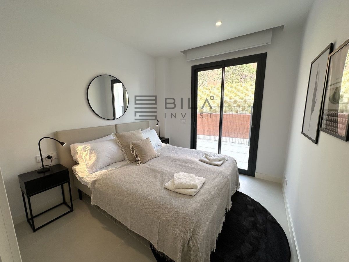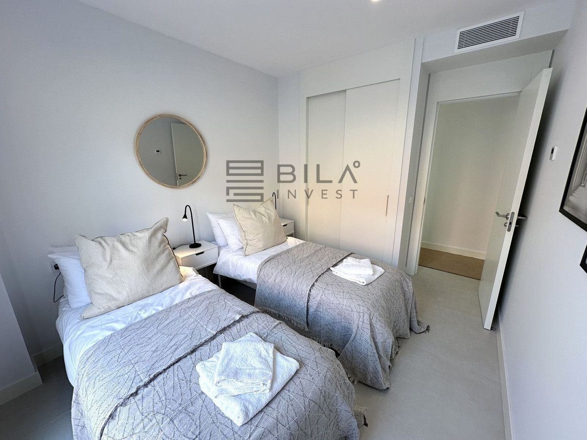 The Master Bedroom has its own access to the large terrace, a walk-in closet, and an en-suite bathroom. The bathroom is a true oasis, featuring an impressive double shower with overhead rain showers for an extra touch of luxury. The other bedrooms also have built-in wardrobes and private access to the terrace. The second bathroom, located just outside the bedrooms, is sleek and designed with a focus on exclusivity.