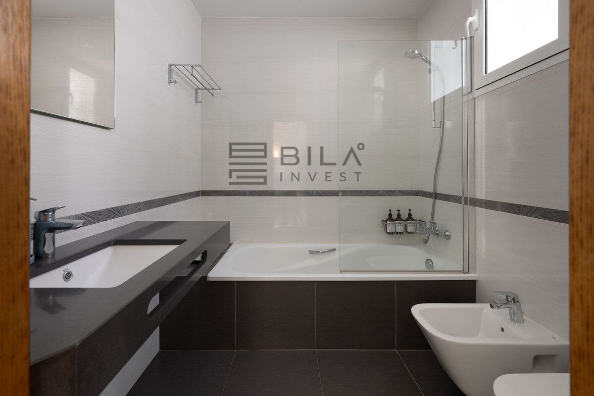 Just beyond the French doors in the lounge, a spacious patio area awaits where you can relax with a glass of wine while soaking in the sun and admiring the stunning views of the sea and beach. The beautifully landscaped garden surrounding the pool creates a tranquil escape, complete with sunbeds for ultimate relaxation.