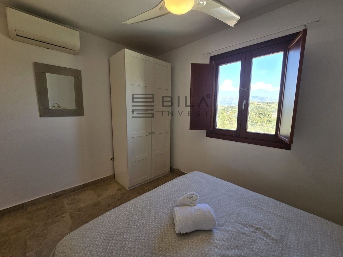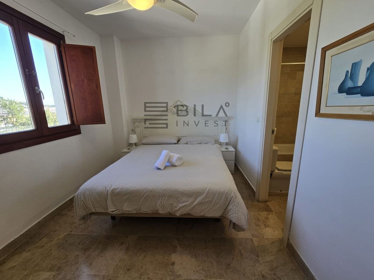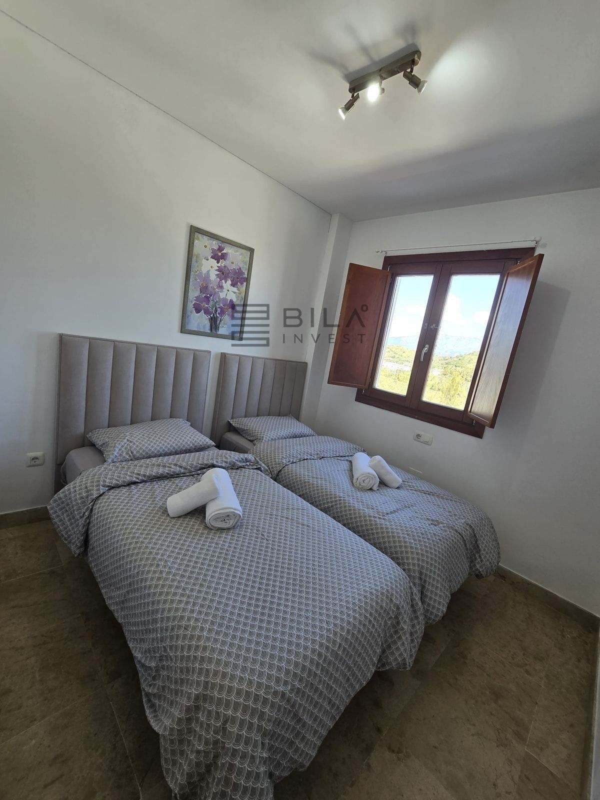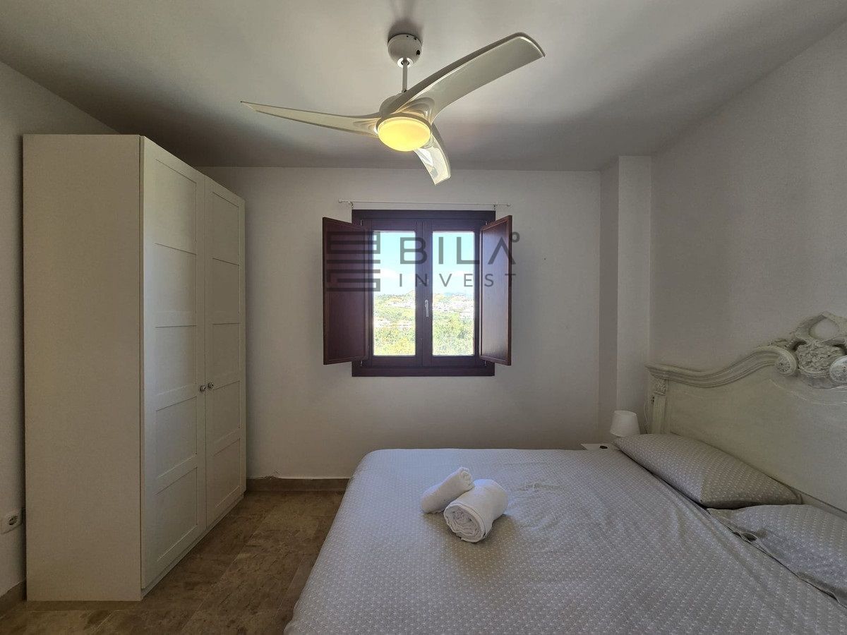 The first floor consists of 3 bedrooms and two complete bathrooms (one en-suite), all the bedrooms have fitted wardrobes. Then on the ground floor we find a guest toilet, kitchen and living room, both rooms with direct access to a large terrace overlooking the sea, mountains, golf and one of the swimming pools (there are 2) of the urbanization. Southeast facing.