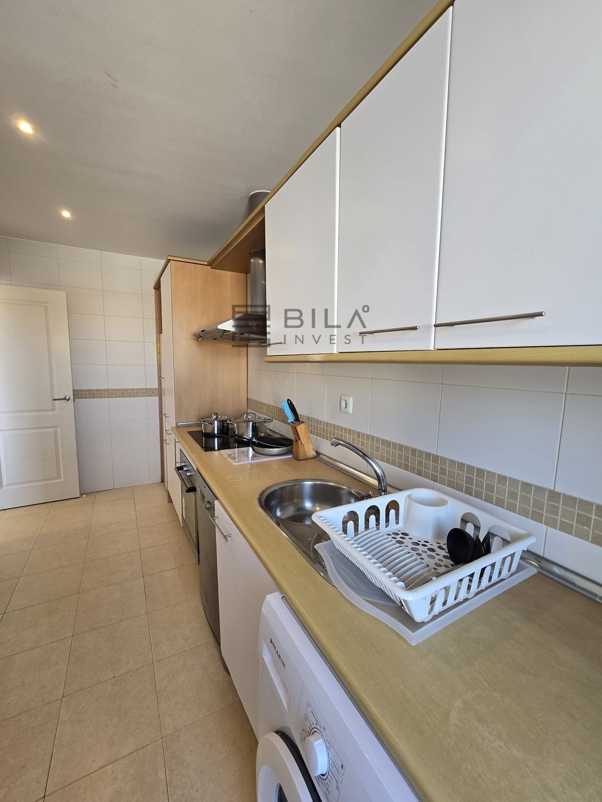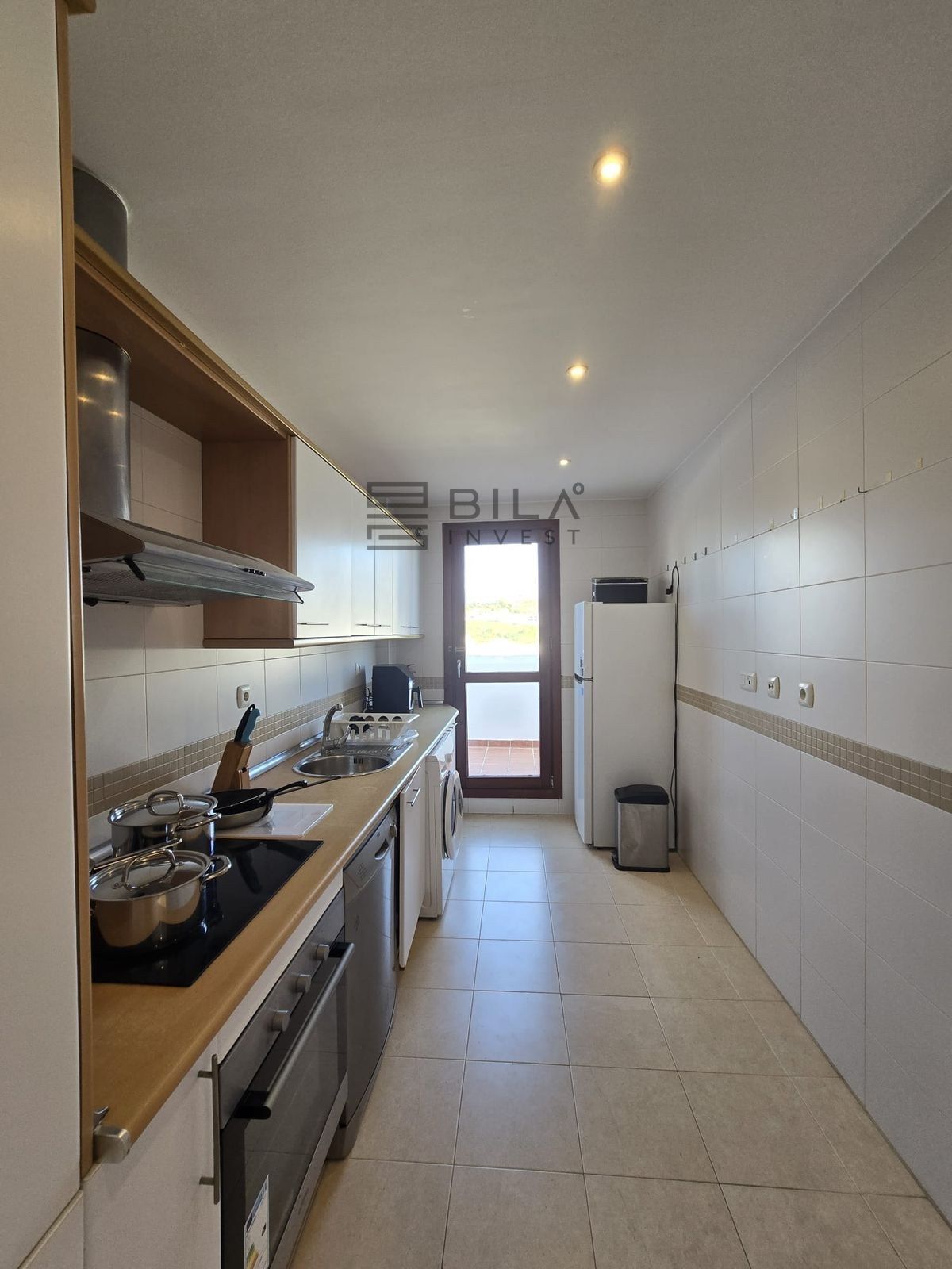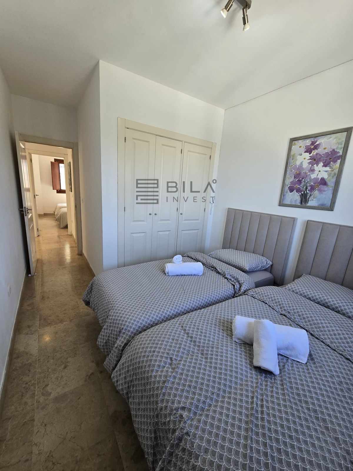 The first floor consists of 3 bedrooms and two complete bathrooms (one en-suite), all the bedrooms have fitted wardrobes. Then on the ground floor we find a guest toilet, kitchen and living room, both rooms with direct access to a large terrace overlooking the sea, mountains, golf and one of the swimming pools (there are 2) of the urbanization. Southeast facing.