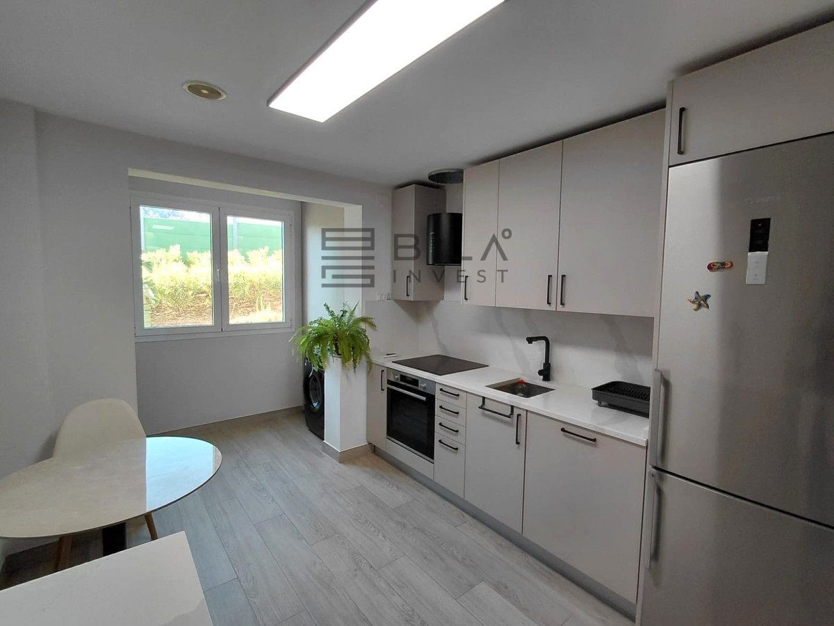 Renovated kitchen, fully equipped with high-quality appliances: refrigerator, oven, ceramic hob, dishwasher, and washing machine.