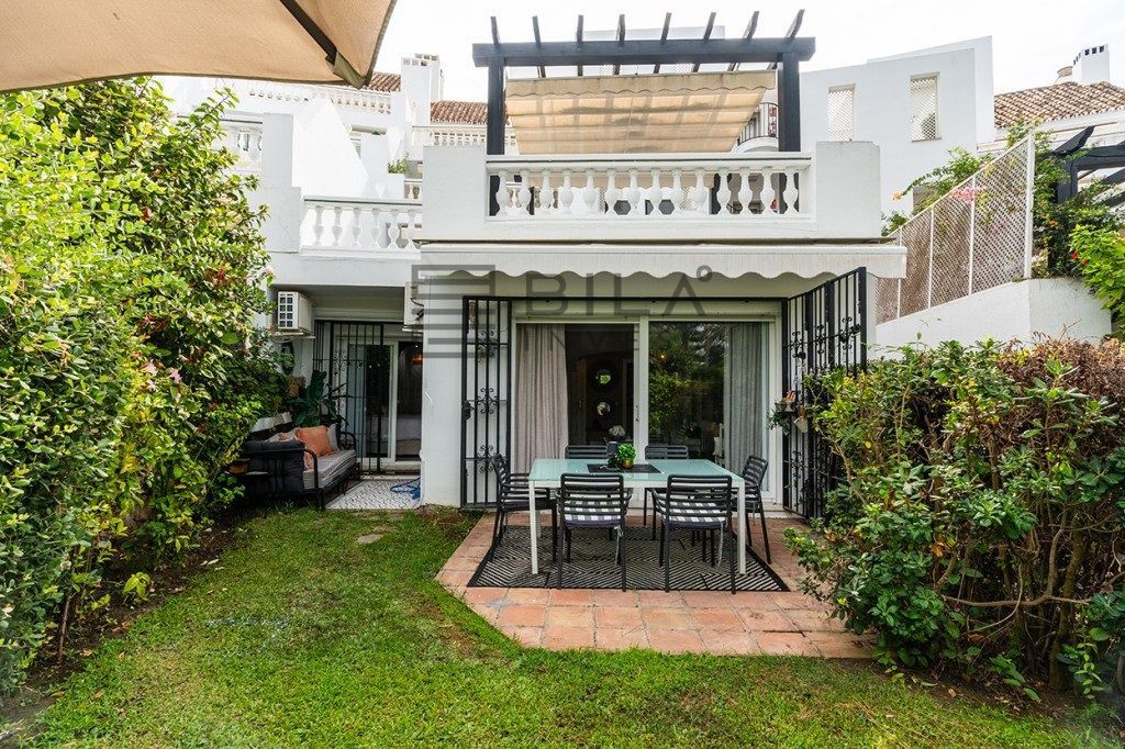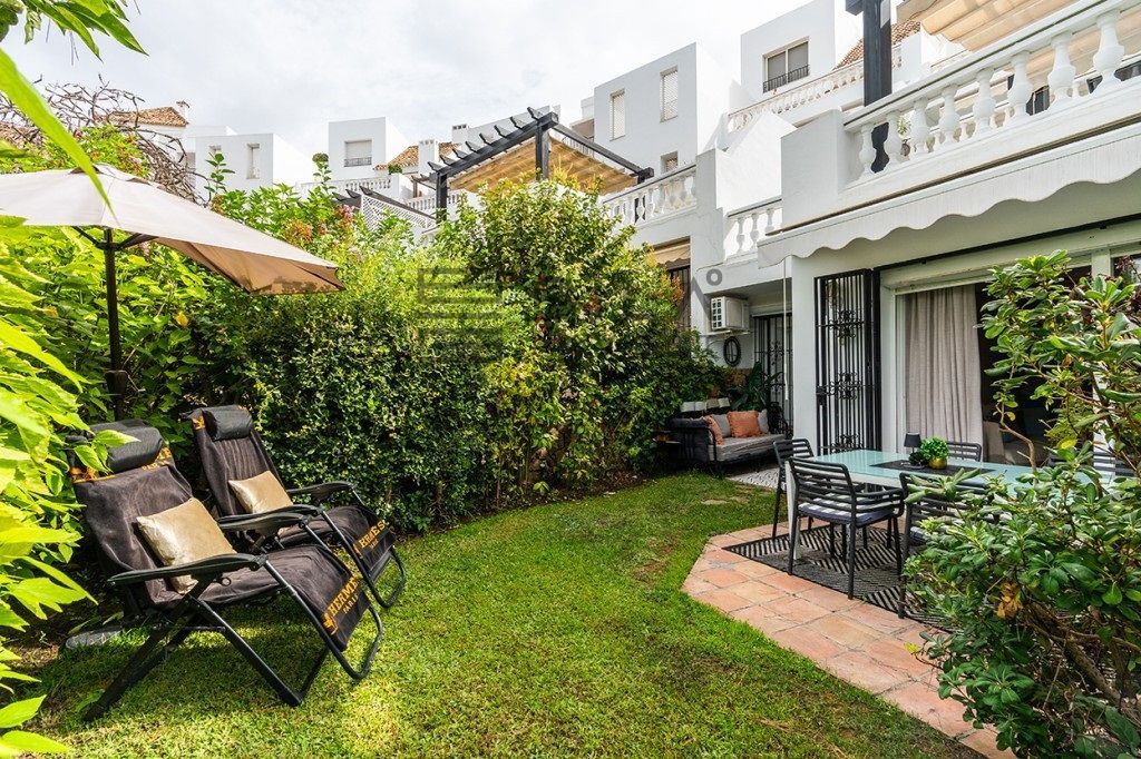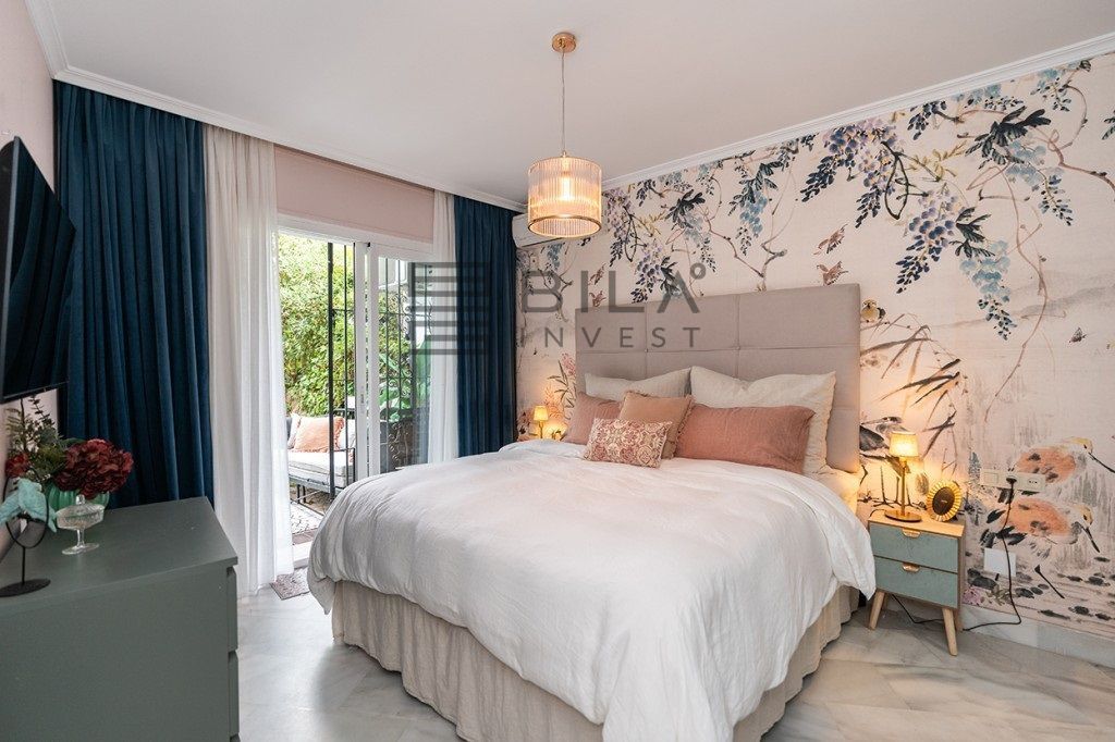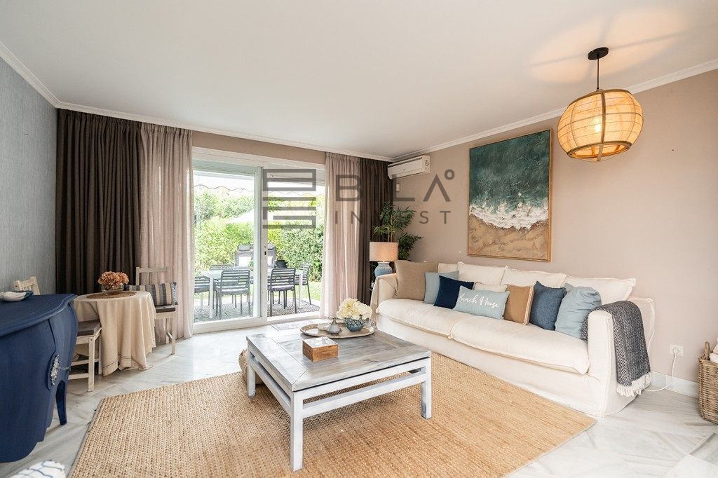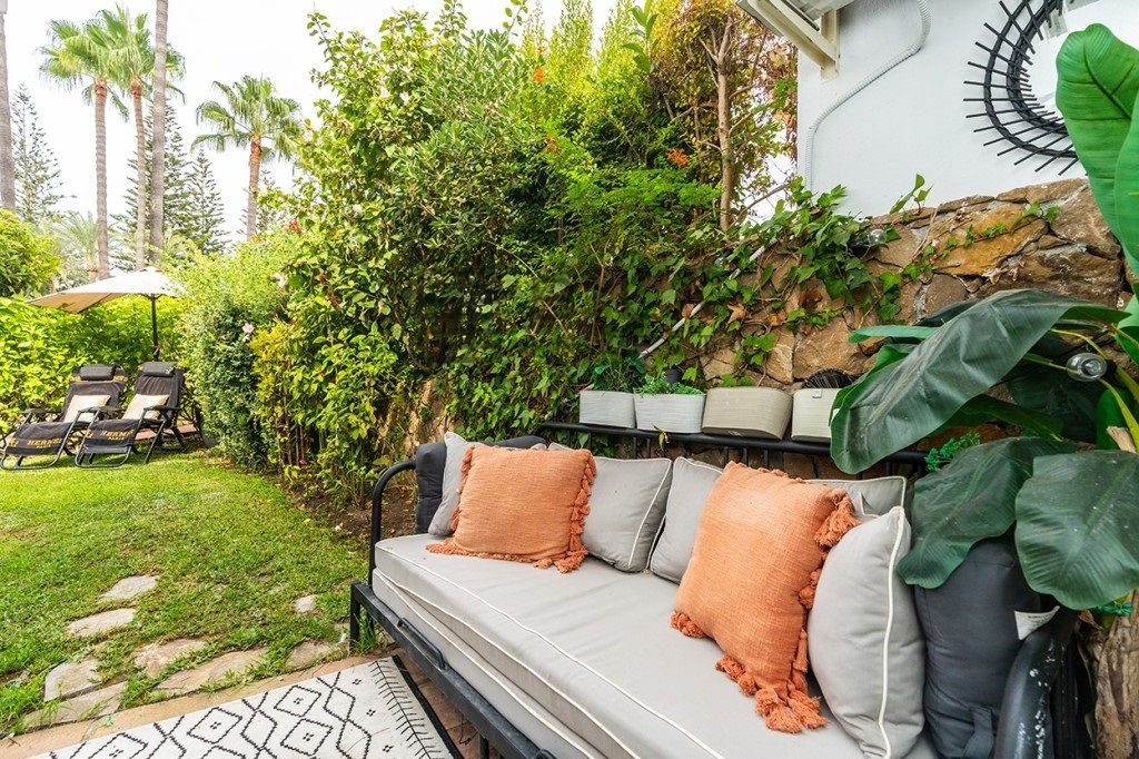 Amazing fully refurbished garden apartment with southwest orientation on the beachside in Elviria in East Marbella. The apartment offers one ample bedroom with walk-in closet and bathroom, a guest toilet, a beautiful fully equipped kitchen and bright living room with access to terrace and private garden. The apartment is sold fully furnished and equipped and including and underground parking space and storage room. Gated complex in second beach line offering tropical gardens, 24hrs. security on site, pool and heated pool. Within walking distance to all local amenities. The centre of Marbella is just a 10 minute drive away.
