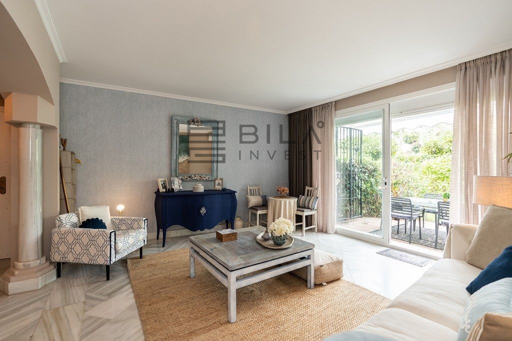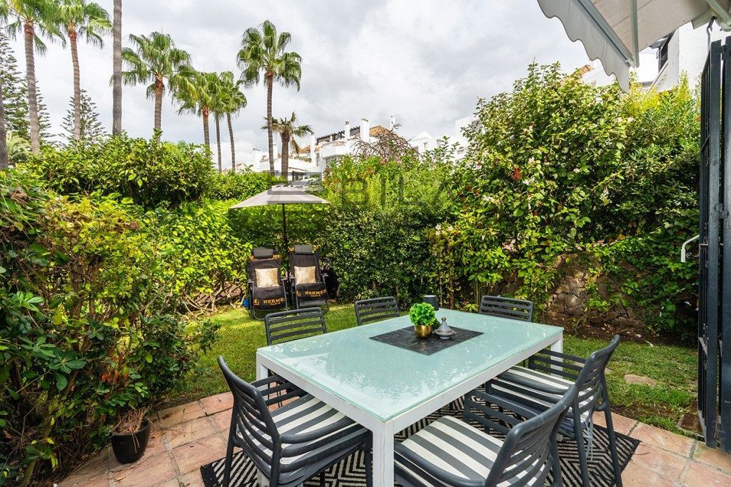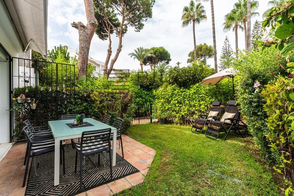 Apartment with 100m2 of garden for sale in Edif. Sabinas, Carib Playa, Marbella, with 112m2, 2 bedrooms and 2 bathrooms, swimming pool, garage, storage room, elevator and air conditioning.