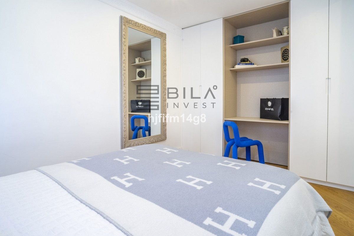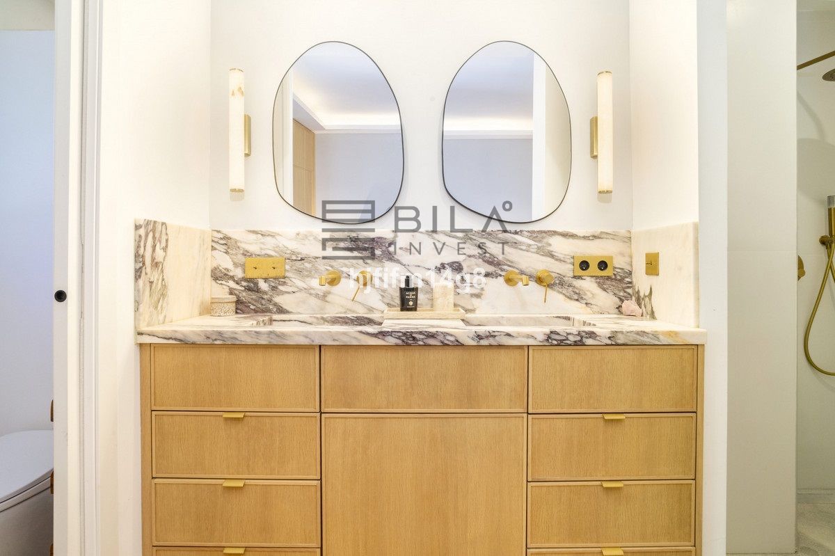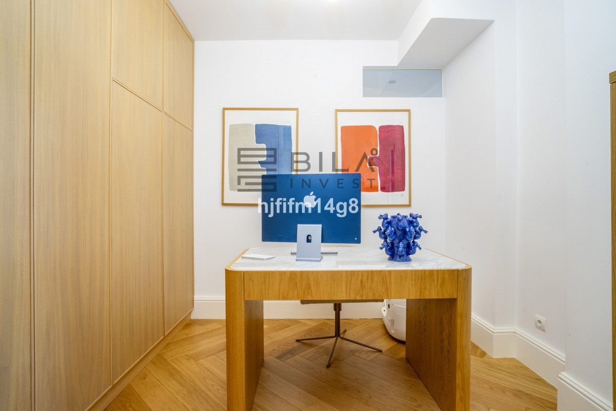 The apartment offers three rooms and two bathrooms, all thoughtfully renovated with high-quality materials and contemporary finishes. The third room is currently arranged as an office but can easily be converted back into a bedroom if required, providing valuable flexibility.