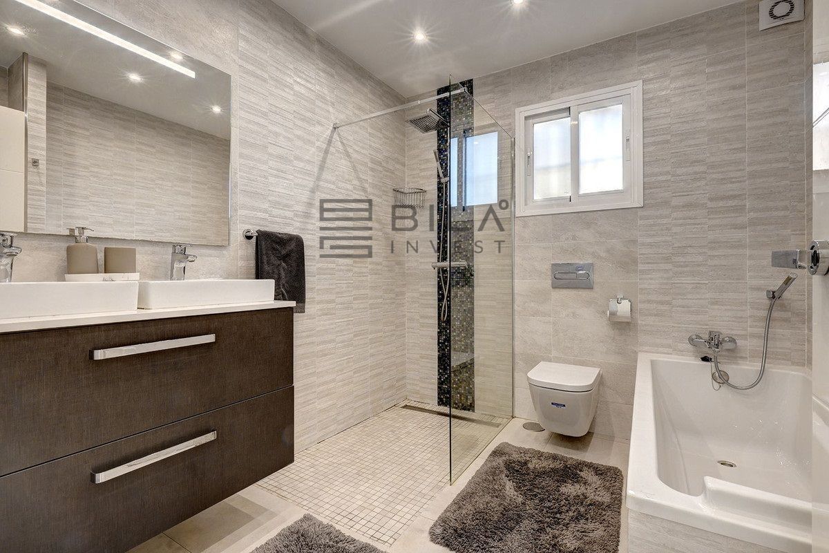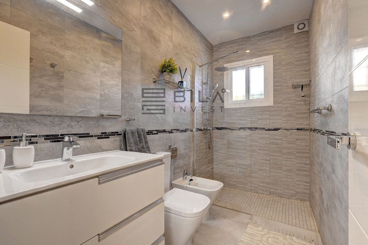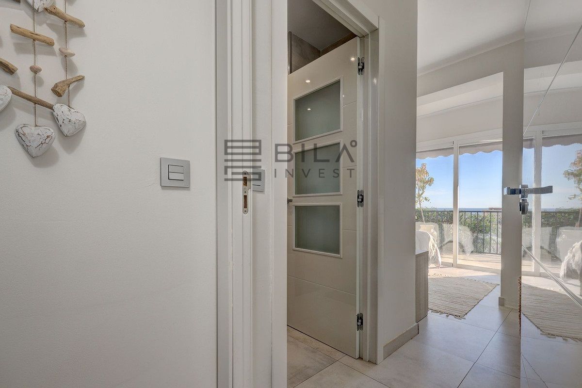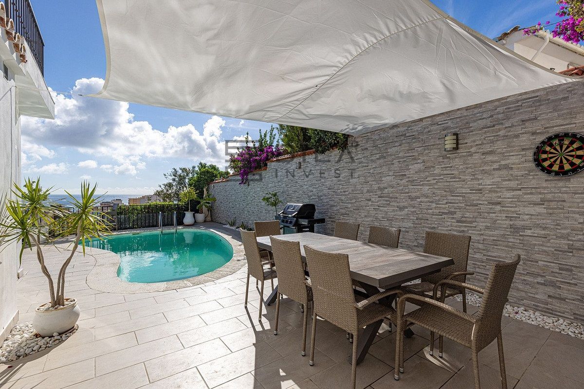 Exit to the private garden and pool area. The villa features a beautiful pool area with ample space for sunbathing, plus a barbecue area ideal for entertaining family and friends. For even more spectacular views, head up to the rooftop solarium where you can relax with a refreshing drink while enjoying the beauty of the Mediterranean, a wonderful place to create unforgettable memories.