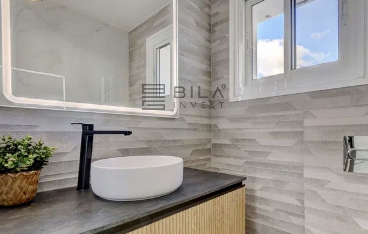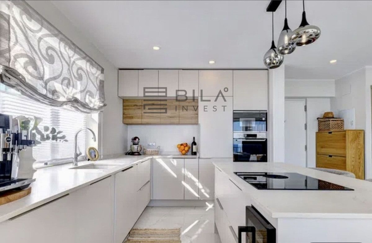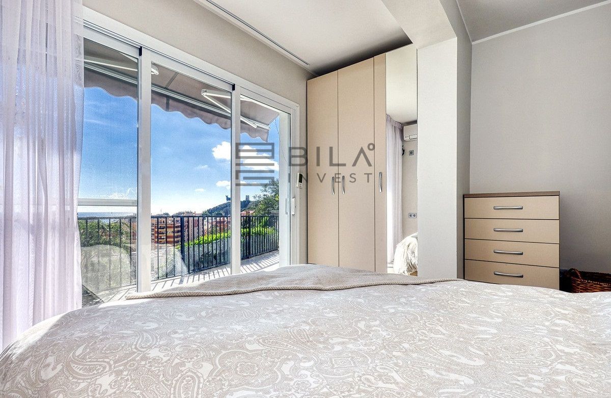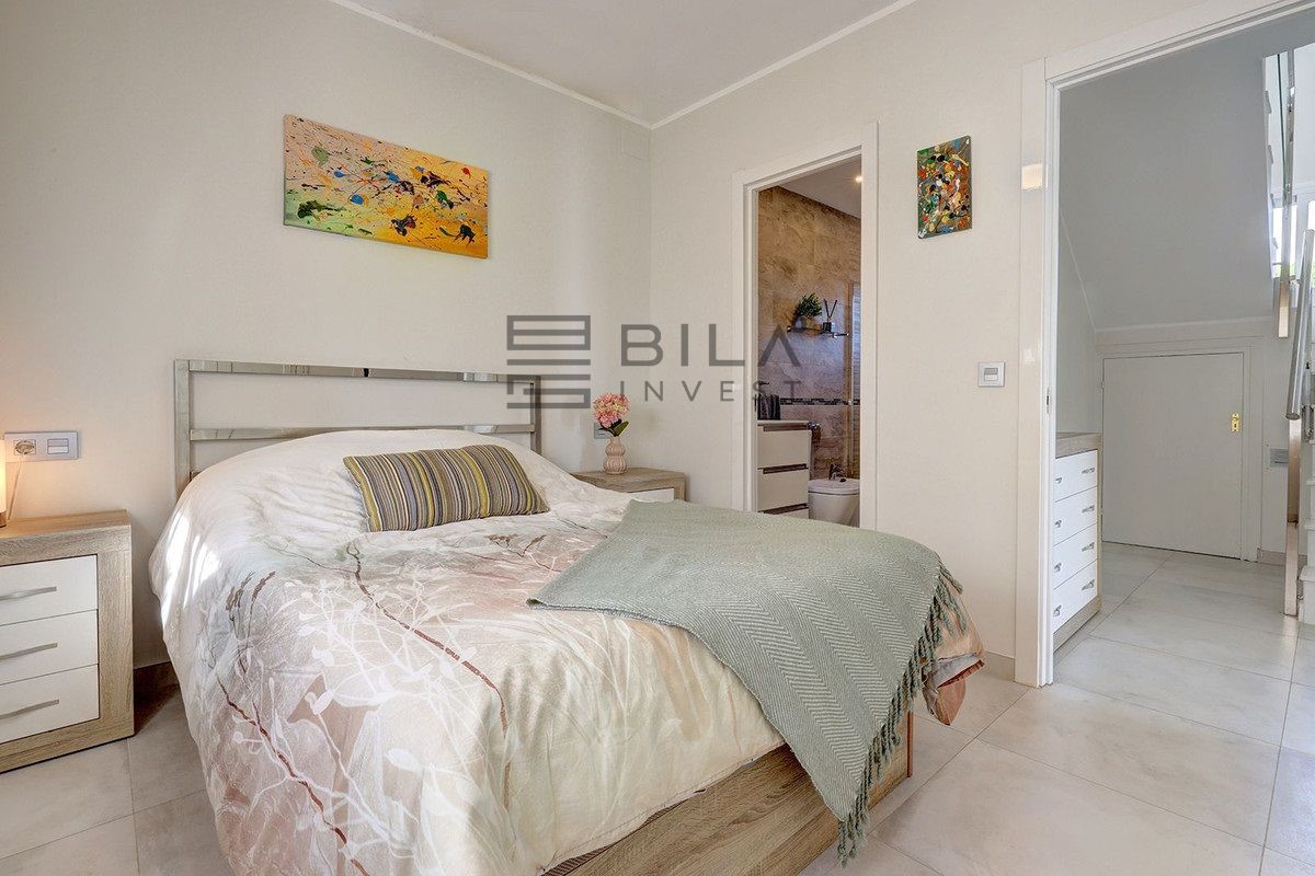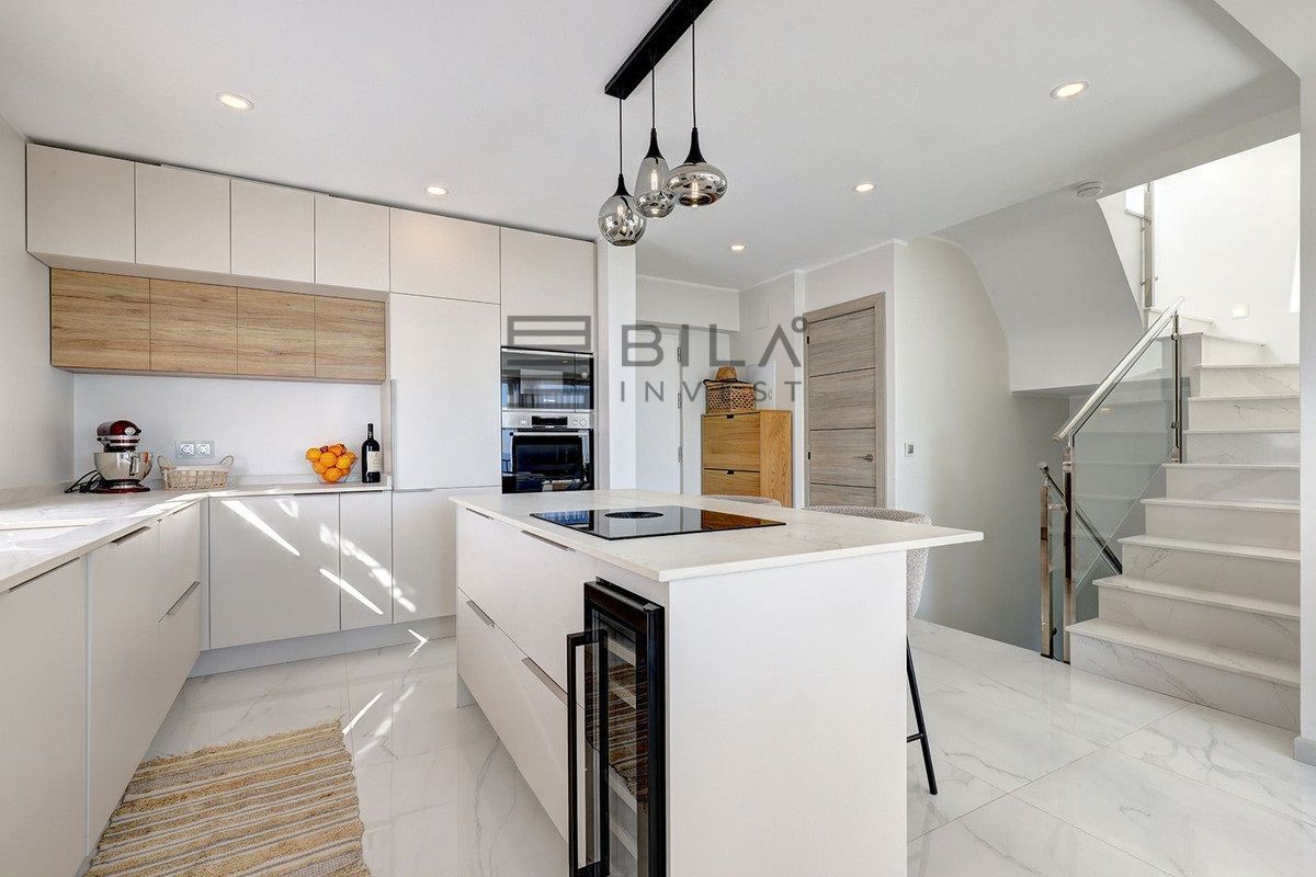Exit to the private garden and pool area. The villa features a beautiful pool area with ample space for sunbathing, plus a barbecue area ideal for entertaining family and friends. For even more spectacular views, head up to the rooftop solarium where you can relax with a refreshing drink while enjoying the beauty of the Mediterranean, a wonderful place to create unforgettable memories.