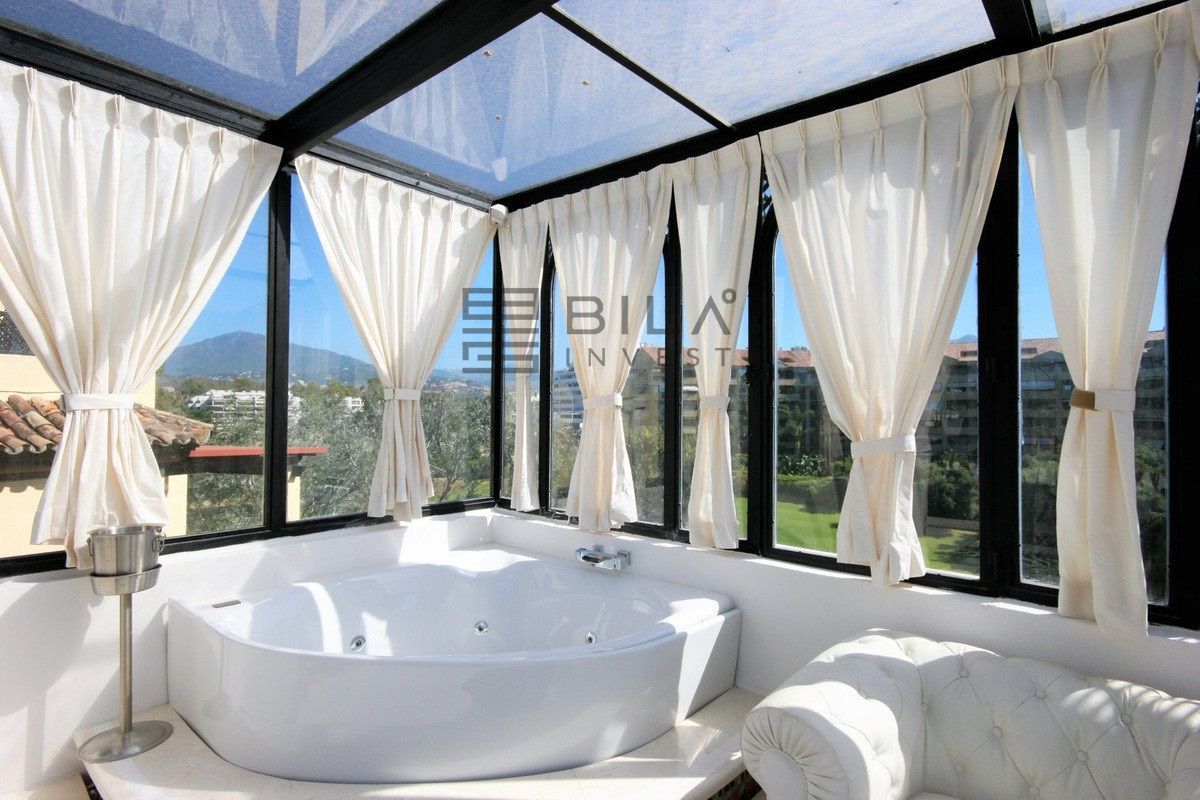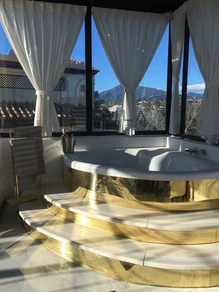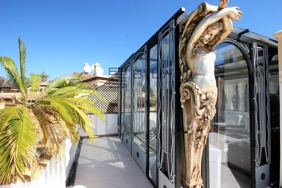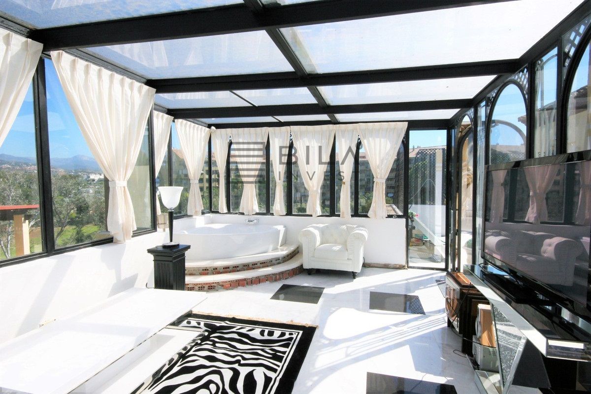 Situated frontline golf in the highly desirable area of Guadalmina Alta lies what is possible the only Art Deco apartment in the whole of Andalucia. This utterly stunning duplex penthouse is located in small quiet complex of apartments away from any road noise and yet just a short distance away from the town of San Pedro and the many restaurants and amenities of Guadalmina. Upon entering the property you immediately get a sense of space and opulence, due to both the distribution and the incredible decor and furnishings throughout the penthouse. On the main level you have an enormous living room with a separate dining area off to the left and a further sitting area off the living room to the right which over looks the Guadalmina golf course. The exquisite furnishings and decor are unique Art Deco pieces from around the world, many of which have great provenance and have come from America via auction houses in Paris, London and Rome. The thought and attention to detail that has gone into this Art Deco property is absolutely outstanding and must been seen first hand to be able to truly appreciate in its entirety. As you would expect, the fully fitted kitchen is in keeping with the rest of the house in terms of both quality and design, and that continues of course through into both the large master suite and the second bedroom with it own adjoining bathroom. A staircase leads from the dining area up to an exquisitely designed conservatory/ bedroom suite with jacuzzi, which again enjoys the amazing views out over the golf course. This in turn leads out onto 65m2 solarium with a Jacuzzi, again all this conforming with the elegant Art Deco style.