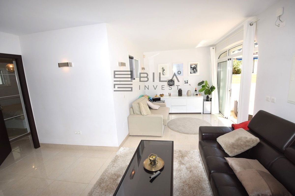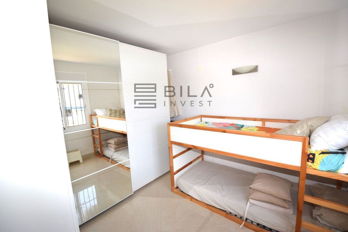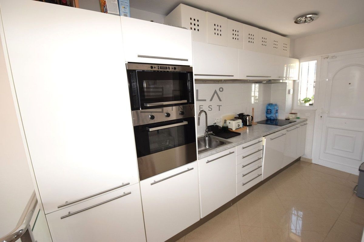 Entry to the property is via a spacious west-facing terrace, perfect for enjoying the afternoon sun in winter. The upper floor features a kitchen, dining room/lounge, two bedrooms, and a bathroom. There is also a terrace off the lounge with fantastic sea views. The ground floor includes a large lounge and TV room, a bedroom, and a bathroom. A further terrace off the lounge provides direct access to the communal gardens and swimming pool.