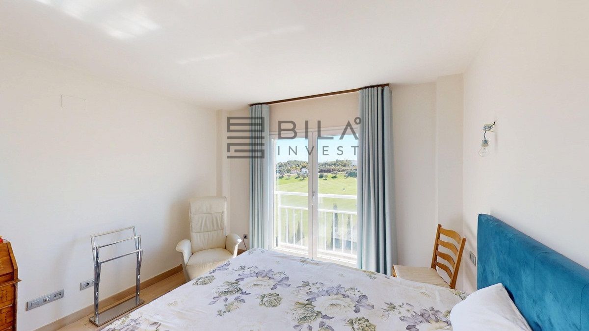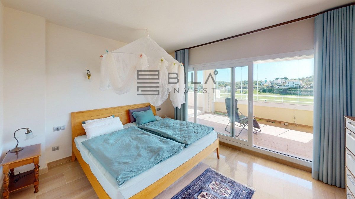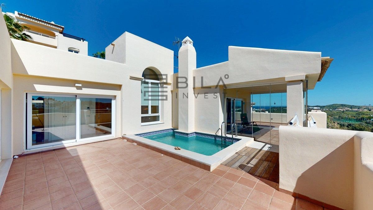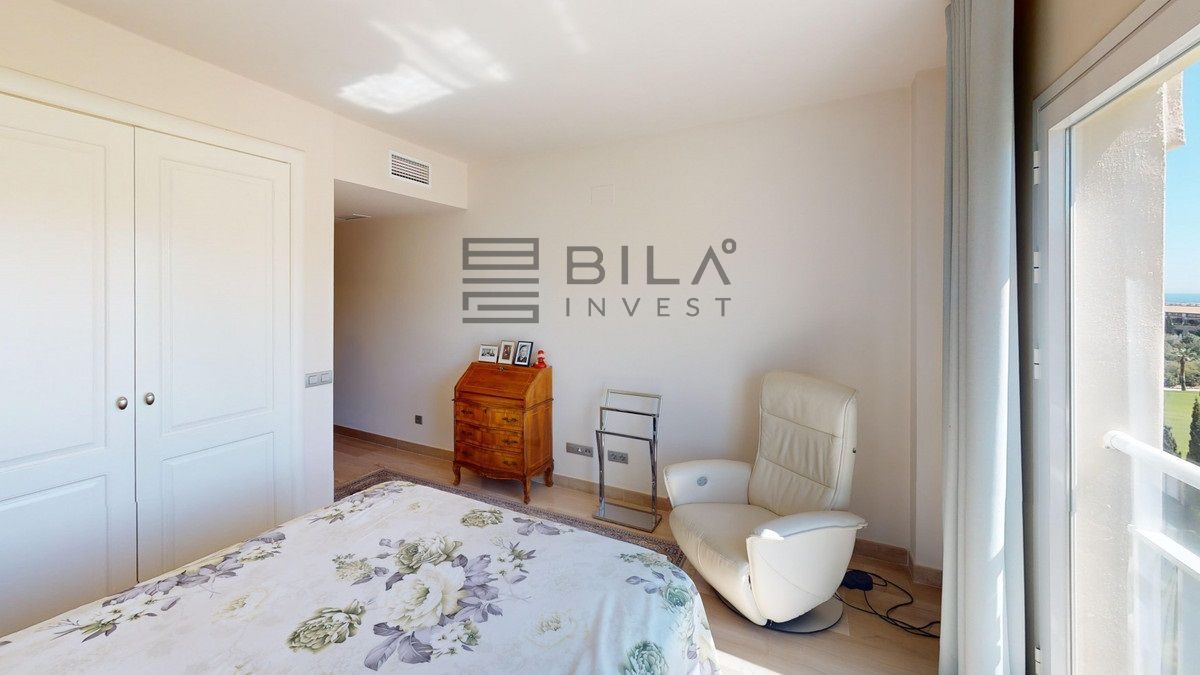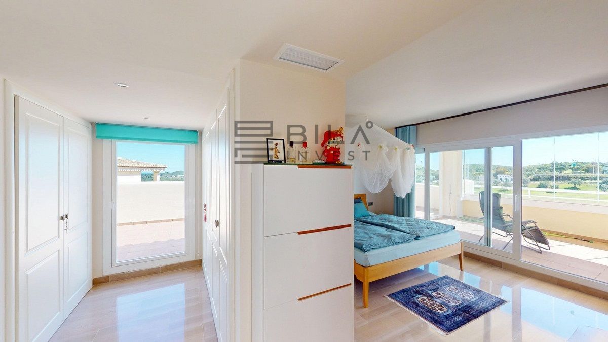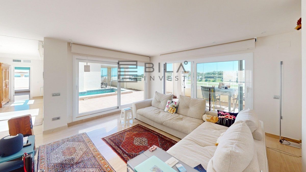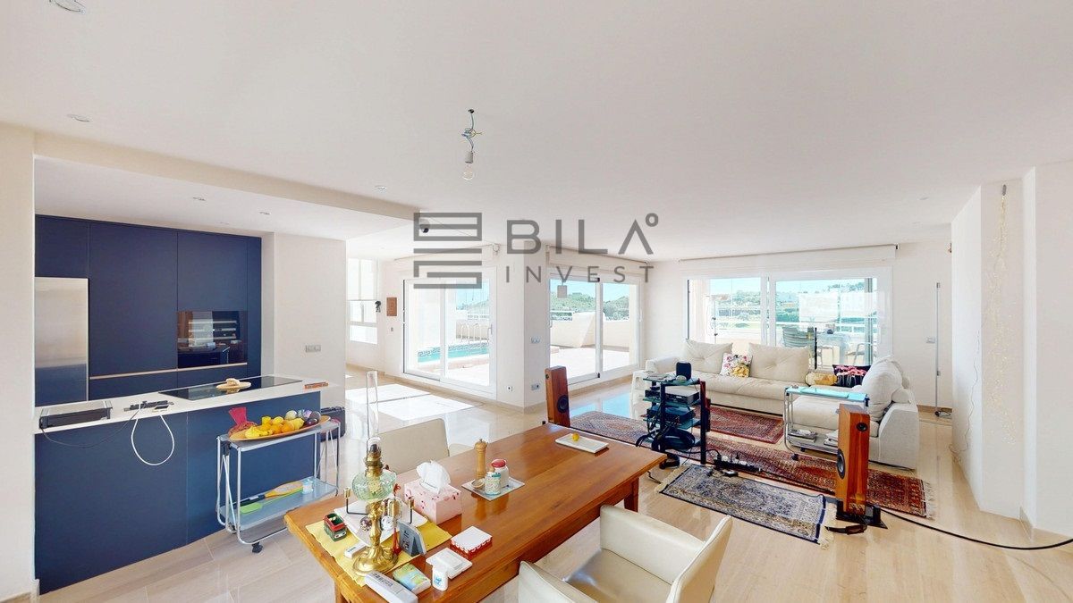 This contemporary penthouse in Mijas, Málaga, offers a harmonious blend of comfort and style. It is located directly on a golf course and offers an impressive view of the sea, so you can enjoy both the tranquillity of the green and the panorama of the coast. The open-plan living area features floor-to-ceiling windows that flood the space with natural light and provide stunning panoramic views of the surrounding landscape. The living room is tastefully furnished with a plush white sectional sofa, accented by vibrant area rugs that add warmth to the polished floors. The sleek kitchen boasts modern navy cabinetry contrasted with white countertops and high-end stainless steel appliances, creating a sophisticated culinary space. The penthouse's three bathrooms are elegantly appointed, with one showcasing a floating double vanity in rich wood tones and a glass-enclosed shower. The primary bedroom is a serene retreat with direct access to a private terrace. It features a canopied bed, a spacious walk-in closet, and a luxurious en-suite bathroom with both a bathtub and a shower. The second bedroom offers equally impressive views and is furnished with a comfortable double bed. A dedicated office space provides a functional work area with a modern desk setup and ample natural light. The crowning feature of this property is the private terrace, complete with a swimming pool and expansive views of the surrounding hills and greenery. Additionally, the penthouse includes two parking spaces and two storage rooms. Residents also have access to excellent communal amenities, including a large swimming pool, a heated pool, and an outdoor kitchen that can be used by everyone. With its thoughtful layout, luxurious amenities, and prime location in Urbanización Cerrado del Águila, this penthouse offers a perfect balance of indoor comfort and outdoor living in the heart of Costa del Sol. We are pleased to be able to present this dream property to you soon, either personally or via virtual viewing. Because this world is unique - just like our Axarquía. In Andalusia. On the Costa del Sol. Here, on the sunny side of life...