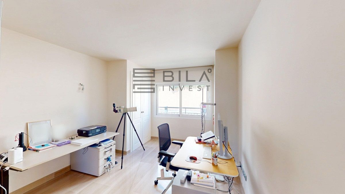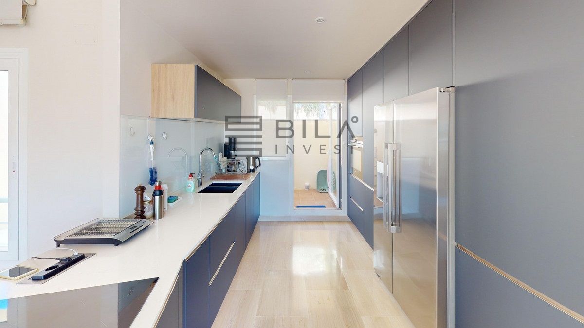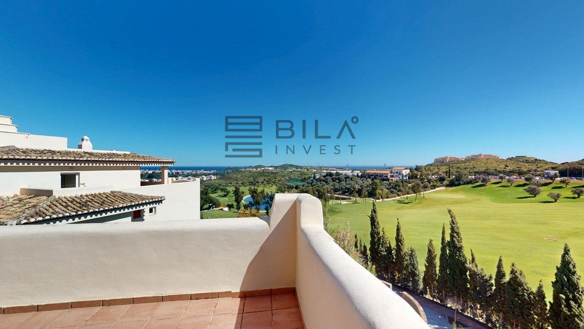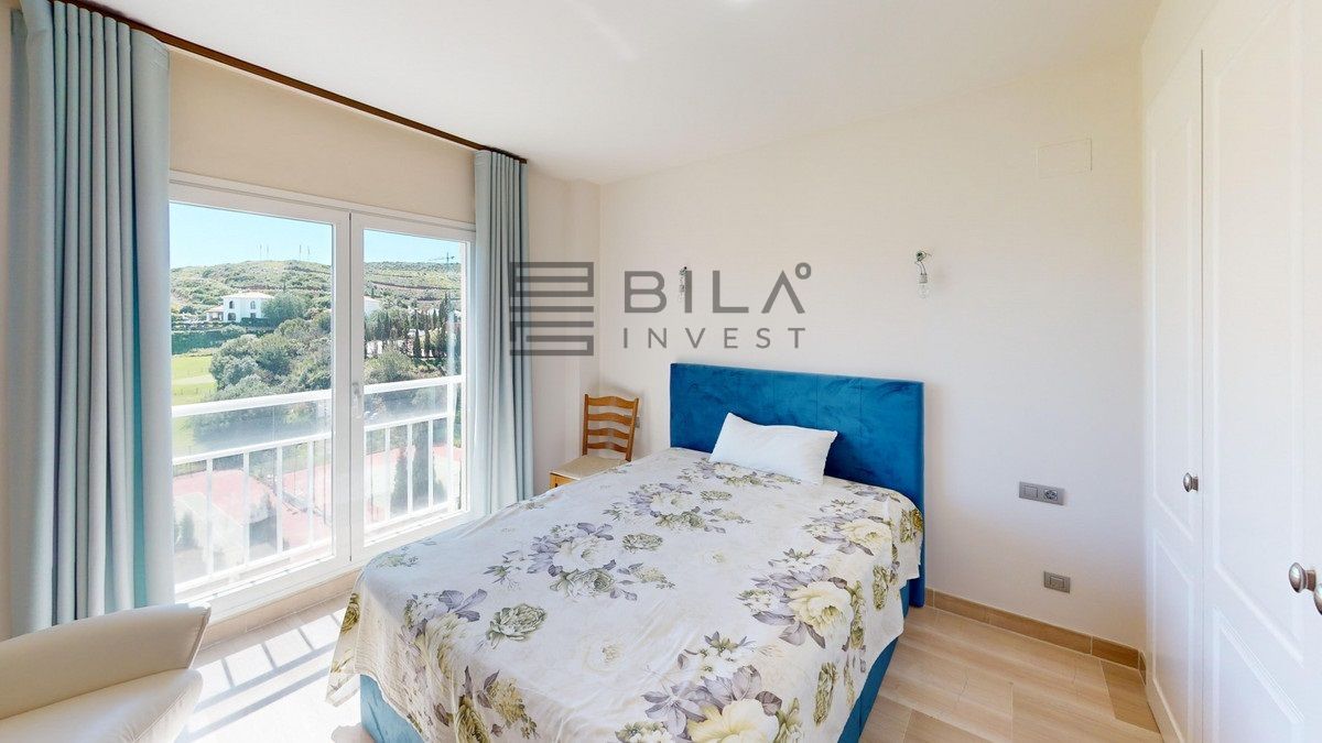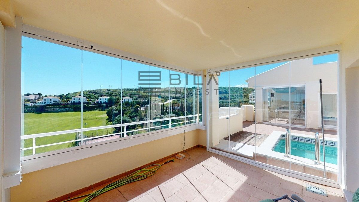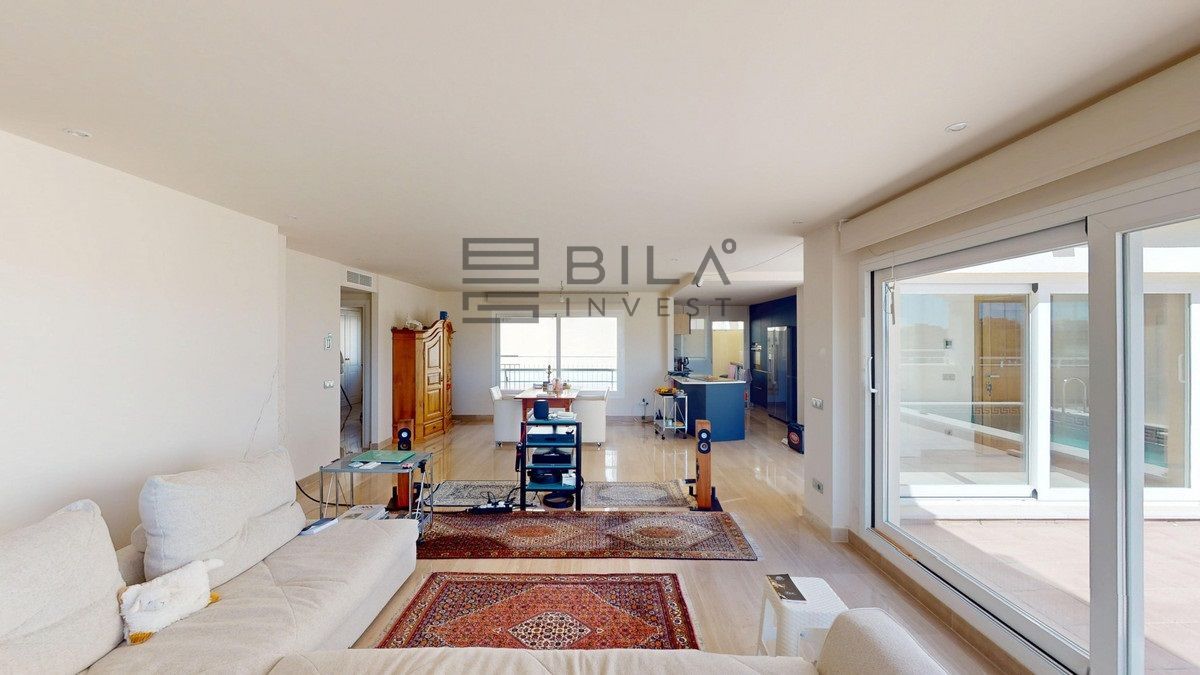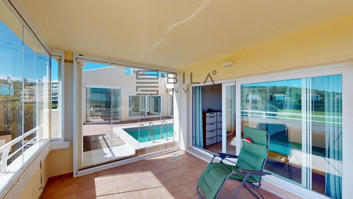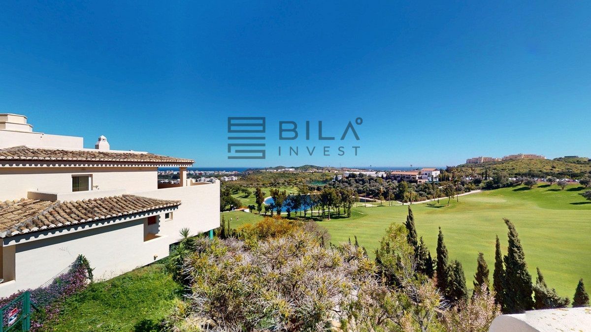 This contemporary penthouse in Mijas, Málaga, offers a harmonious blend of comfort and style. It is located directly on a golf course and offers an impressive view of the sea, so you can enjoy both the tranquillity of the green and the panorama of the coast. The open-plan living area features floor-to-ceiling windows that flood the space with natural light and provide stunning panoramic views of the surrounding landscape. The living room is tastefully furnished with a plush white sectional sofa, accented by vibrant area rugs that add warmth to the polished floors. The sleek kitchen boasts modern navy cabinetry contrasted with white countertops and high-end stainless steel appliances, creating a sophisticated culinary space. The penthouse's three bathrooms are elegantly appointed, with one showcasing a floating double vanity in rich wood tones and a glass-enclosed shower. The primary bedroom is a serene retreat with direct access to a private terrace. It features a canopied bed, a spacious walk-in closet, and a luxurious en-suite bathroom with both a bathtub and a shower. The second bedroom offers equally impressive views and is furnished with a comfortable double bed. A dedicated office space provides a functional work area with a modern desk setup and ample natural light. The crowning feature of this property is the private terrace, complete with a swimming pool and expansive views of the surrounding hills and greenery. Additionally, the penthouse includes two parking spaces and two storage rooms. Residents also have access to excellent communal amenities, including a large swimming pool, a heated pool, and an outdoor kitchen that can be used by everyone. With its thoughtful layout, luxurious amenities, and prime location in Urbanización Cerrado del Águila, this penthouse offers a perfect balance of indoor comfort and outdoor living in the heart of Costa del Sol. We are pleased to be able to present this dream property to you soon, either personally or via virtual viewing. Because this world is unique - just like our Axarquía. In Andalusia. On the Costa del Sol. Here, on the sunny side of life...
