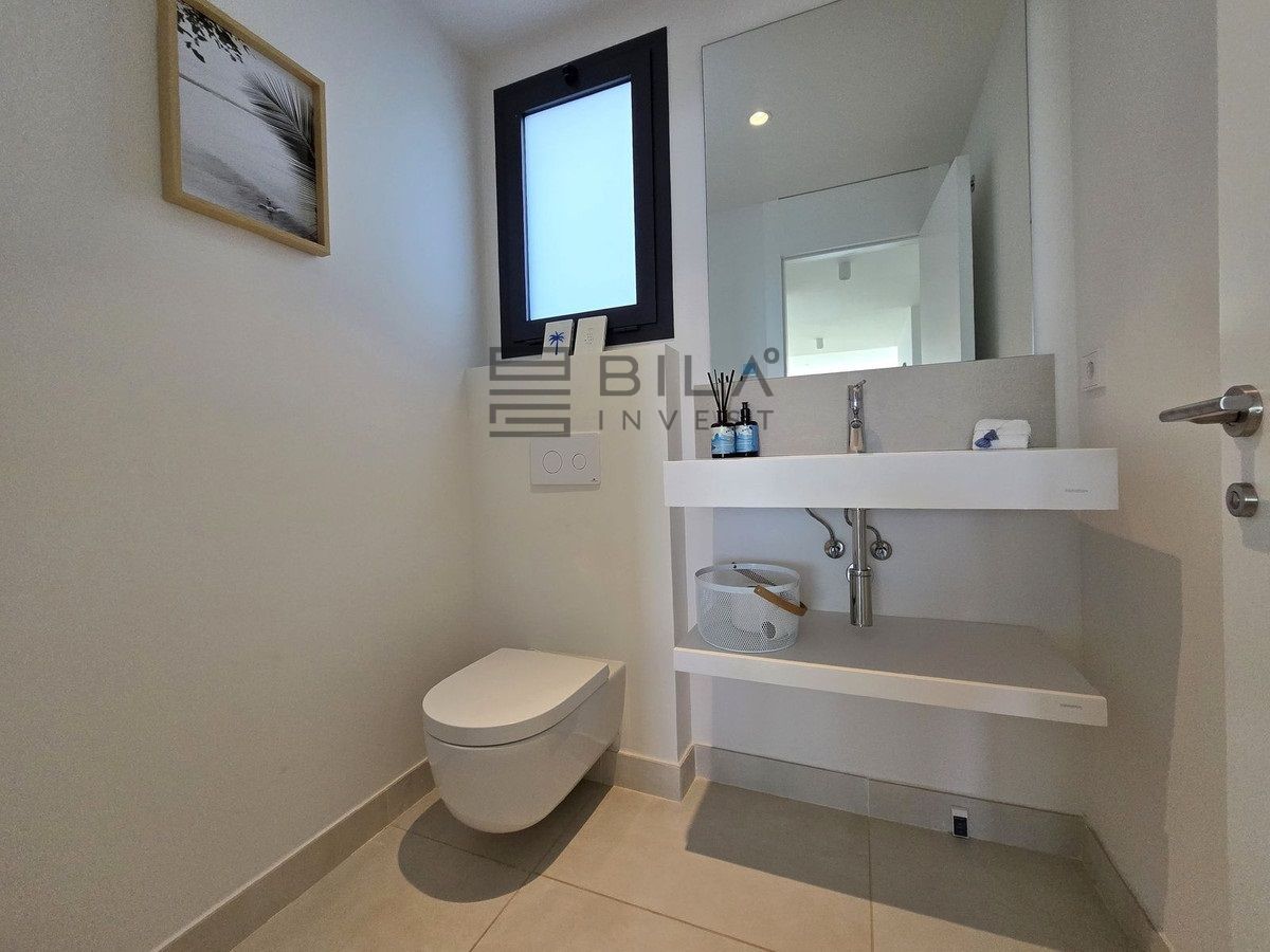 The kitchen is fully equipped with high-end appliances including some expensive extras such as a wine cooler. The master bedroom features a private luxury en-suite bathroom, walk-in closet, and access to the terrace. Two further bedrooms sharing a spacious bathroom are just perfect for family or guest. Guest toilet. Situated on a corner it provides total privacy.