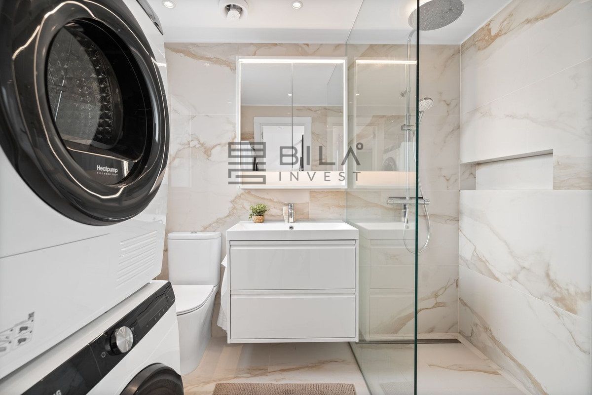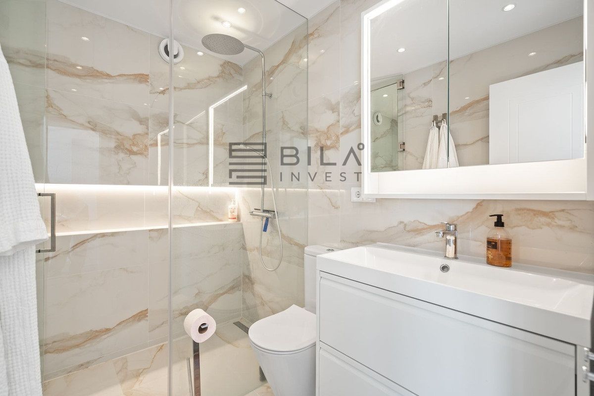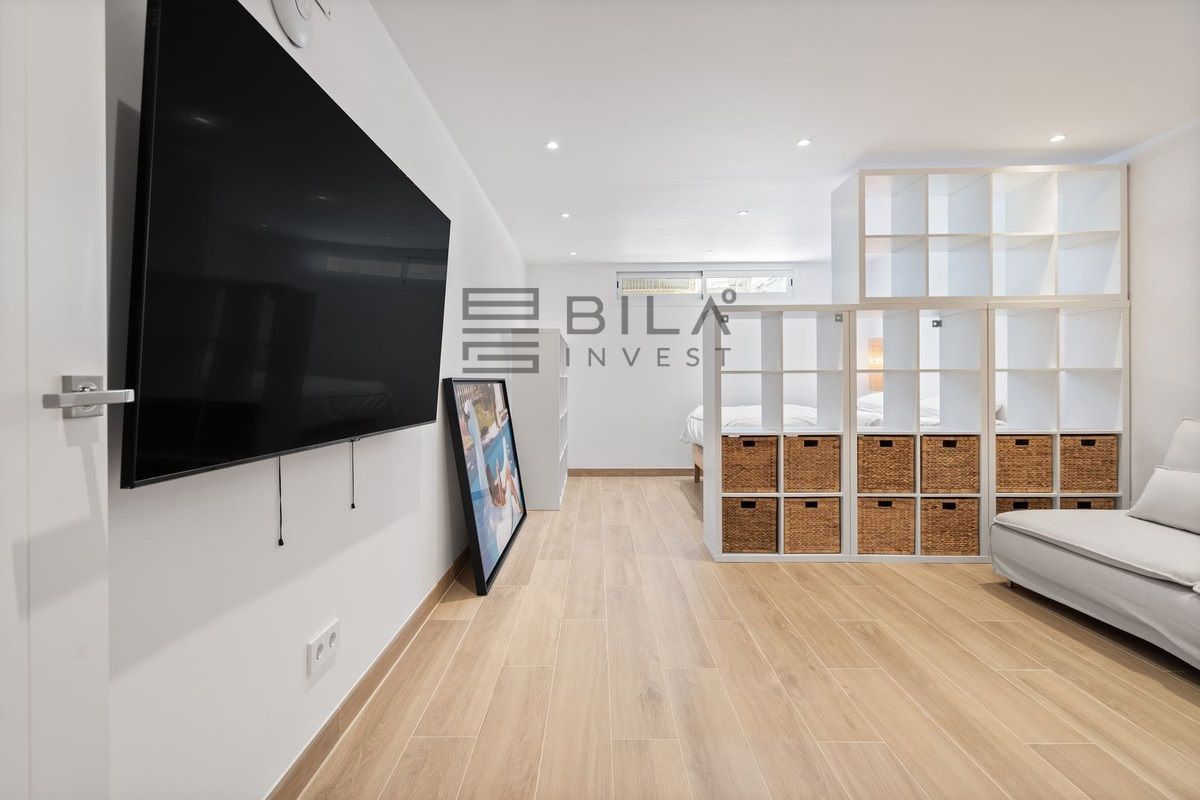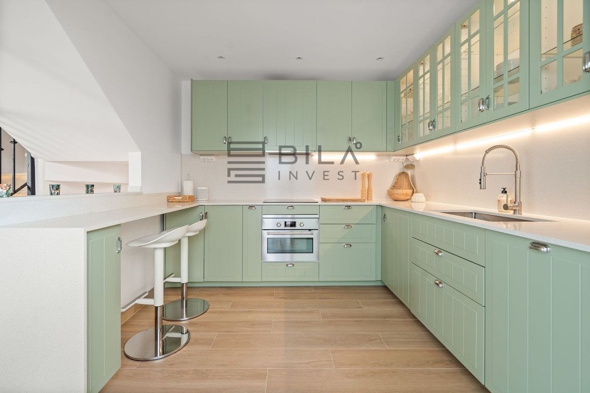 On the main floor, natural light fills the spacious living and dining area, which opens onto a lovely private terrace/garden of 34 m² – a perfect outdoor space to enjoy the Mediterranean climate. The independent new built kitchen has direct access to the living and dining room, a stylish bathroom with shower and laundry.