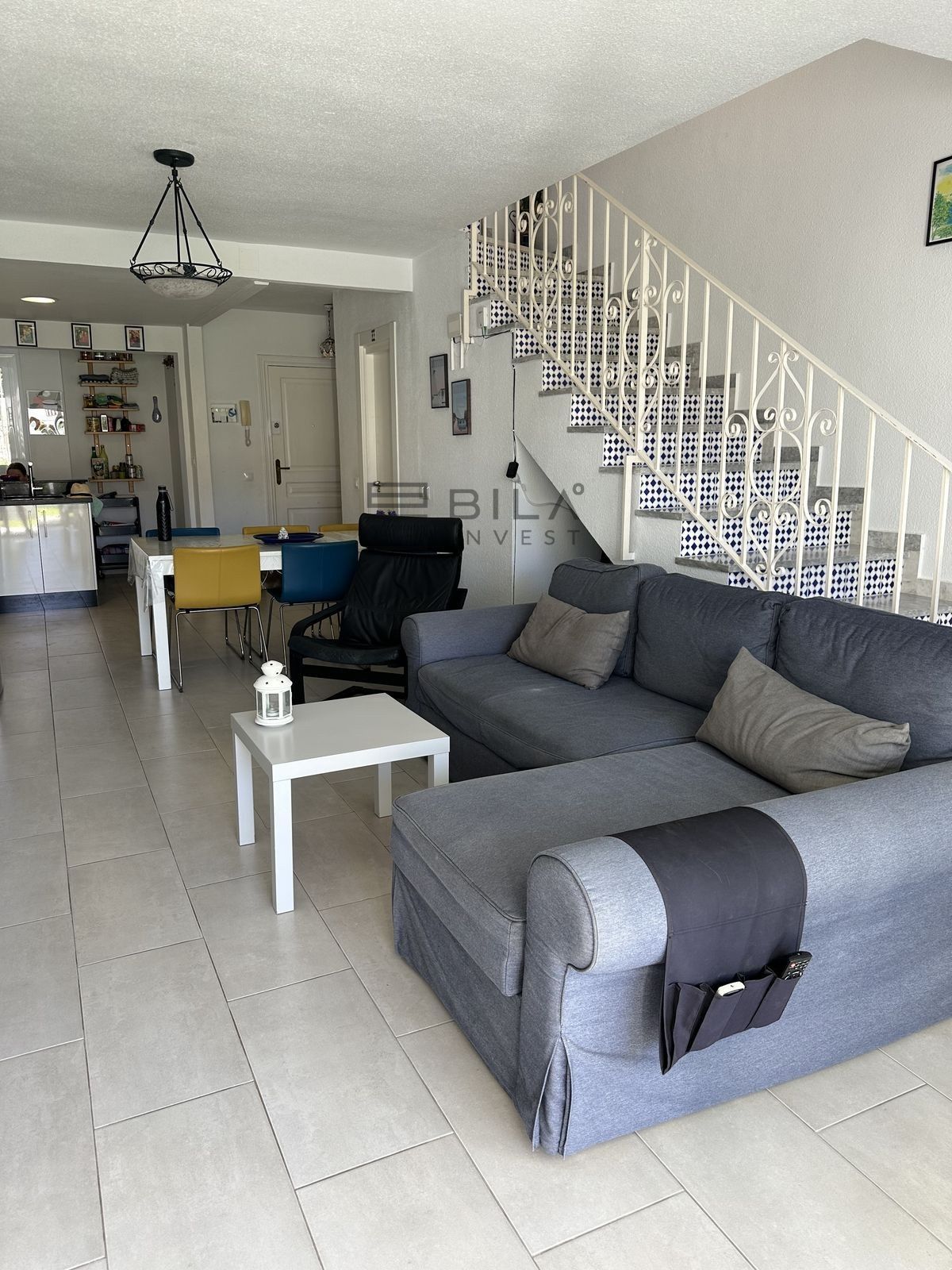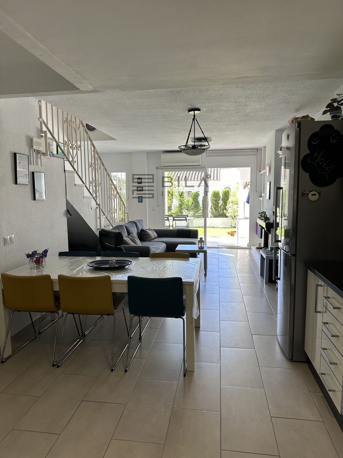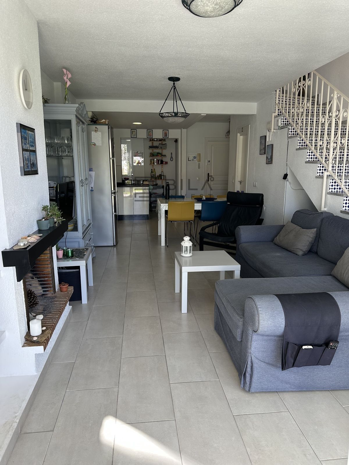 On the ground floor, you enter through a private front door into a small hallway that opens into a bright open-plan space. The kitchen has been opened up and flows seamlessly into the living and dining area, creating a spacious and airy layout. The living room features a fireplace, under-stair storage, and access to an enclosed terrace which in turn opens onto a smaller south-facing terrace. A guest WC with wash basin is also located on this level.