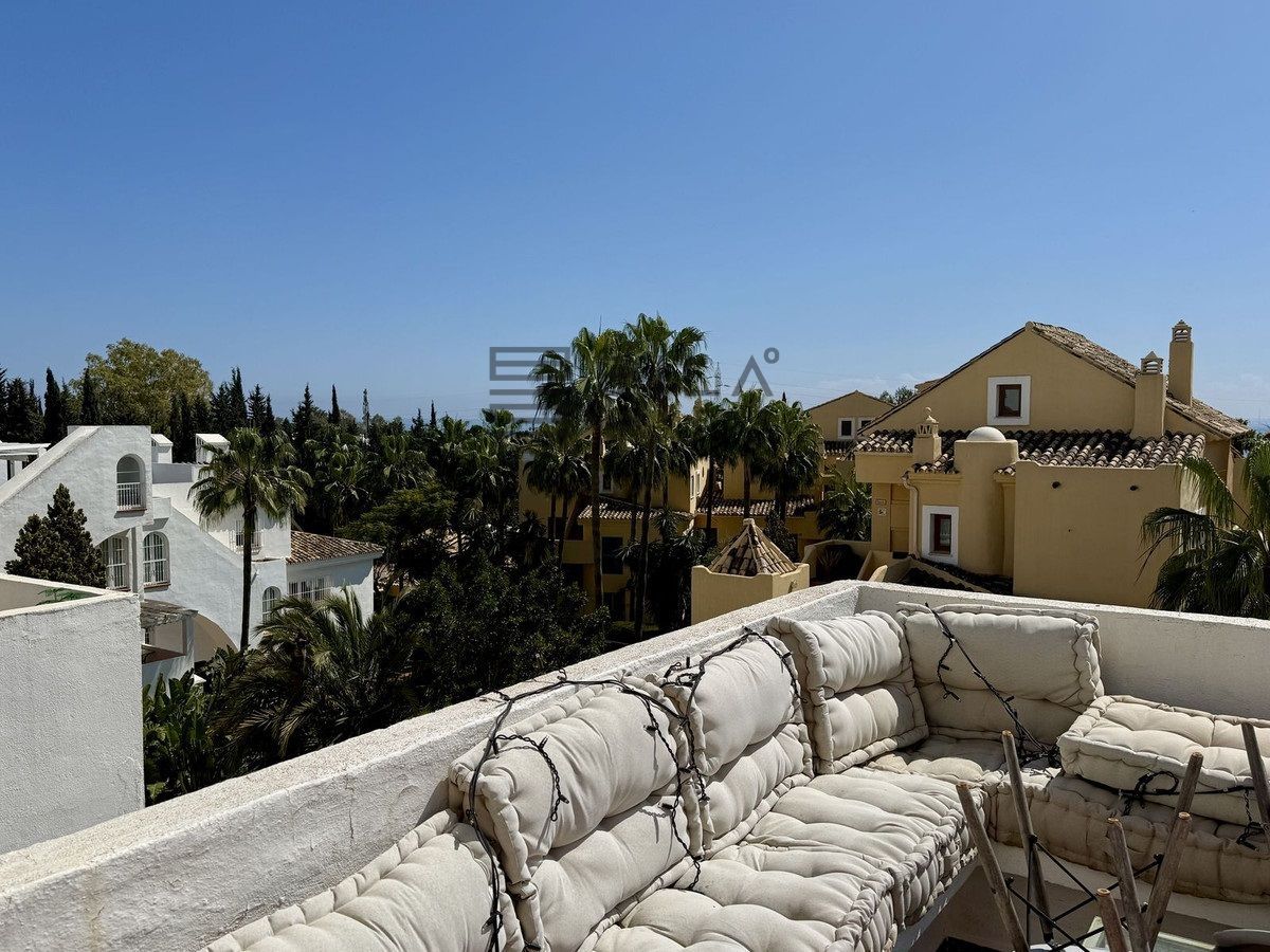 Apartamento dúplex con terrazas orientadas al sur, solárium, plaza de aparcamiento y trastero en Rocamar, Nagüeles, Marbella. Precio de venta rápida: solo 465 000 €.