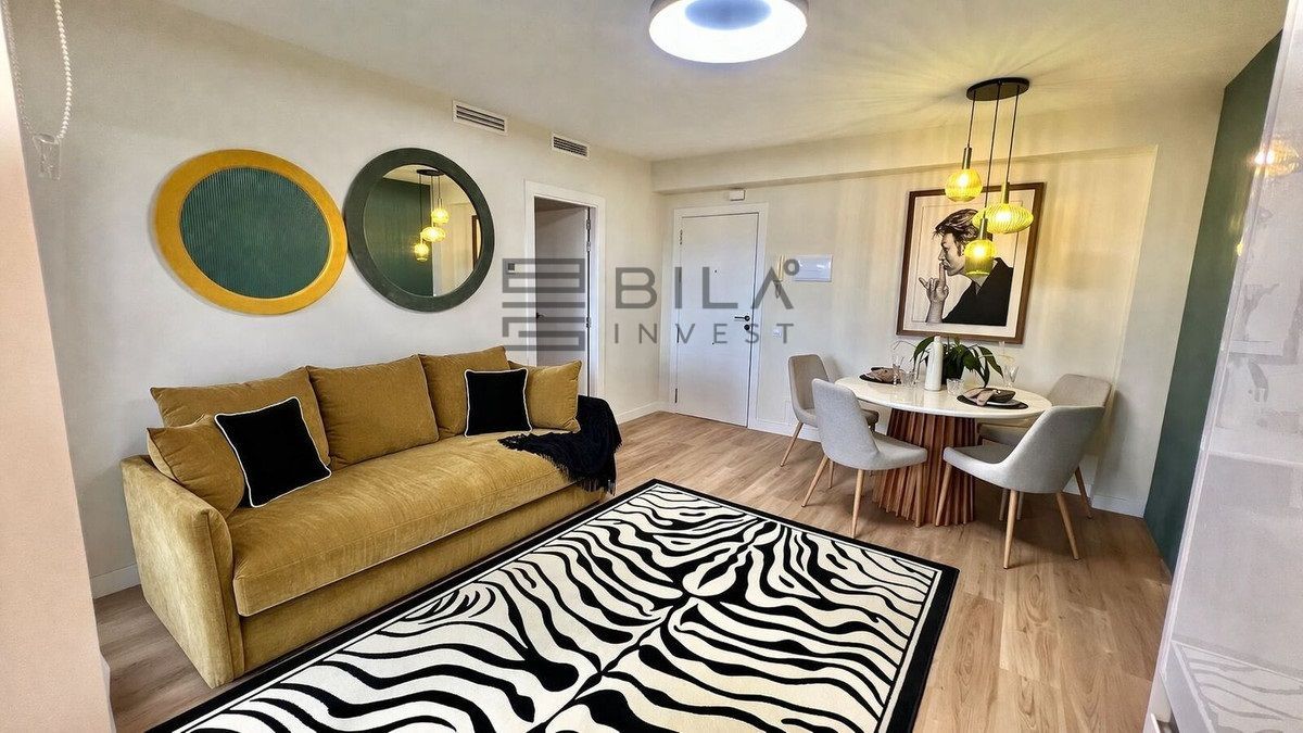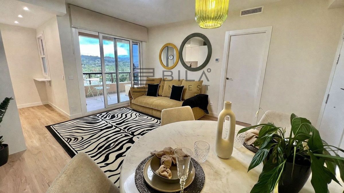Se entrega totalmente amueblada con mobiliario de primeras marcas y una decoración moderna y sofisticada. Dispone de suelo radiante, aire acondicionado nuevo marca Toshiba, y un luminoso salón con acceso a una agradable terraza. Destacan sus cortinas de última generación, combinando visillos y opacas para un perfecto control de luz y privacidad.