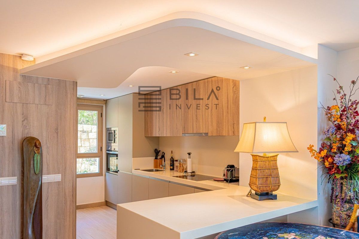 Originalmente diseñada con tres dormitorios, la propiedad ha sido cuidadosamente redistribuida para convertirse en una elegante residencia con dos amplios dormitorios en suite y un aseo de cortesía. La luminosa zona de salón-comedor de concepto abierto se integra a la perfección con una cocina moderna totalmente equipada y una soleada terraza.