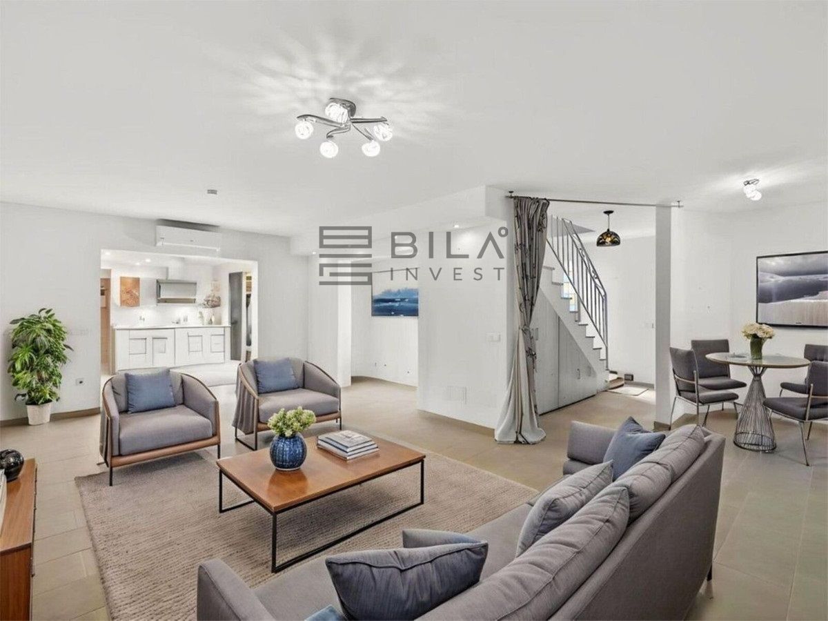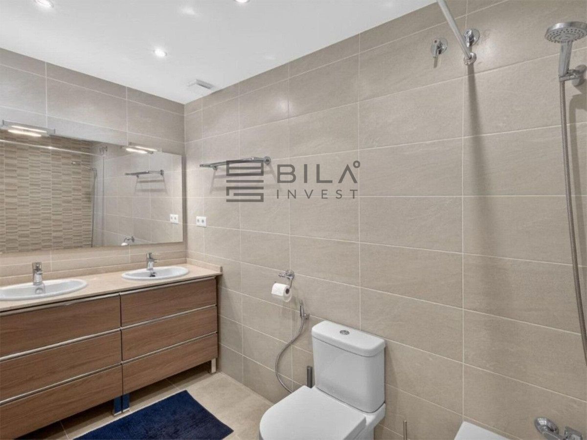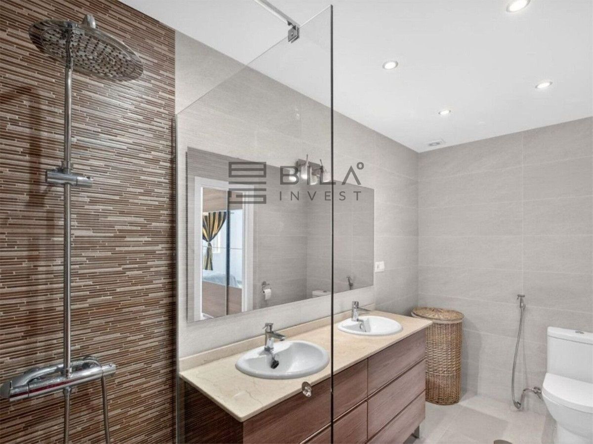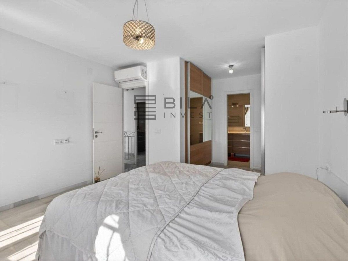 En la primera planta hay dos dormitorios amplios con armarios empotrados y dos baños, uno en suite. La planta superior ofrece una estancia adicional ideal como despacho o dormitorio de invitados, con salida a una terraza de 15 m² con vistas al mar.