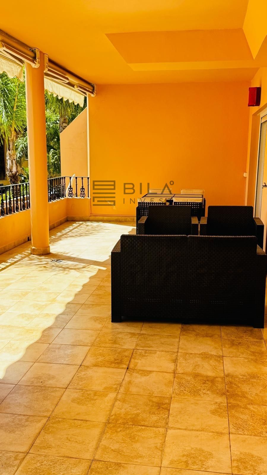 El salón, comedor, cocina y ambos dormitorios tienen acceso directo a una amplia terraza orientada al sur, con bonitas vistas a zonas verdes, una de las piscinas y vistas parciales al mar.