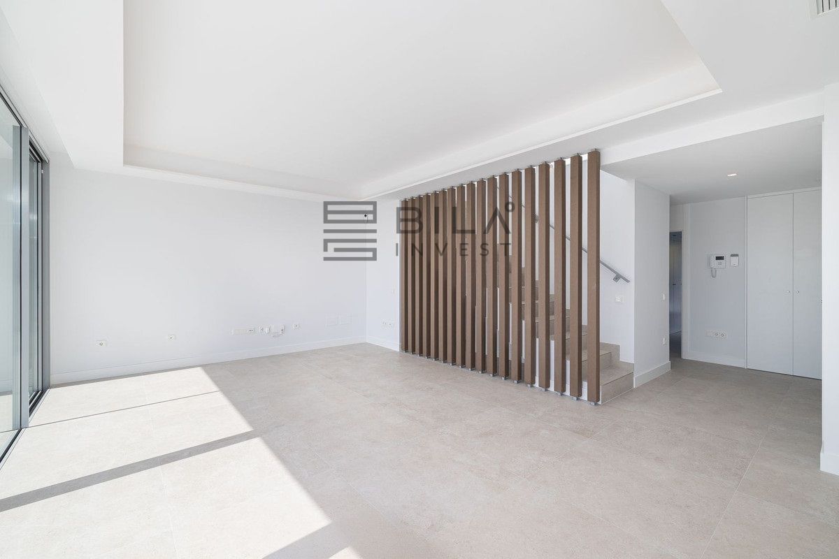El ático en sí está cuidadosamente diseñado en dos niveles, ofreciendo una distribución altamente funcional y cómoda. El nivel de entrada cuenta con una luminosa zona de estar de concepto abierto con ventanas de suelo a techo que inundan el espacio de luz natural y conectan de manera fluida la vida interior con la exterior. Tres amplios dormitorios, cada uno con su propio baño en suite, proporcionan privacidad y confort, complementados por un aseo de invitados.