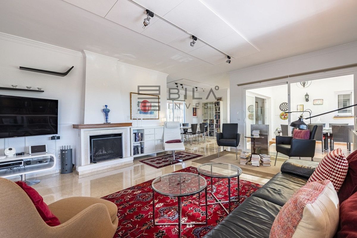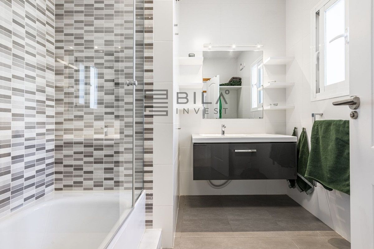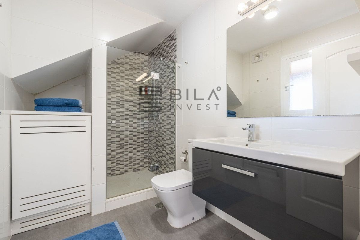 La villa ofrece cuatro amplios dormitorios, incluyendo una suite principal con baño privado. En total, cuenta con tres baños completos más un aseo de invitados en la entrada. La cocina, luminosa y acogedora, conecta directamente con la amplia terraza y el jardín, mientras que el salón impresiona por sus generosos espacios y grandes ventanales que inundan la estancia de luz natural.